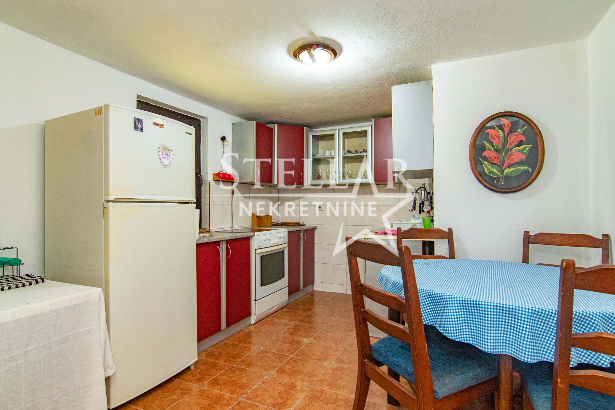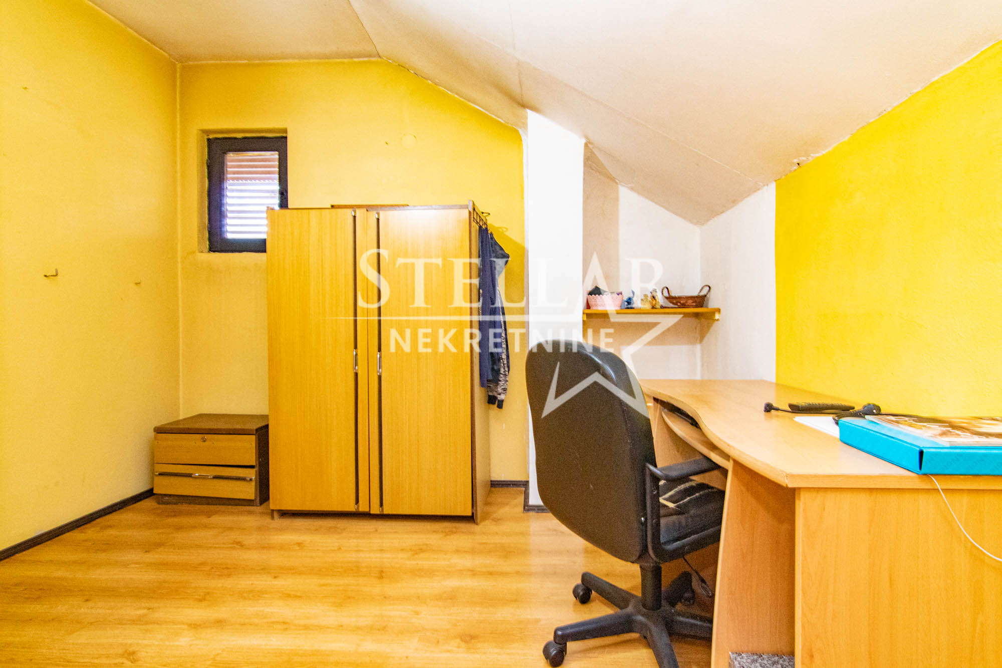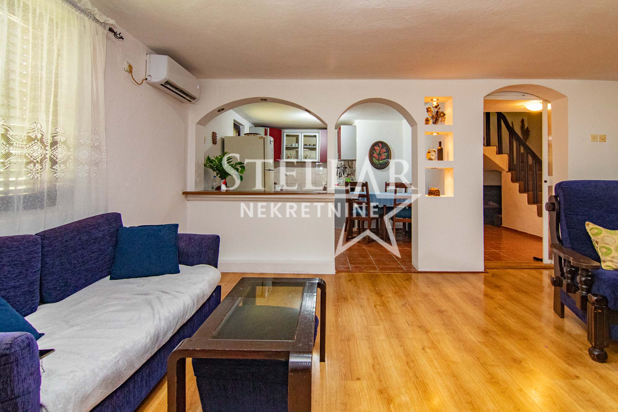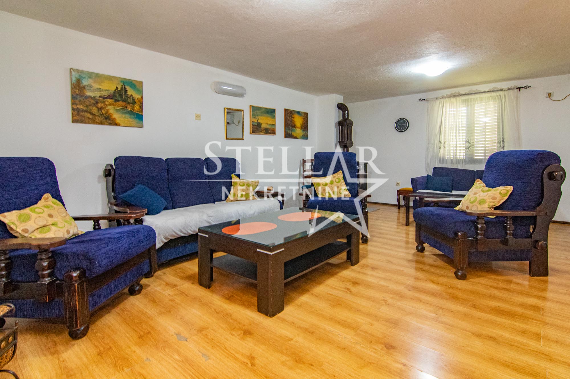 Furnished house for rent in Donja Gorica, 5-7 minutes drive from Siti Kvart. In a very quiet and pleasant neighborhood, in a fenced yard of 545m2, house 100m2, ground floor and first floor. 2 parking spaces in a fenced area with a gate, 2 parking spaces outside the fence. The furniture is older, but of good quality and functional. The ground floor has a large living room, kitchen, dining room, hallway, toilet, air conditioning and a wood stove that heats the entire house, TV. Upstairs there is a hallway, 2 bedrooms with the possibility of a 3rd bedroom. One room has a double bed, the second a single bed, and the third serves as a study and has a pull-out sofa, but the owner would add a bed if necessary. It also has a bathroom with a washing machine and bathtub, a wardrobe, strong air conditioning that can cool the entire floor. There is a TV in one bedroom. Internet is connected. Around the house there is a yard, lawn, storage room, trees.