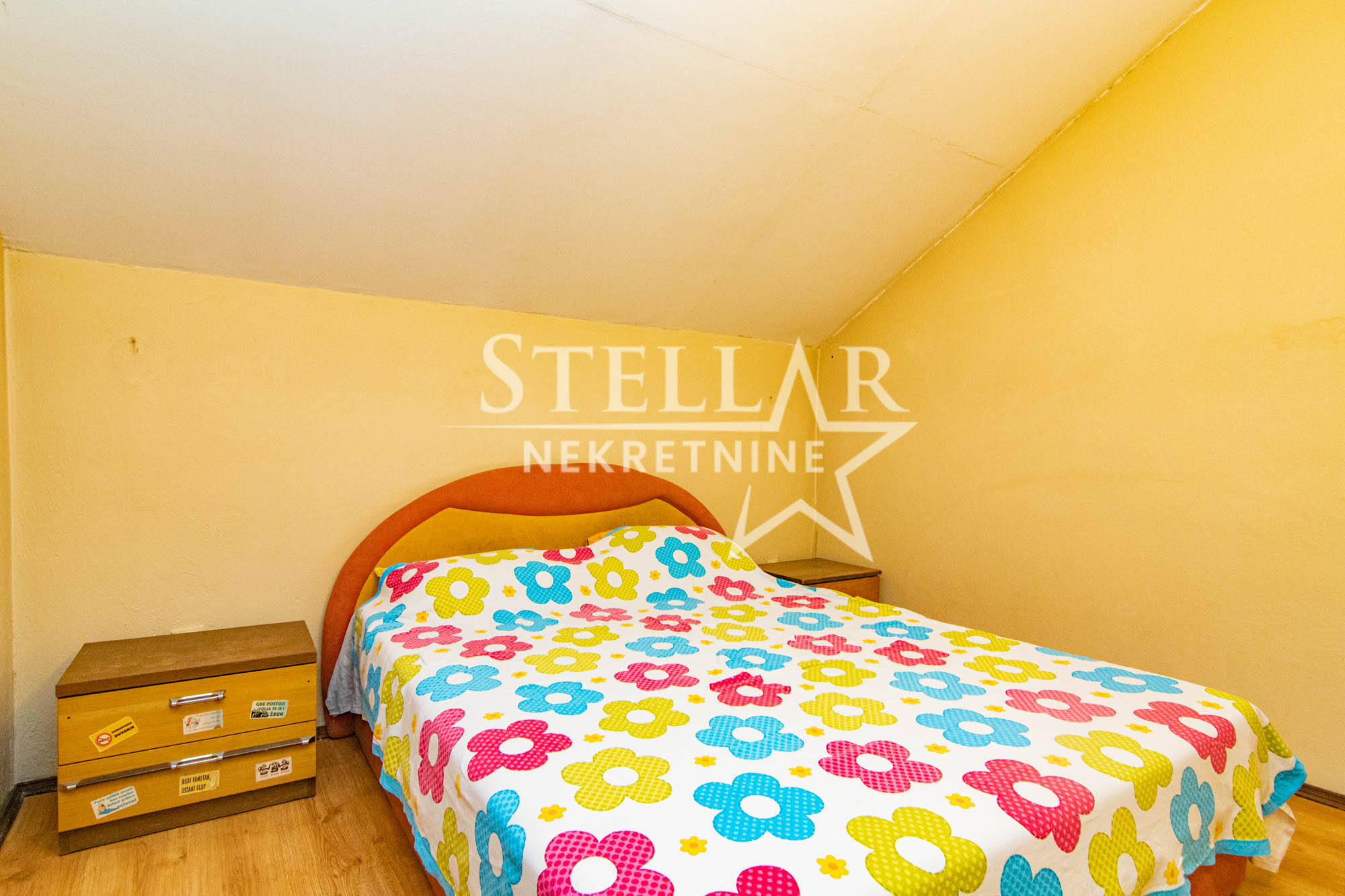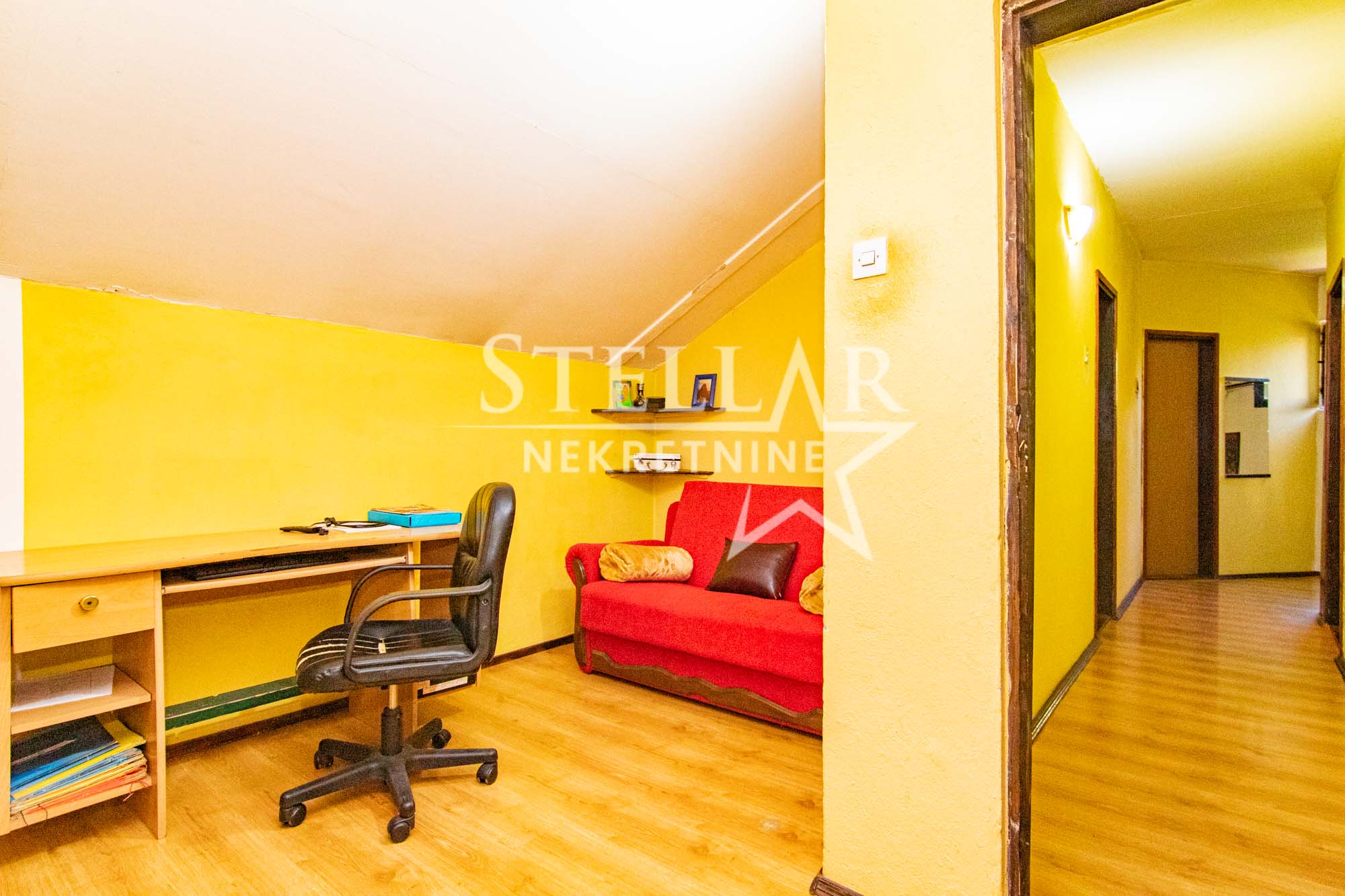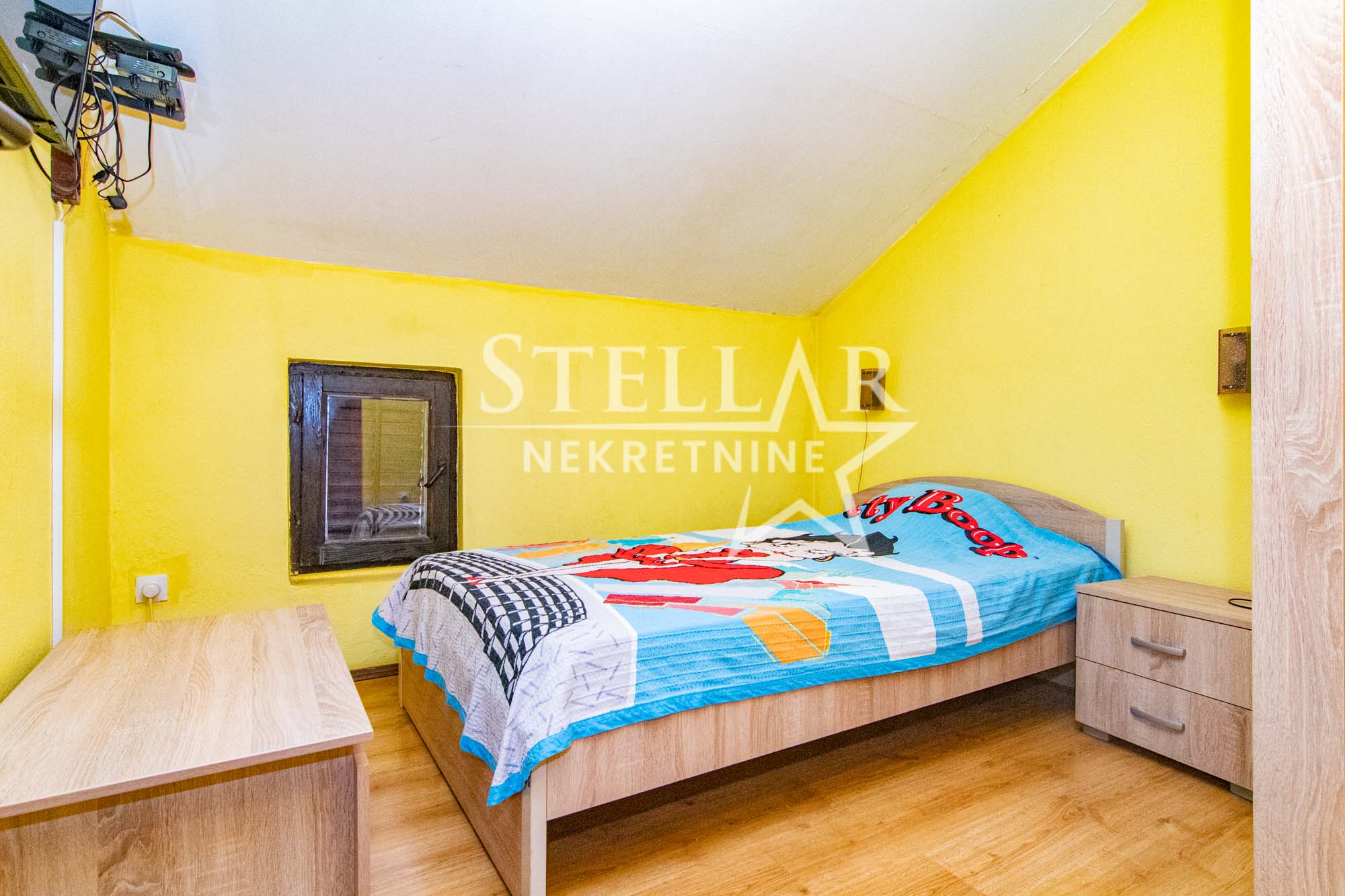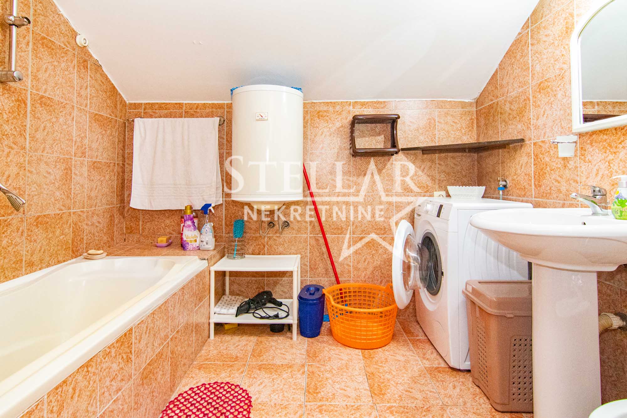 Furnished house for rent in Donja Gorica, 5-7 minutes drive from Siti Kvart. In a very quiet and pleasant neighborhood, in a fenced yard of 545m2, house 100m2, ground floor and first floor. 2 parking spaces in a fenced area with a gate, 2 parking spaces outside the fence. The furniture is older, but of good quality and functional. The ground floor has a large living room, kitchen, dining room, hallway, toilet, air conditioning and a wood stove that heats the entire house, TV. Upstairs there is a hallway, 2 bedrooms with the possibility of a 3rd bedroom. One room has a double bed, the second a single bed, and the third serves as a study and has a pull-out sofa, but the owner would add a bed if necessary. It also has a bathroom with a washing machine and bathtub, a wardrobe, strong air conditioning that can cool the entire floor. There is a TV in one bedroom. Internet is connected. Around the house there is a yard, lawn, storage room, trees.