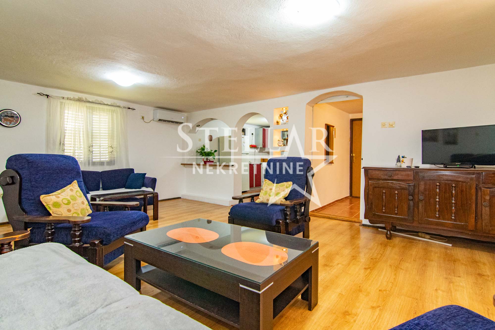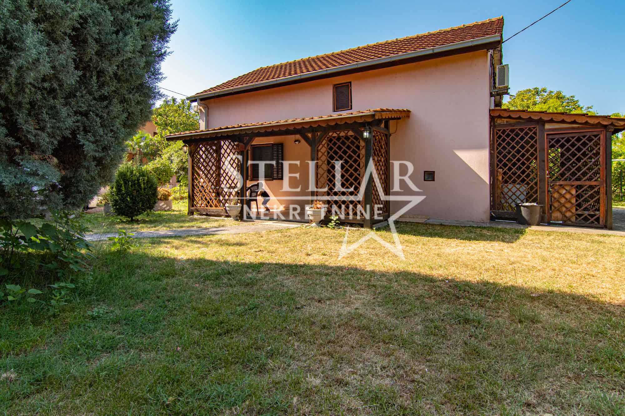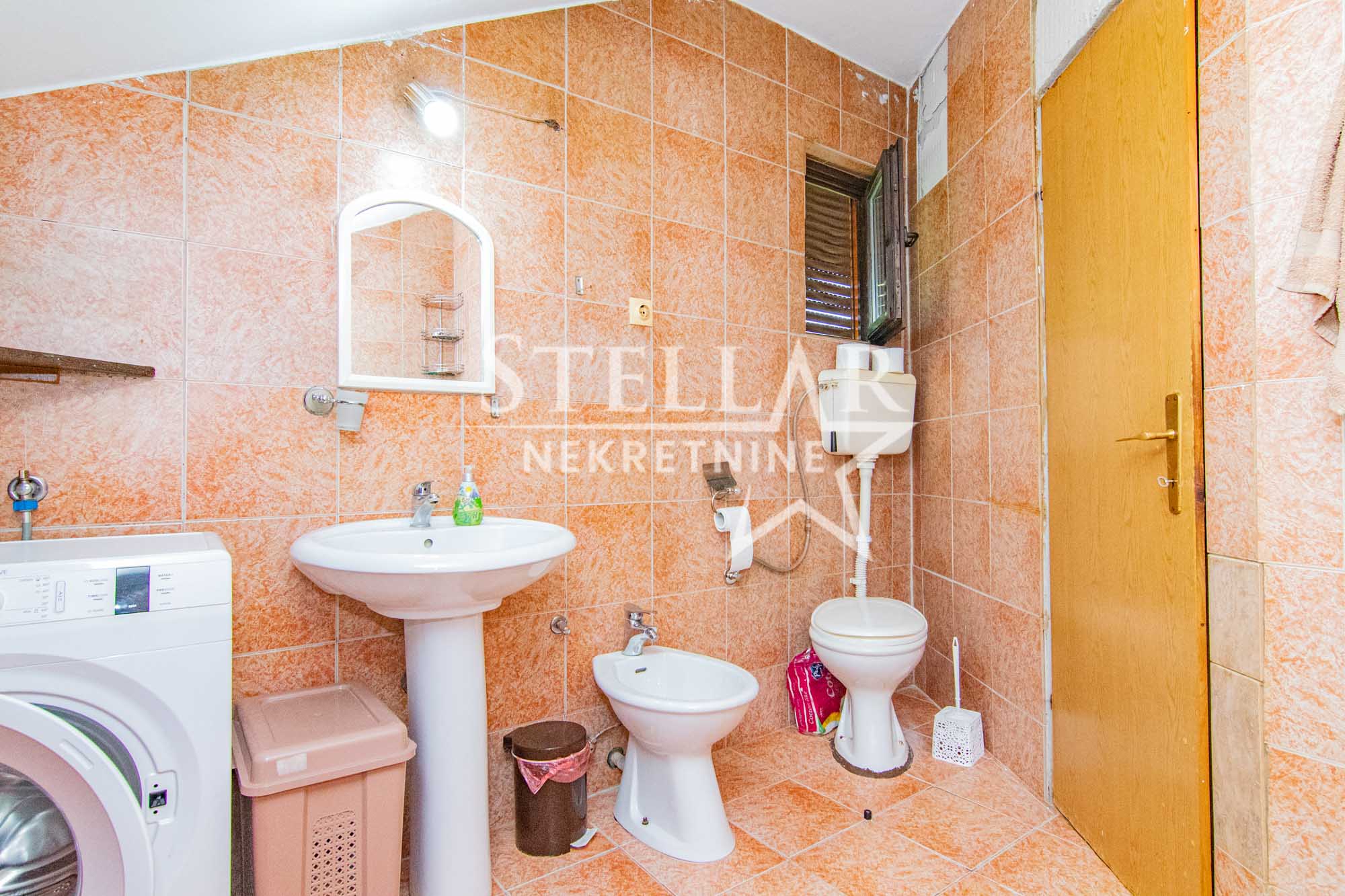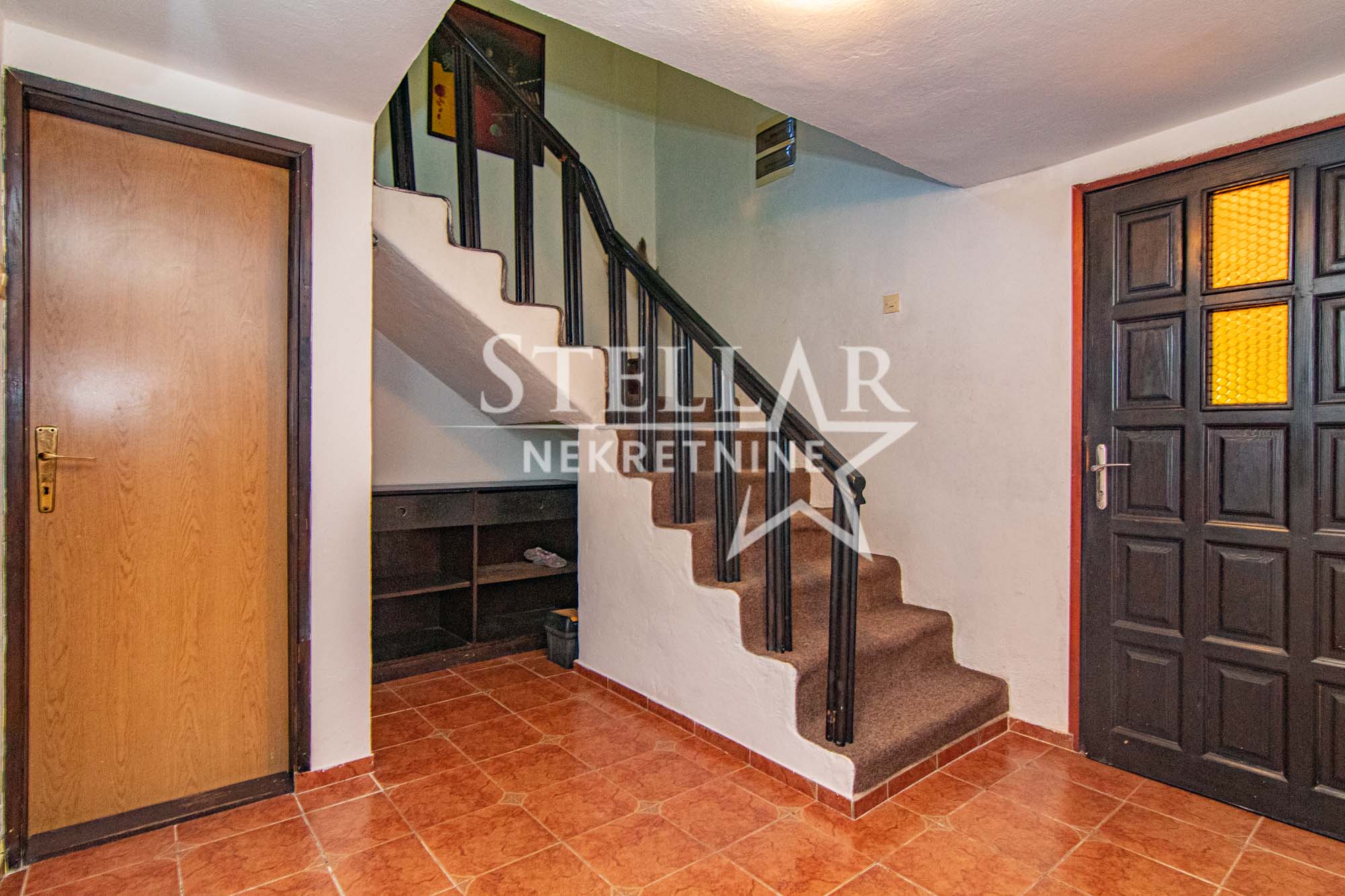 Furnished house for rent in Donja Gorica, 5-7 minutes drive from Siti Kvart. In a very quiet and pleasant neighborhood, in a fenced yard of 545m2, house 100m2, ground floor and first floor. 2 parking spaces in a fenced area with a gate, 2 parking spaces outside the fence. The furniture is older, but of good quality and functional. The ground floor has a large living room, kitchen, dining room, hallway, toilet, air conditioning and a wood stove that heats the entire house, TV. Upstairs there is a hallway, 2 bedrooms with the possibility of a 3rd bedroom. One room has a double bed, the second a single bed, and the third serves as a study and has a pull-out sofa, but the owner would add a bed if necessary. It also has a bathroom with a washing machine and bathtub, a wardrobe, strong air conditioning that can cool the entire floor. There is a TV in one bedroom. Internet is connected. Around the house there is a yard, lawn, storage room, trees.