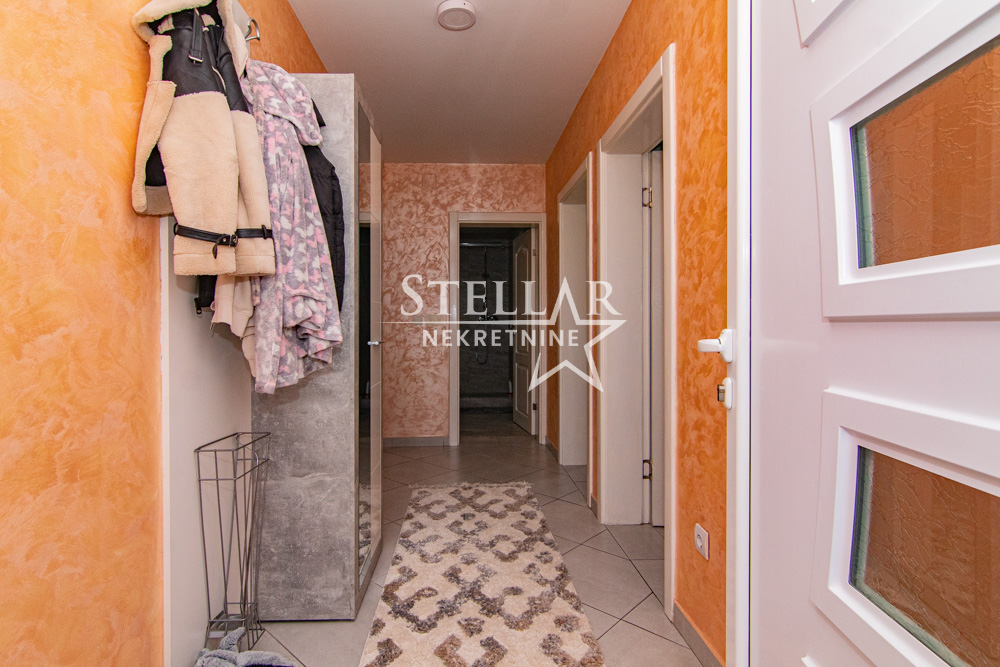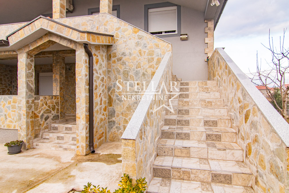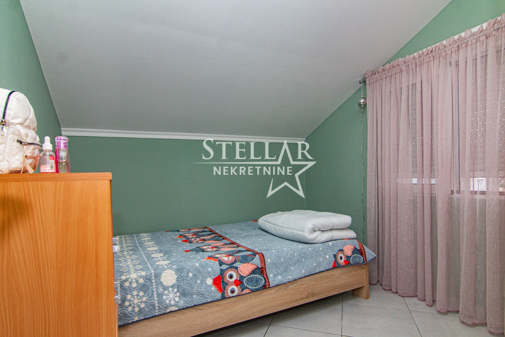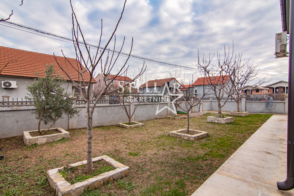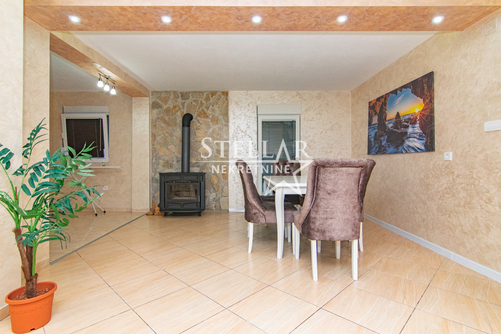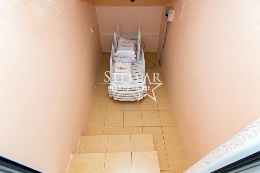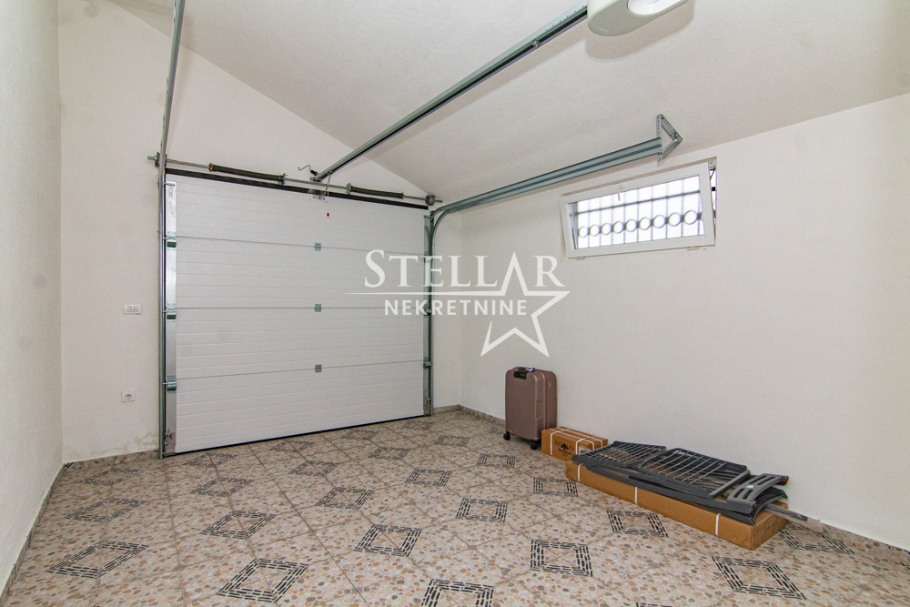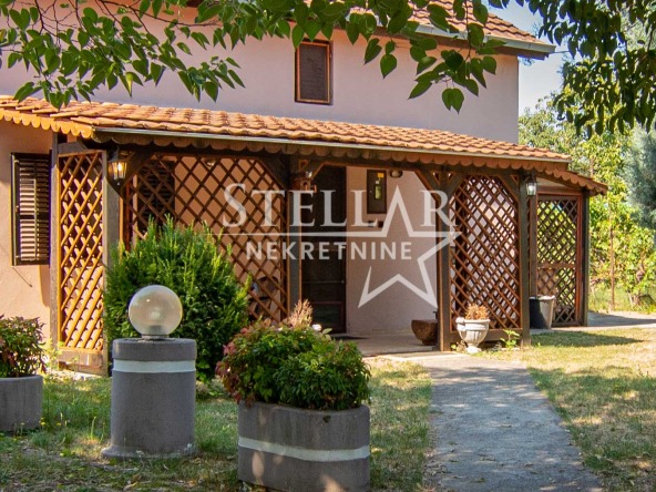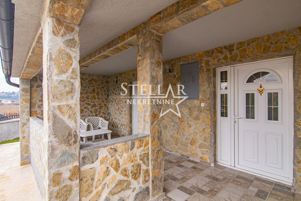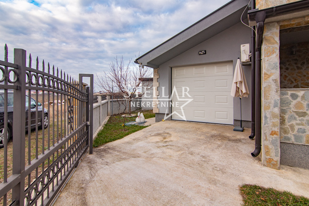 The house is furnished and can be sold with or without furniture. It is divided into two almost identical floors. On both floors there are 2 bedrooms, a living room, a kitchen, a dining room, a bathroom and a hallway. On the ground floor there is also a garage for one car and a small storage room. The house is supplied with city water, but it also has its own 33m deep well. The garden is decorated with a hedge, roses, and fruits include cherries, cherries, peaches, figs, pears, grapes and olives. The yard is surrounded by a concrete and forged fence. The house is provided with video surveillance with 8 cameras and an alarm system.