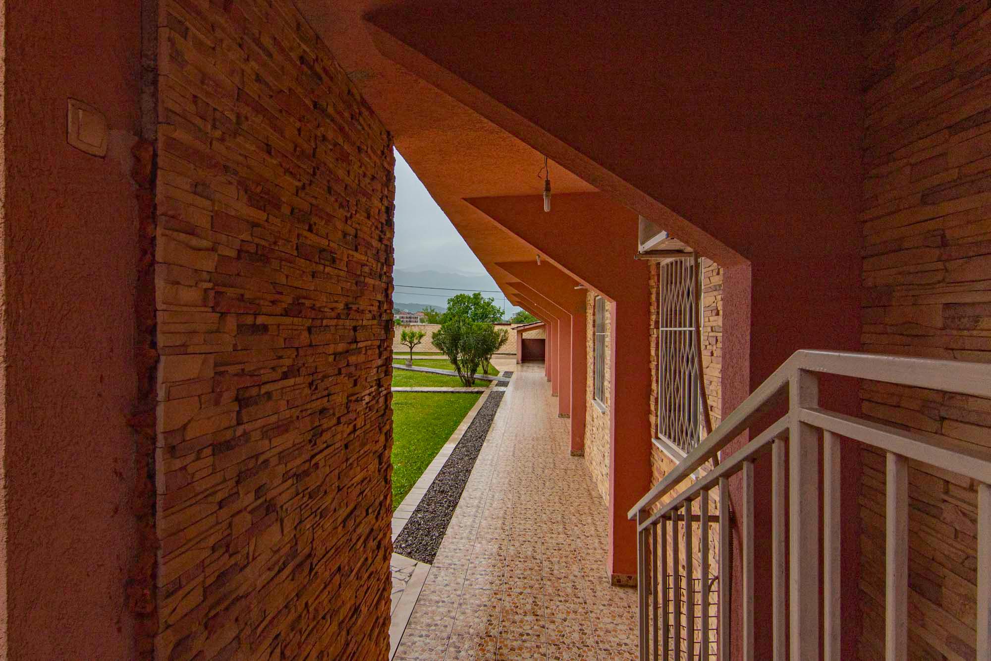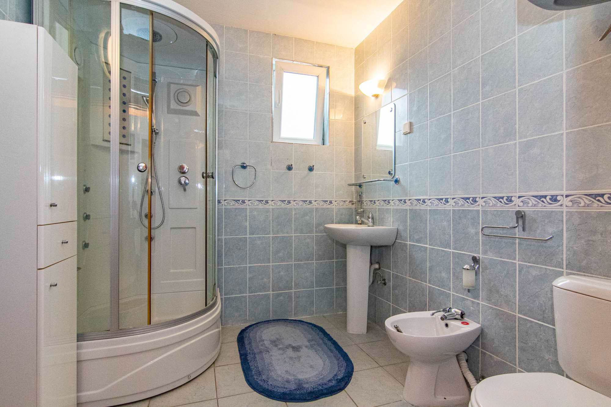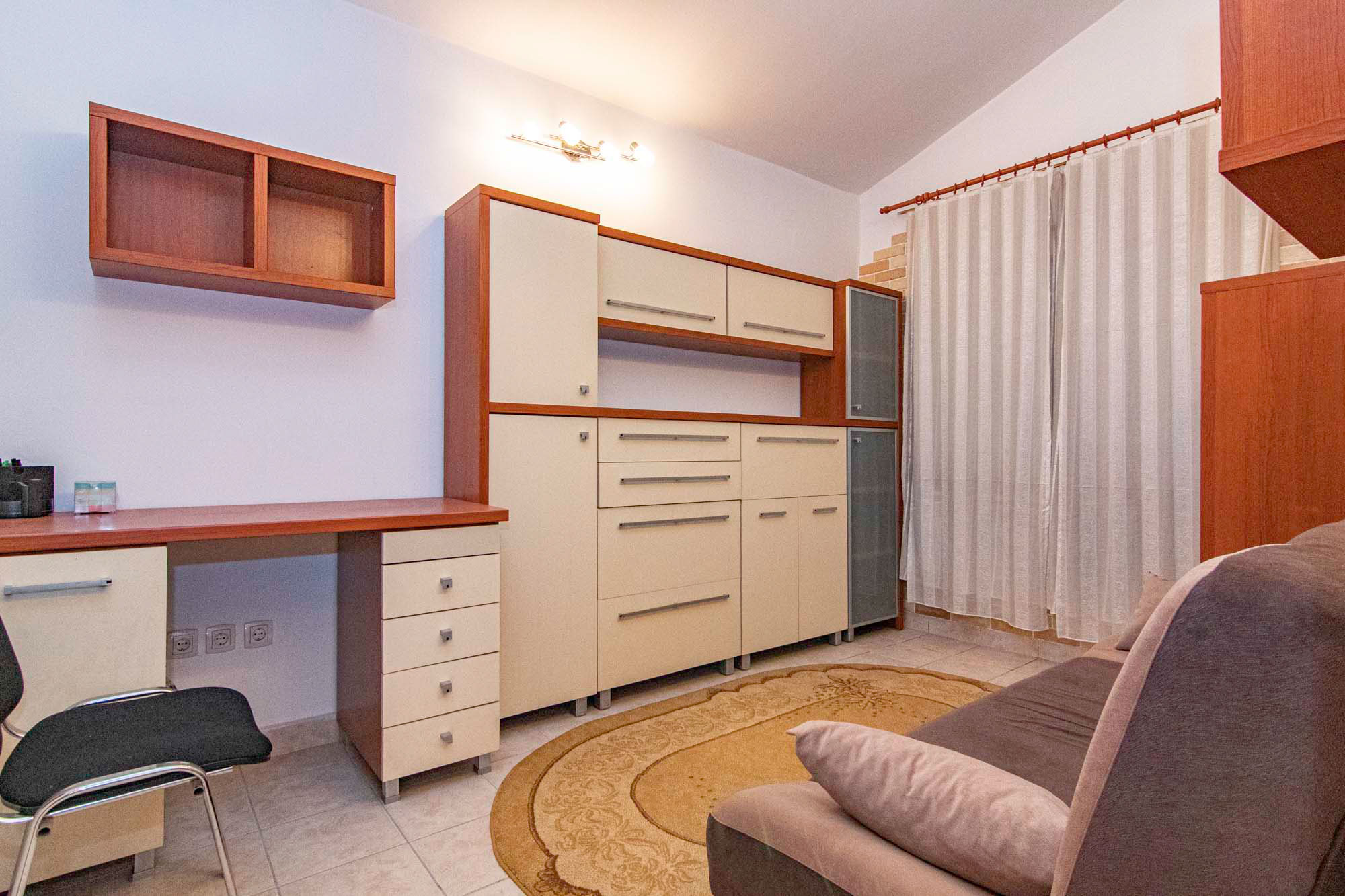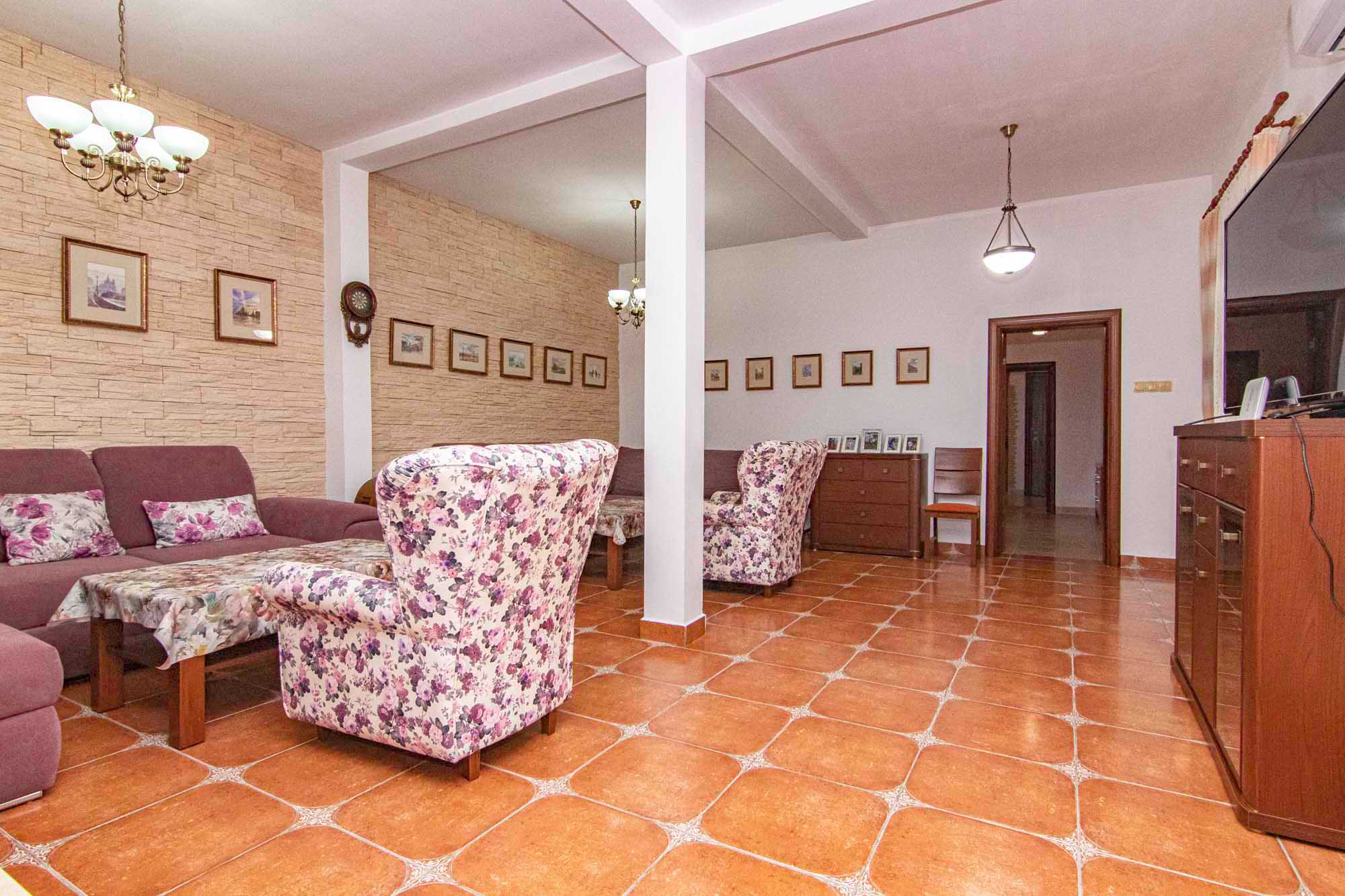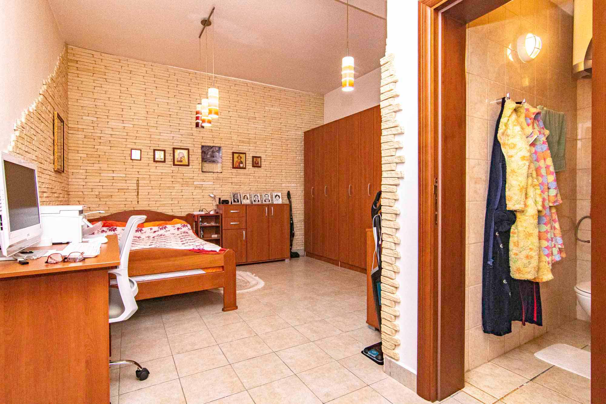 The house is on two levels. There is one residential unit on the ground floor. The rooms are arranged linearly, from one you enter the next. The layout is as follows: an entrance hall with a bathroom, a kitchen, a living room that is common to the whole house, a bedroom, and then another bedroom with a private bathroom.
