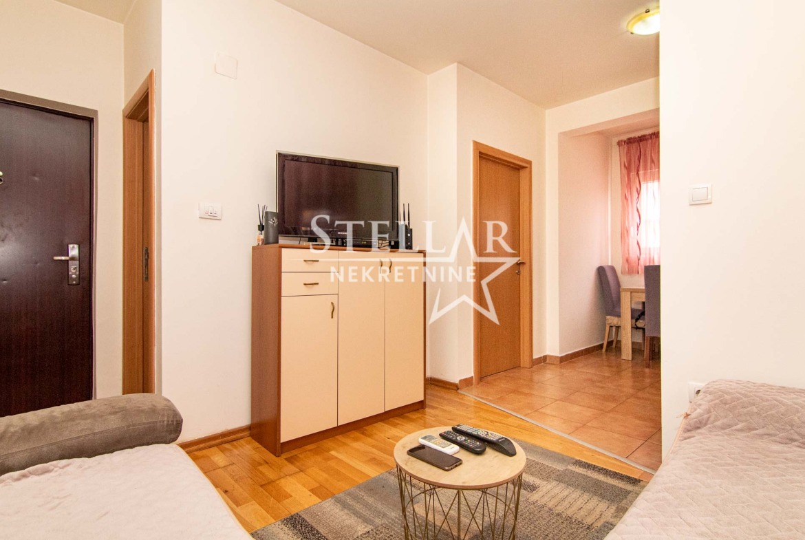 A furnished one-bedroom apartment is for rent on the ground floor of a residential building in Zabjelo, near Multicom. The apartment is very well lit, with natural daylight in every room. The apartment is heated and cooled by air conditioning, and there are two washing machines and dryers in the bathroom.