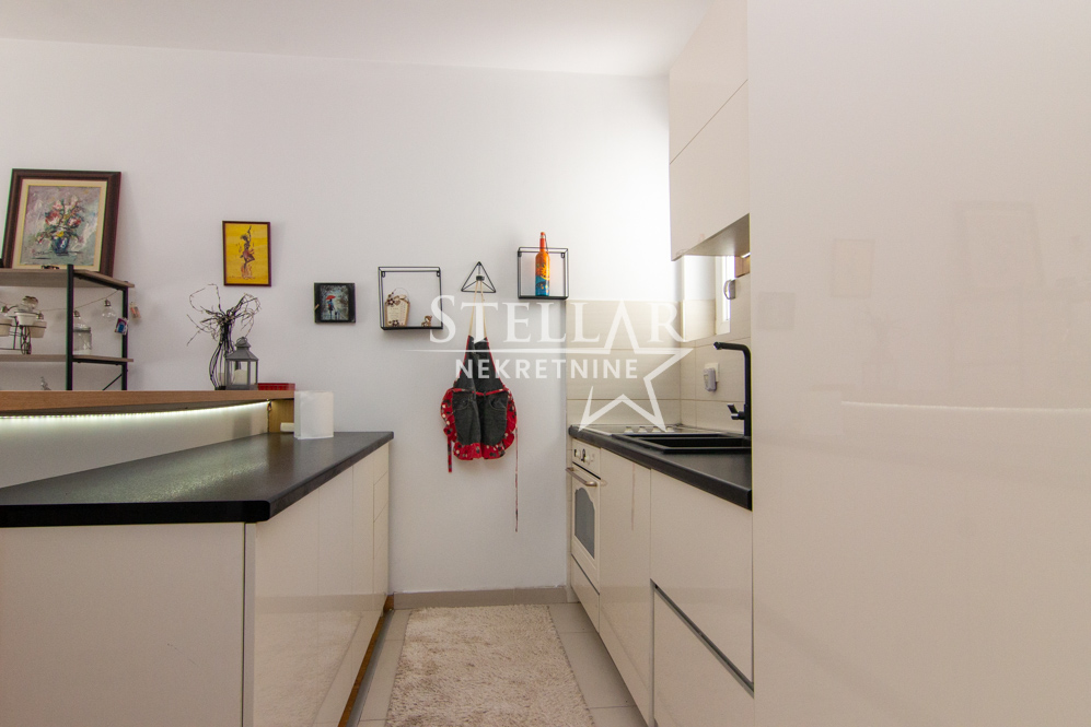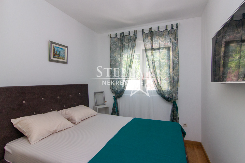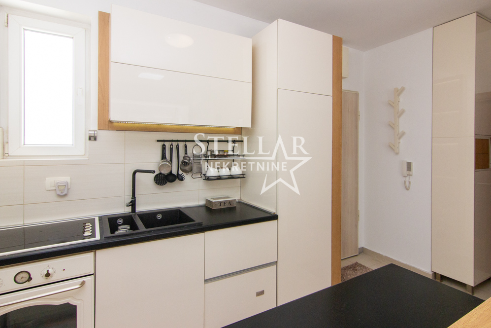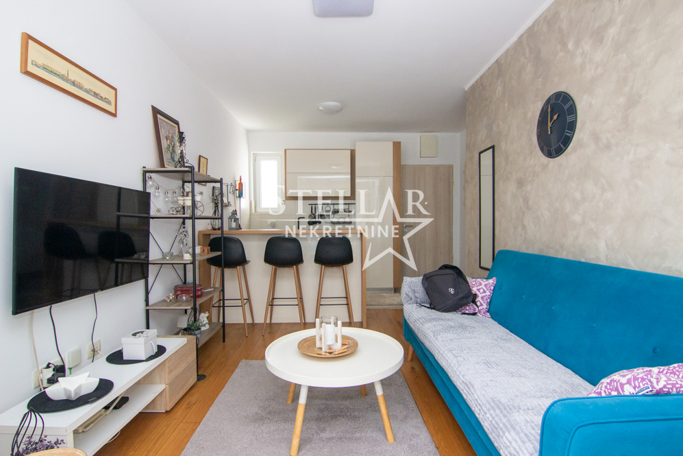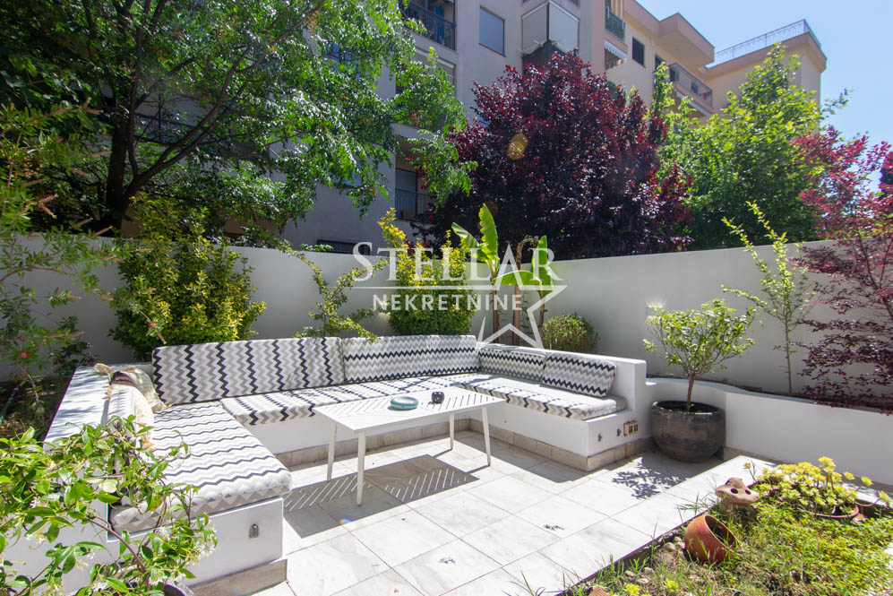 A one-bedroom apartment of 35m2 is for rent in the Stara Varoš neighborhood. The apartment is located on the ground floor. It is fully equipped, even has cutlery and bedding. The apartment is north-facing. There is air conditioning in the living room, and other appliances include a dishwasher. The bathroom has a washing machine and a shower. The living room opens onto a large yard with a corner sofa and a large parasol.