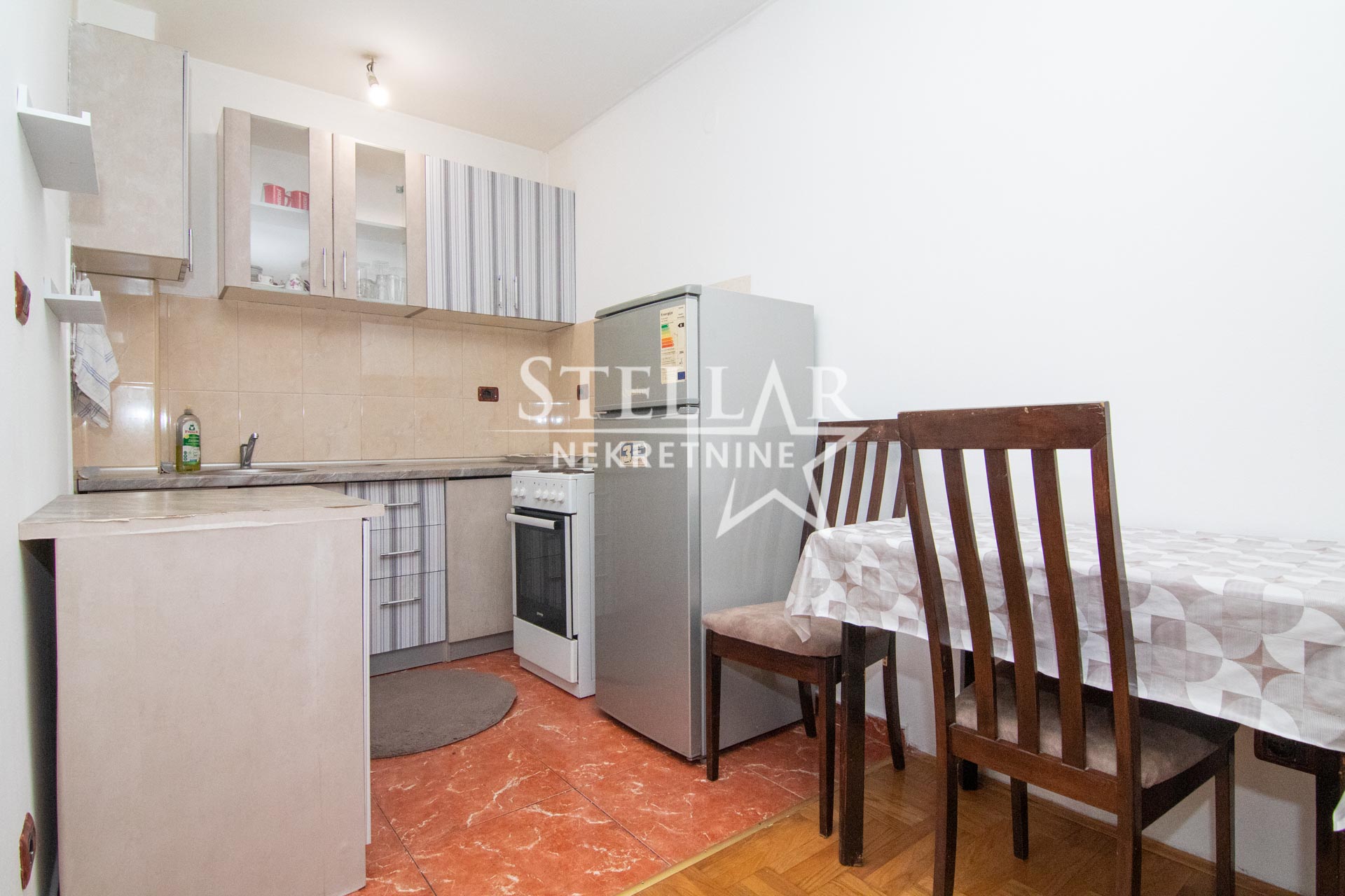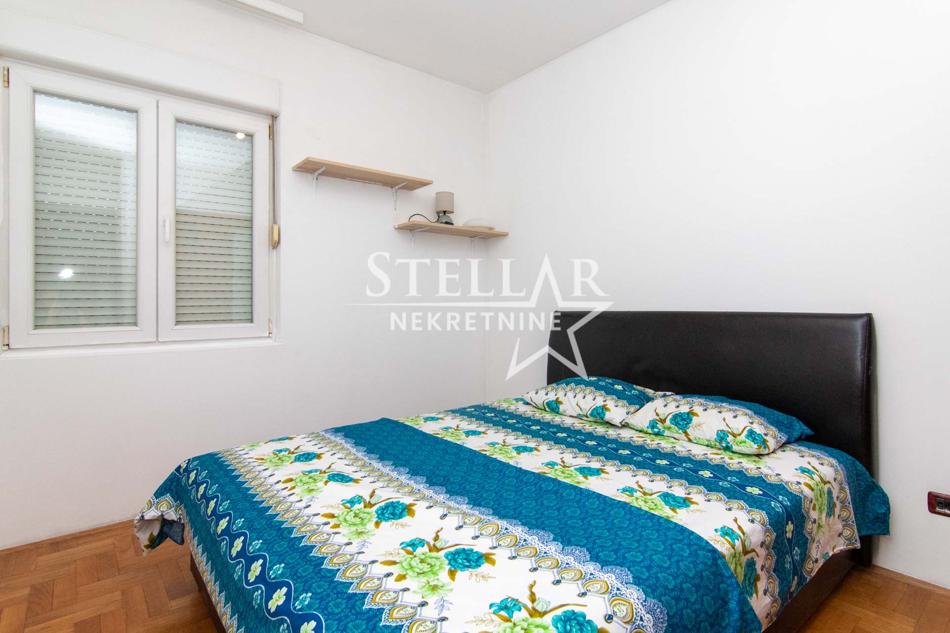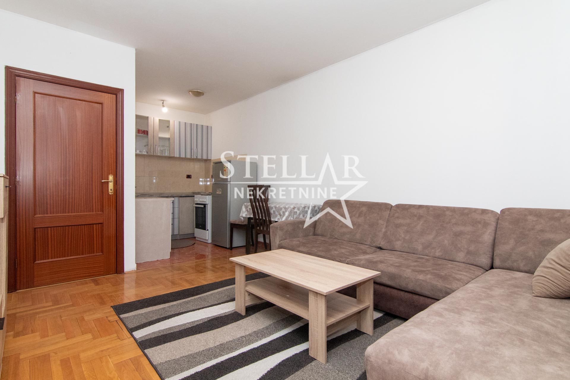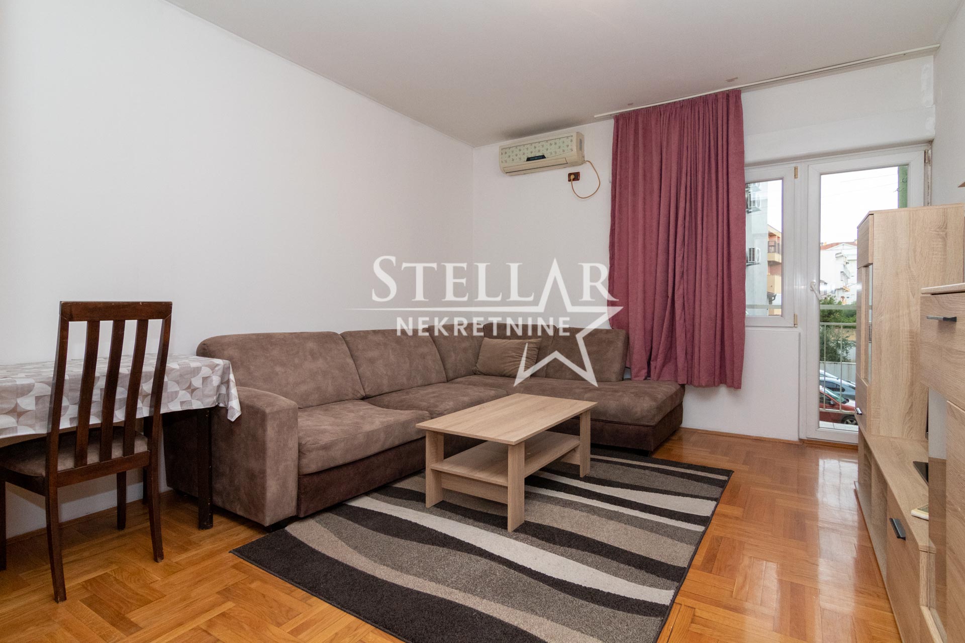 A nicely furnished one-room apartment for rent on the 1st floor of a residential building in Zabjelo, built in 2013. The apartment is extremely warm despite the northwest orientation. The living room has an exit to the balcony. The apartment is equipped with all things necessary for life. The bedroom has a double bed and a large wardrobe. The bathroom has a washing machine and a shower cabin. The living room has an air conditioner. The building has an elevator and there is a large public parking lot in front of the building. Nearby are shops, restaurants, schools, kindergartens, supermarkets, bakeries, bus stops, and toll-free pumps.