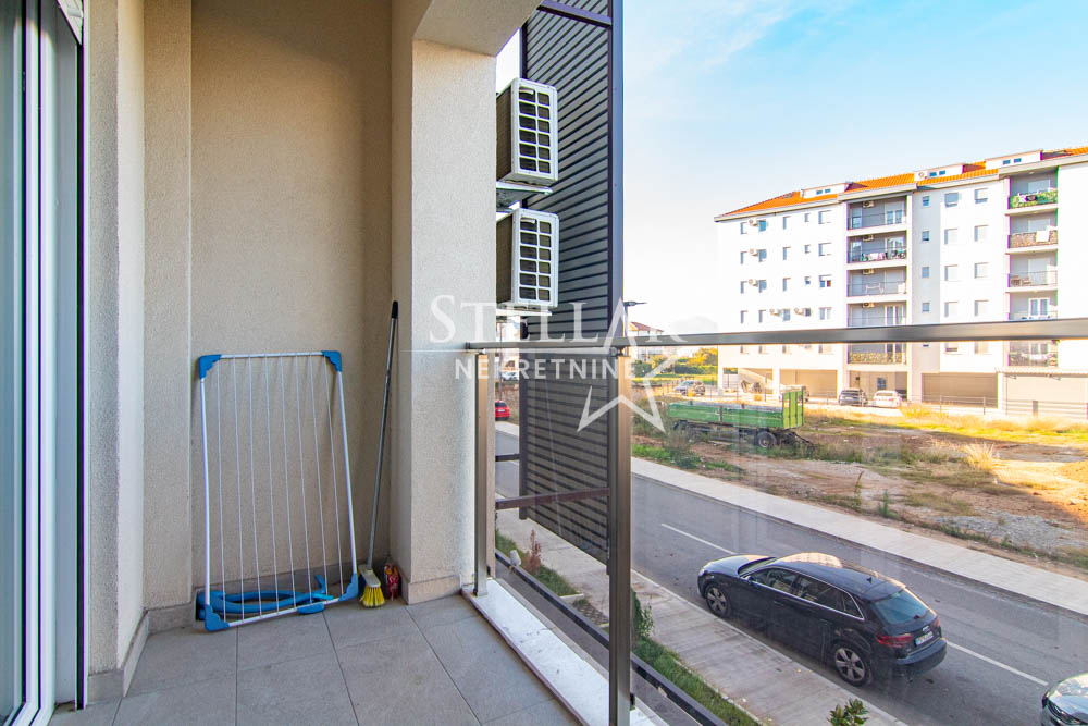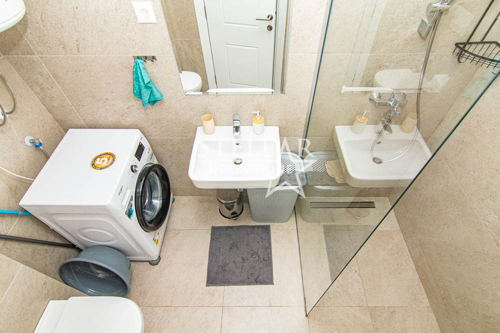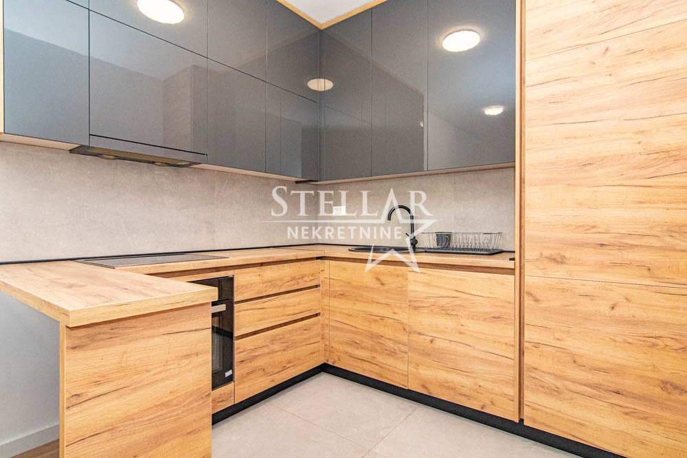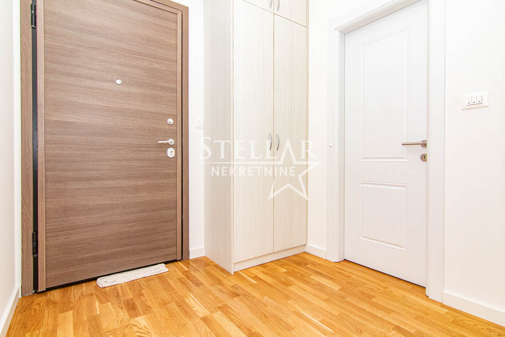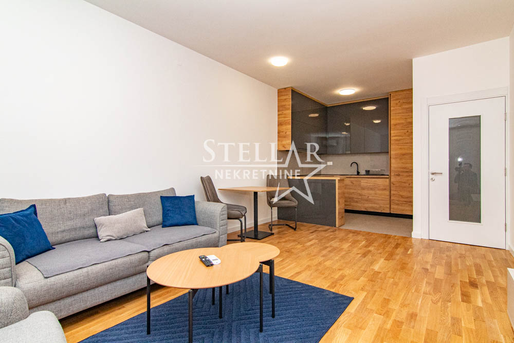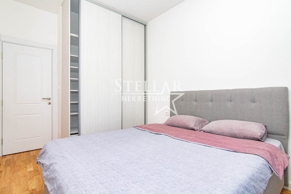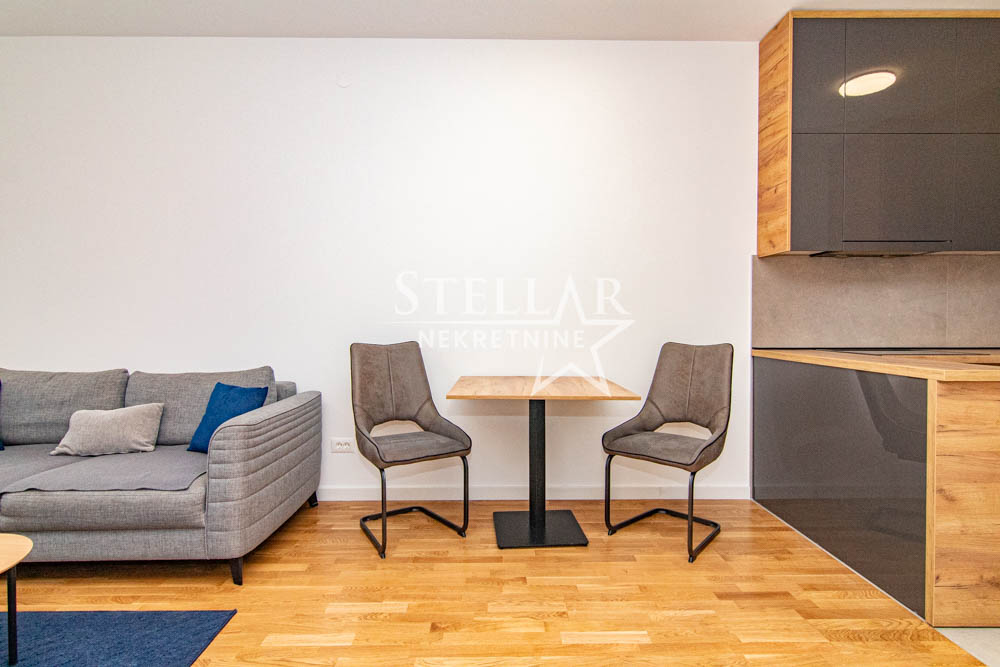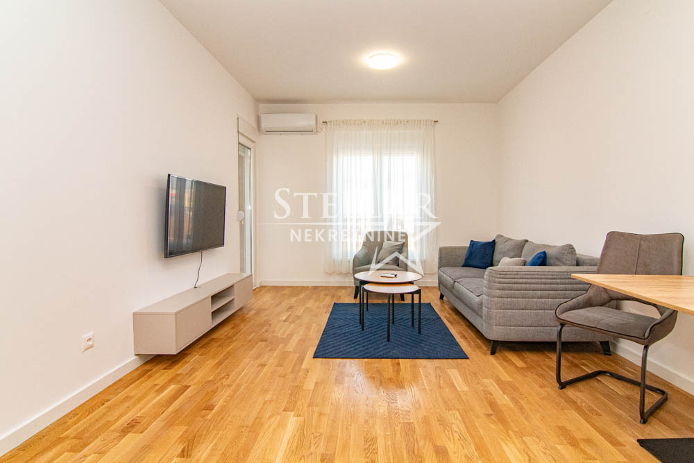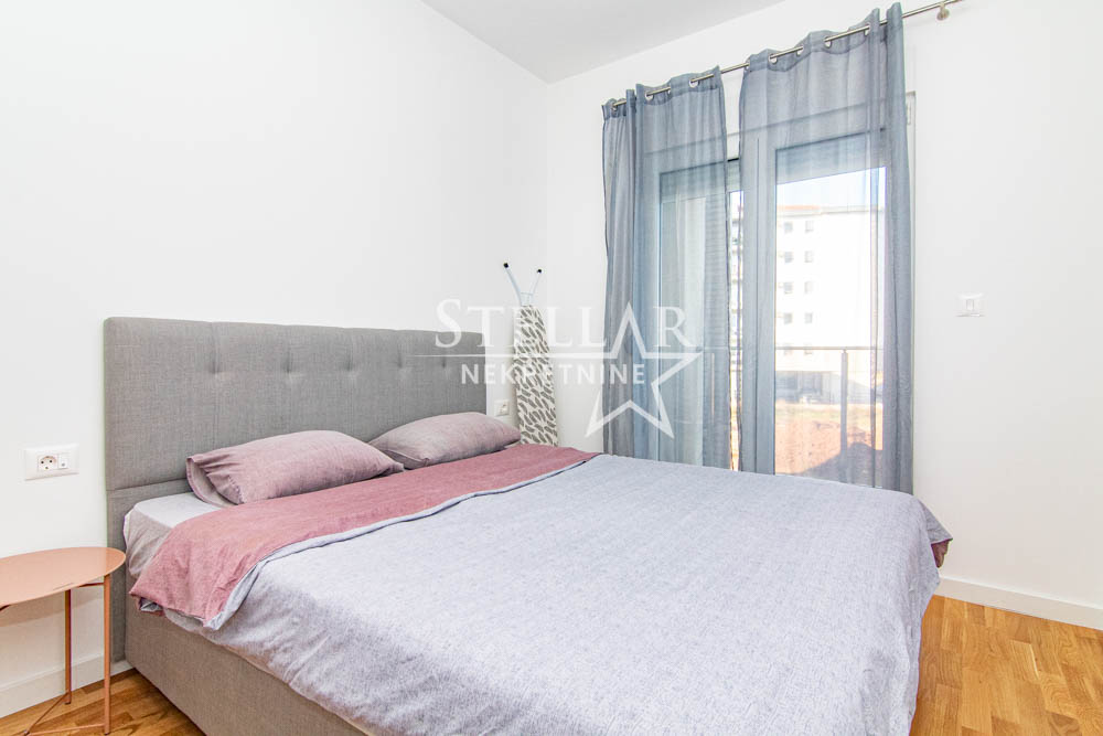A beautifully furnished one-bedroom apartment is for rent in the new Ventura building in Zabjelo. The apartment is located on the first floor, has 47m2, with a balcony that can be accessed through the living room and bedroom. Everything in the apartment is new, the air conditioning is inverter, the kitchen has a large refrigerator, a dishwasher, and a washing machine in the bathroom. The bedroom has a double bed and a large closet.
