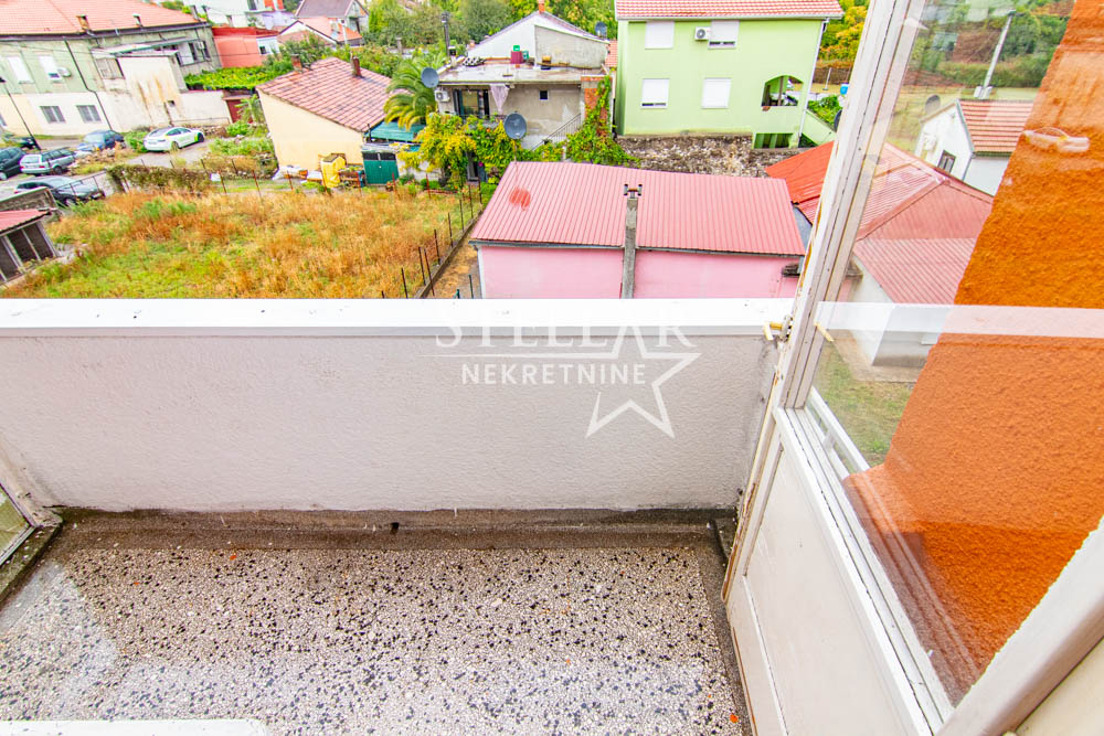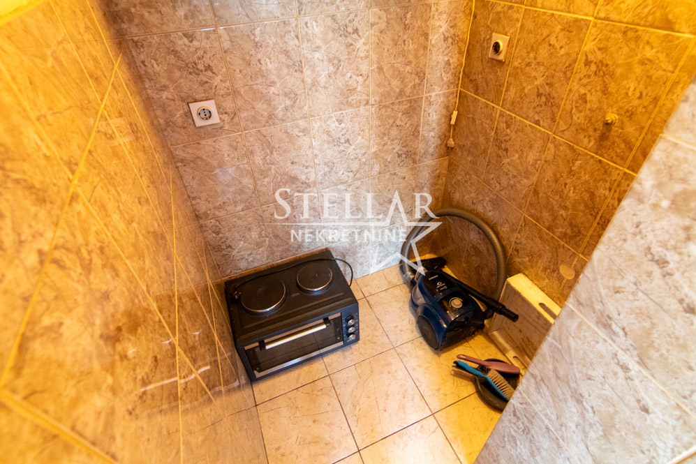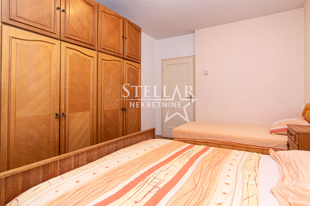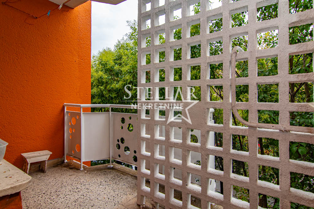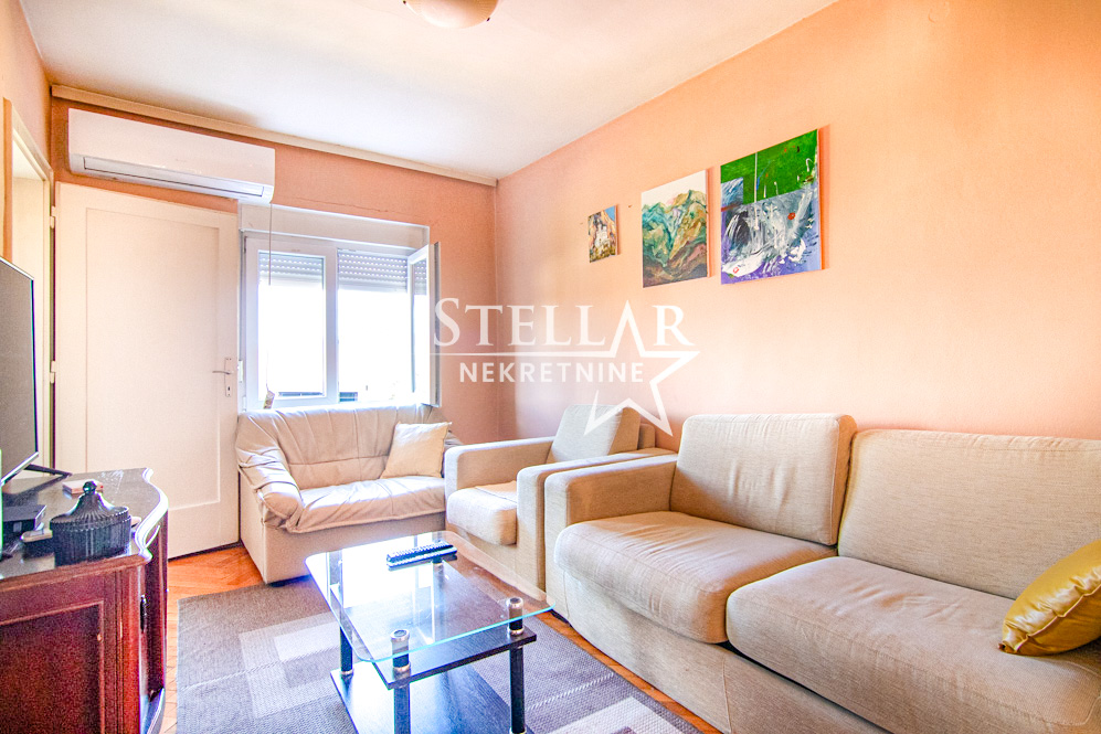 For rent is a furnished one-bedroom apartment of 48m2 on the second floor of an older building on Oktobarske revolucije Street in Podgorica. The apartment has a spacious kitchen with a dining room that opens onto a north-facing balcony. The bedroom has two beds – a double bed and a single bed, as well as a four-door wardrobe. The bedroom opens onto a second balcony, facing south.