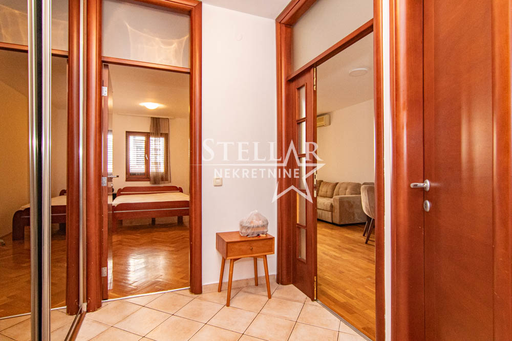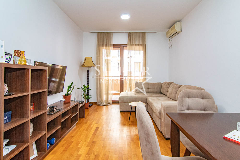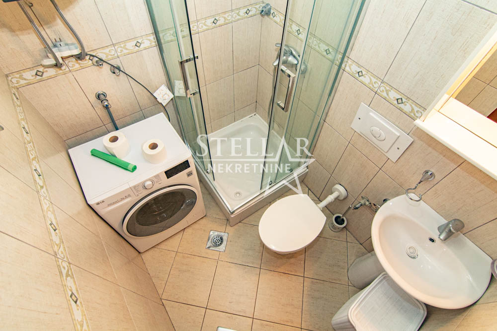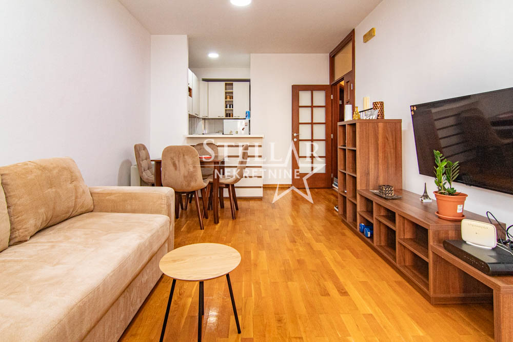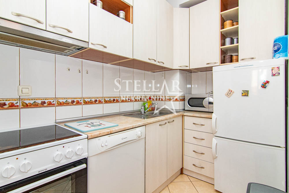 A beautifully furnished one-bedroom apartment is for sale on the first floor of a newer building in the Gorica C neighborhood. The apartment, measuring 49m2, is modernly furnished and oriented to the east. The building has an elevator and parking for tenants. There is a Voli supermarket on the ground floor, and the neighborhood is quiet. The apartment has a washing machine in the bathroom and a dishwasher in the kitchen, while the kitchen and dining room are separated by a bar. The spacious balcony further contributes to a pleasant stay.