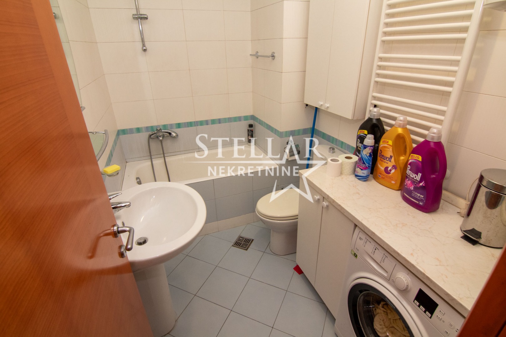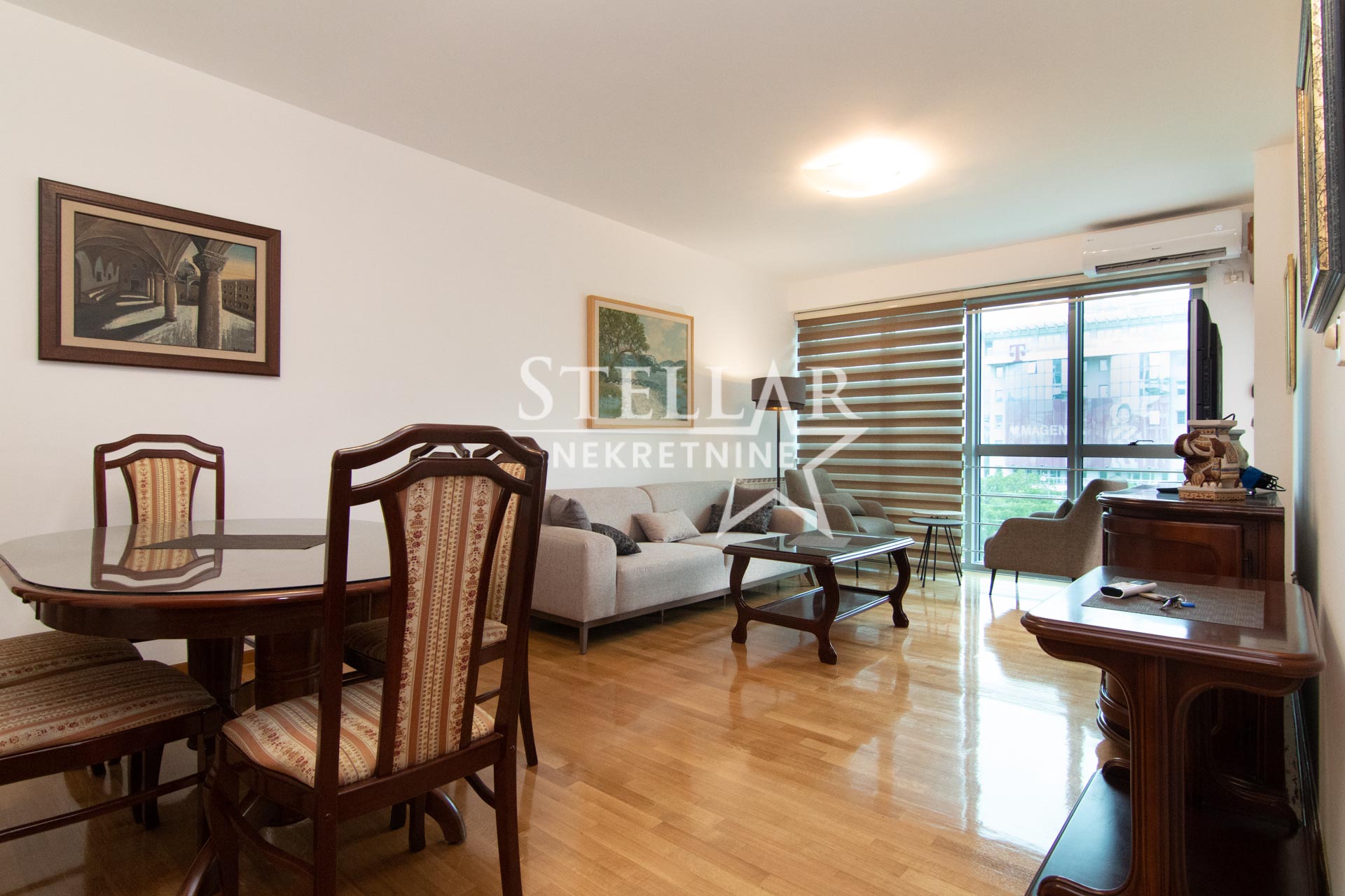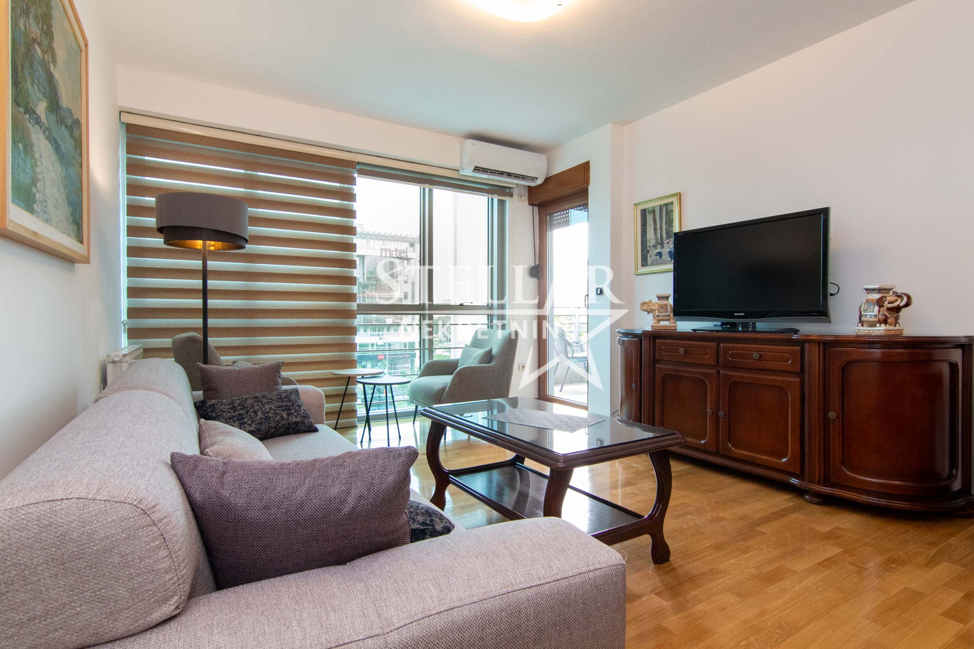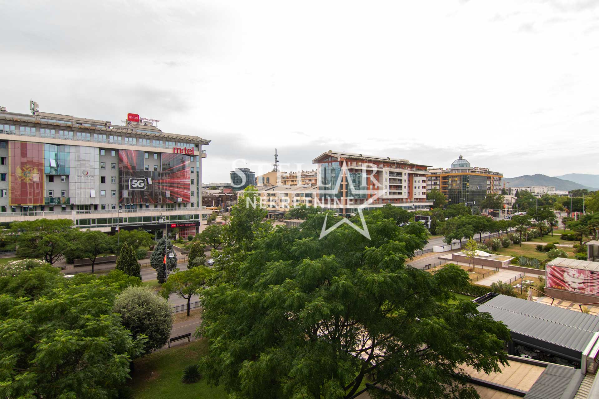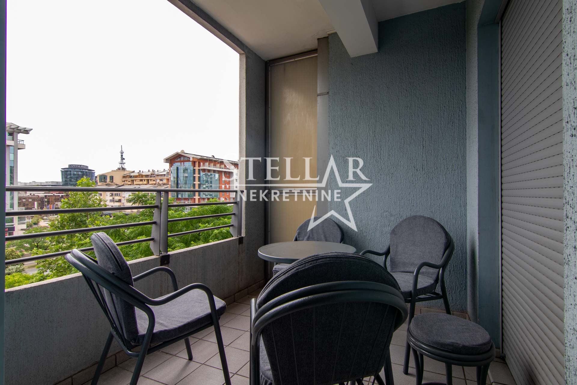 A newly furnished one-bedroom apartment is for rent on the second floor of the Maxim building across the Morača River. The apartment, measuring 61m2, offers a spacious balcony overlooking Rimski Trg, which is accessible from both the living room and the bedroom. The bedroom is furnished with a comfortable double bed. The kitchen is spacious and fully equipped, including a dishwasher.