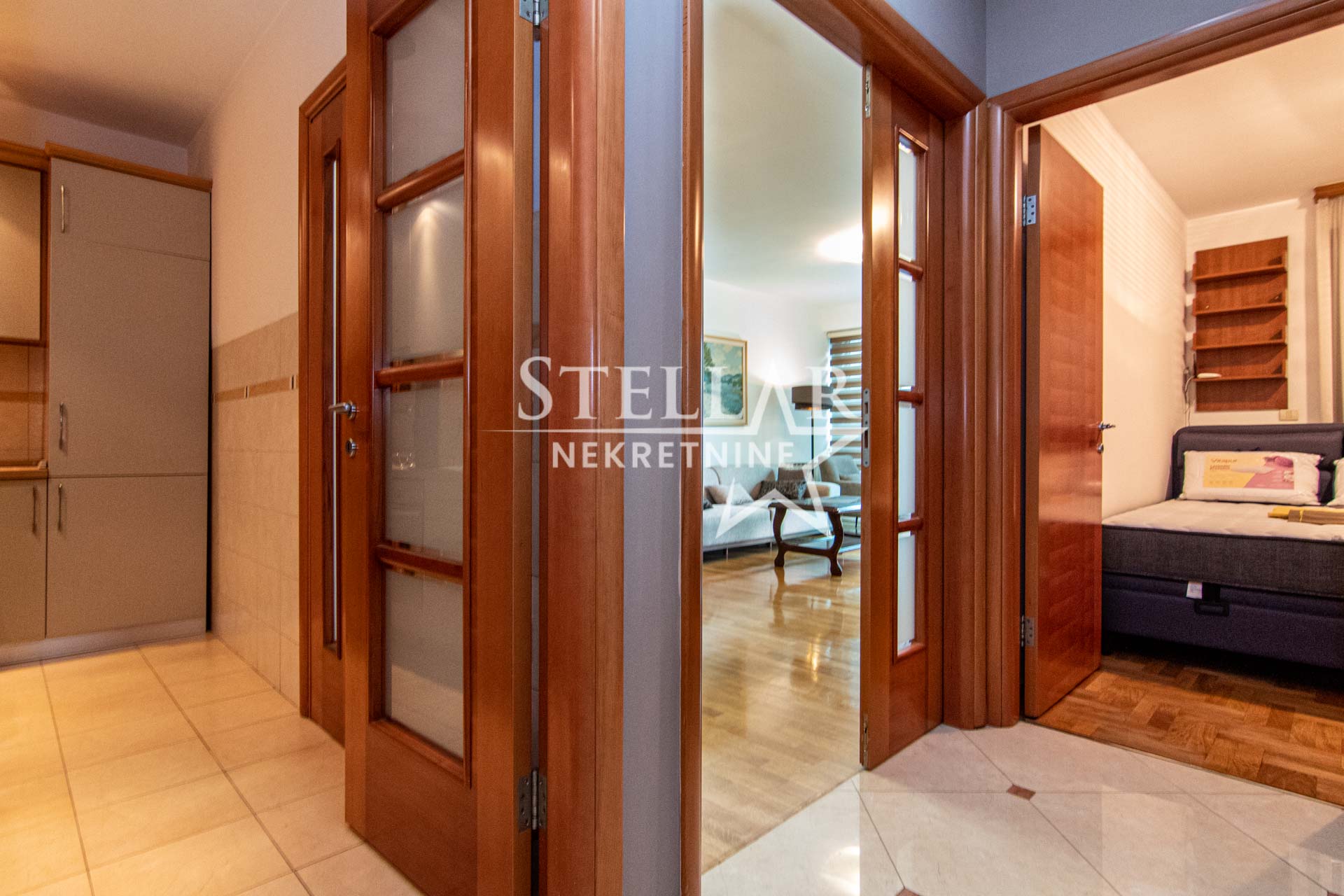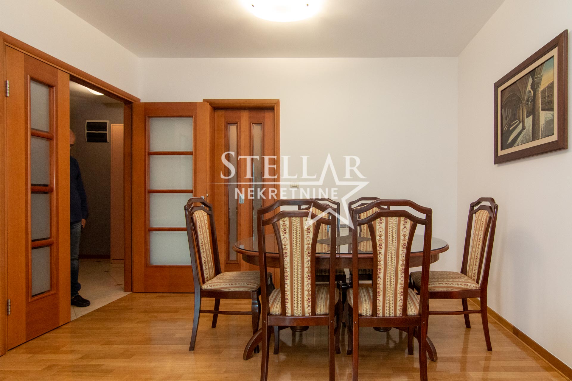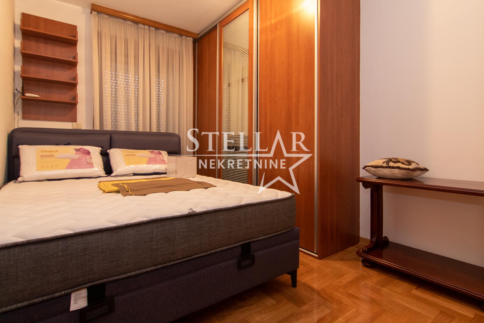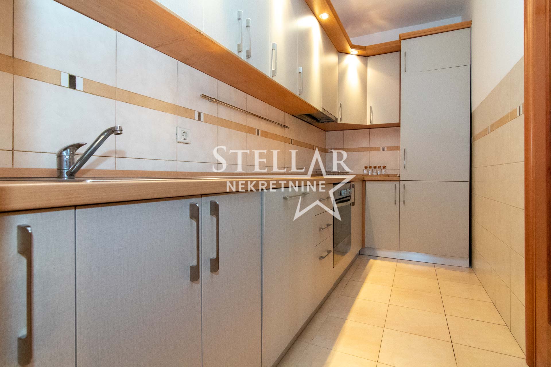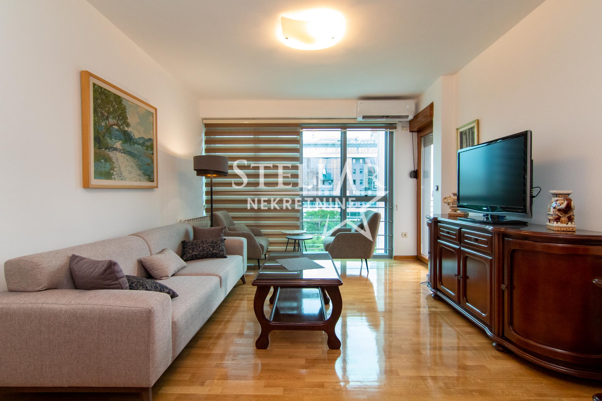 A newly furnished one-bedroom apartment is for rent on the second floor of the Maxim building across the Morača River. The apartment, measuring 61m2, offers a spacious balcony overlooking Rimski Trg, which is accessible from both the living room and the bedroom. The bedroom is furnished with a comfortable double bed. The kitchen is spacious and fully equipped, including a dishwasher.