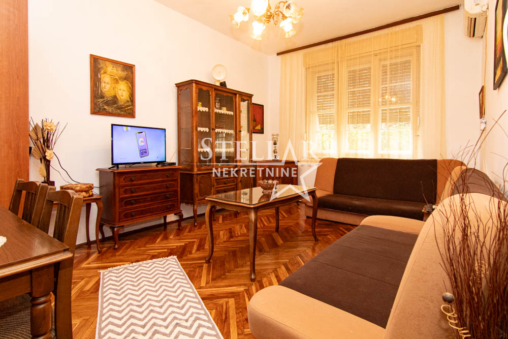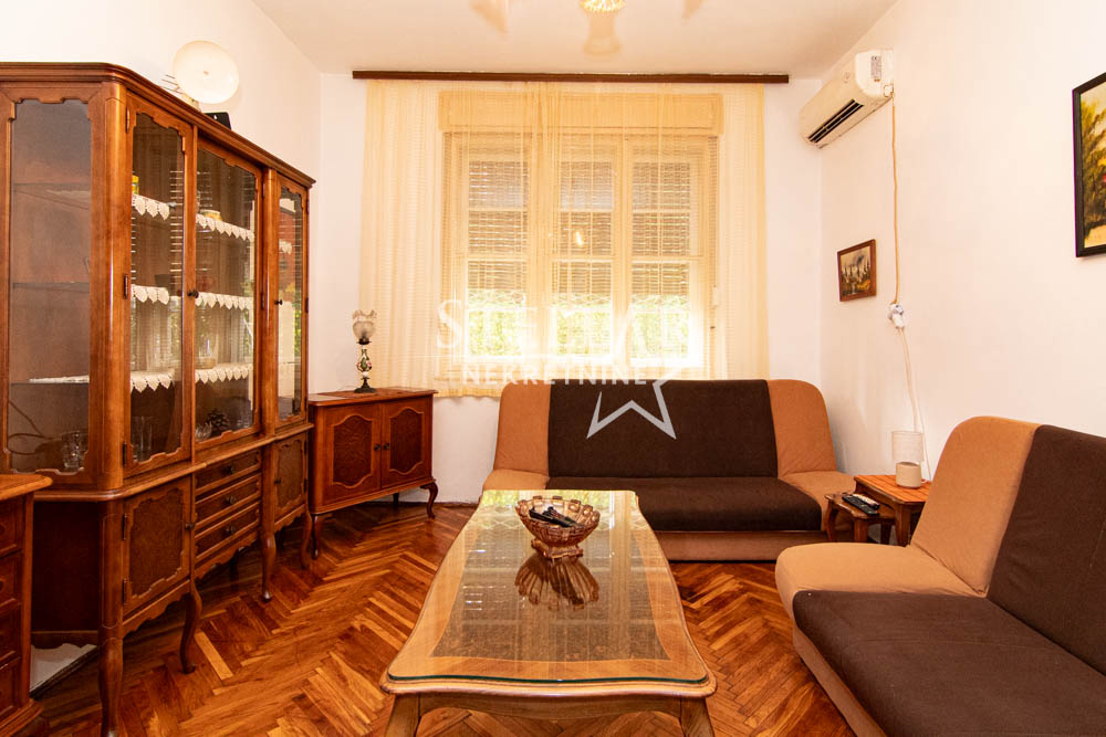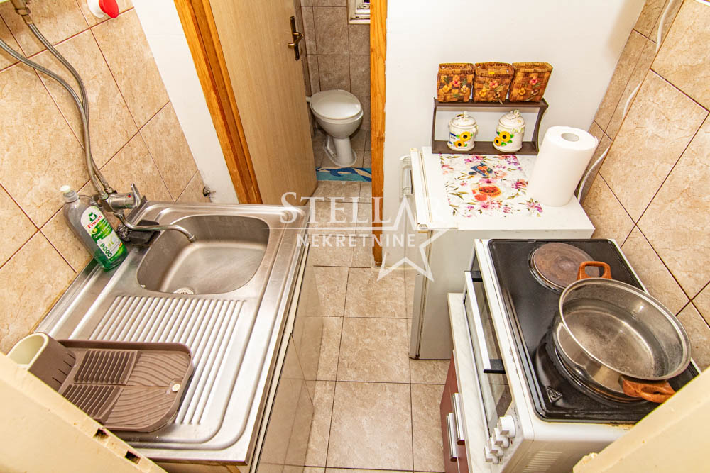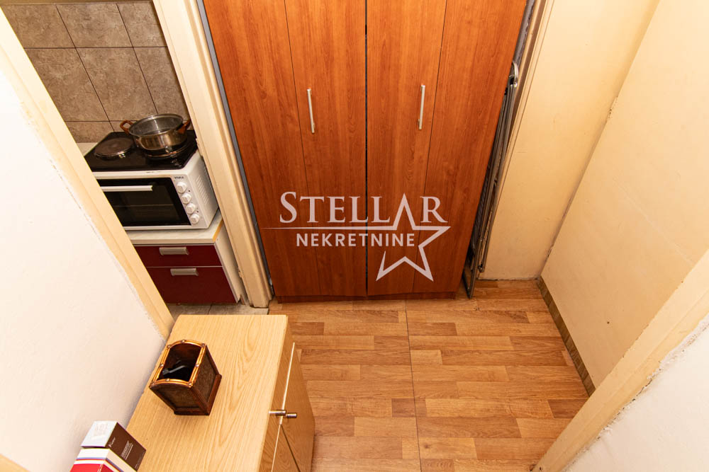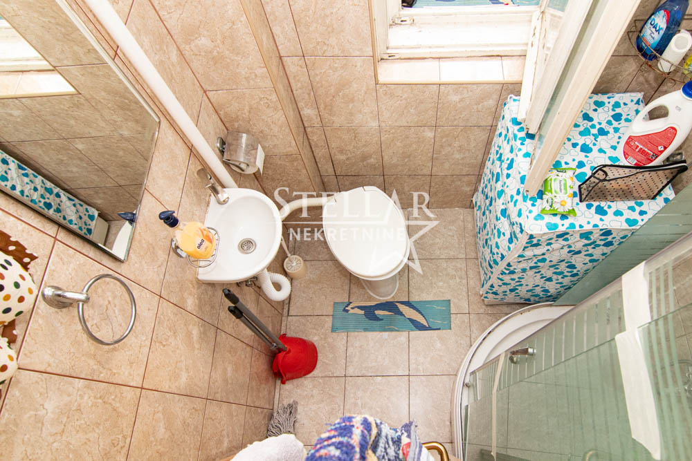 A furnished and arranged studio apartment is for rent on the high ground floor of a building in the Gorica C settlement. The area is 25m2, high ceiling. The windows have bars, which guarantees security. The apartment has older furniture. There are several closets and cabinets for clothes and belongings. The apartment has air conditioning and two pull-out sofas. The bathroom has a shower cabin and a washing machine.