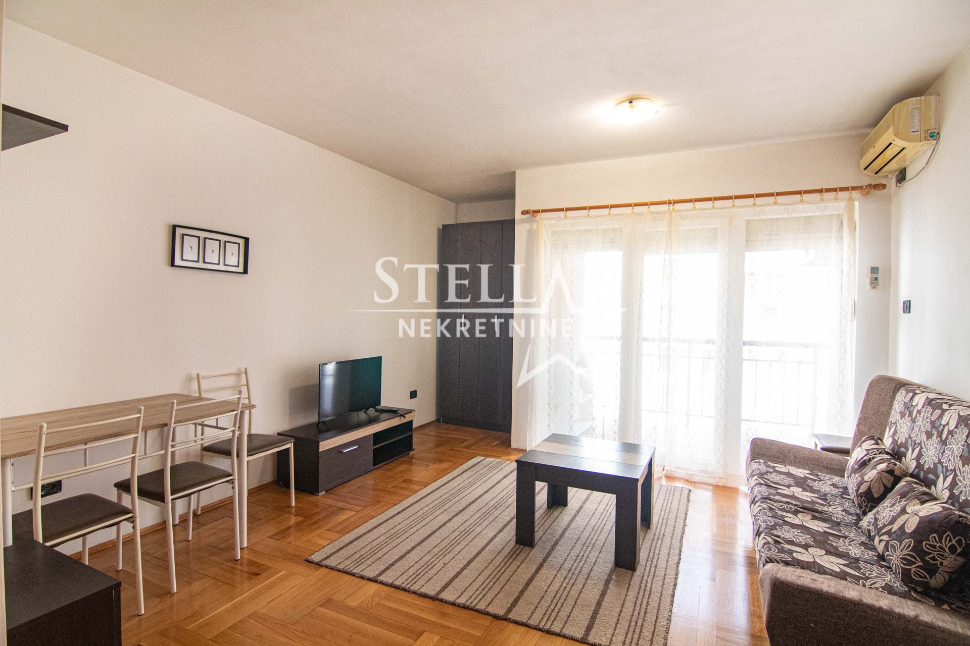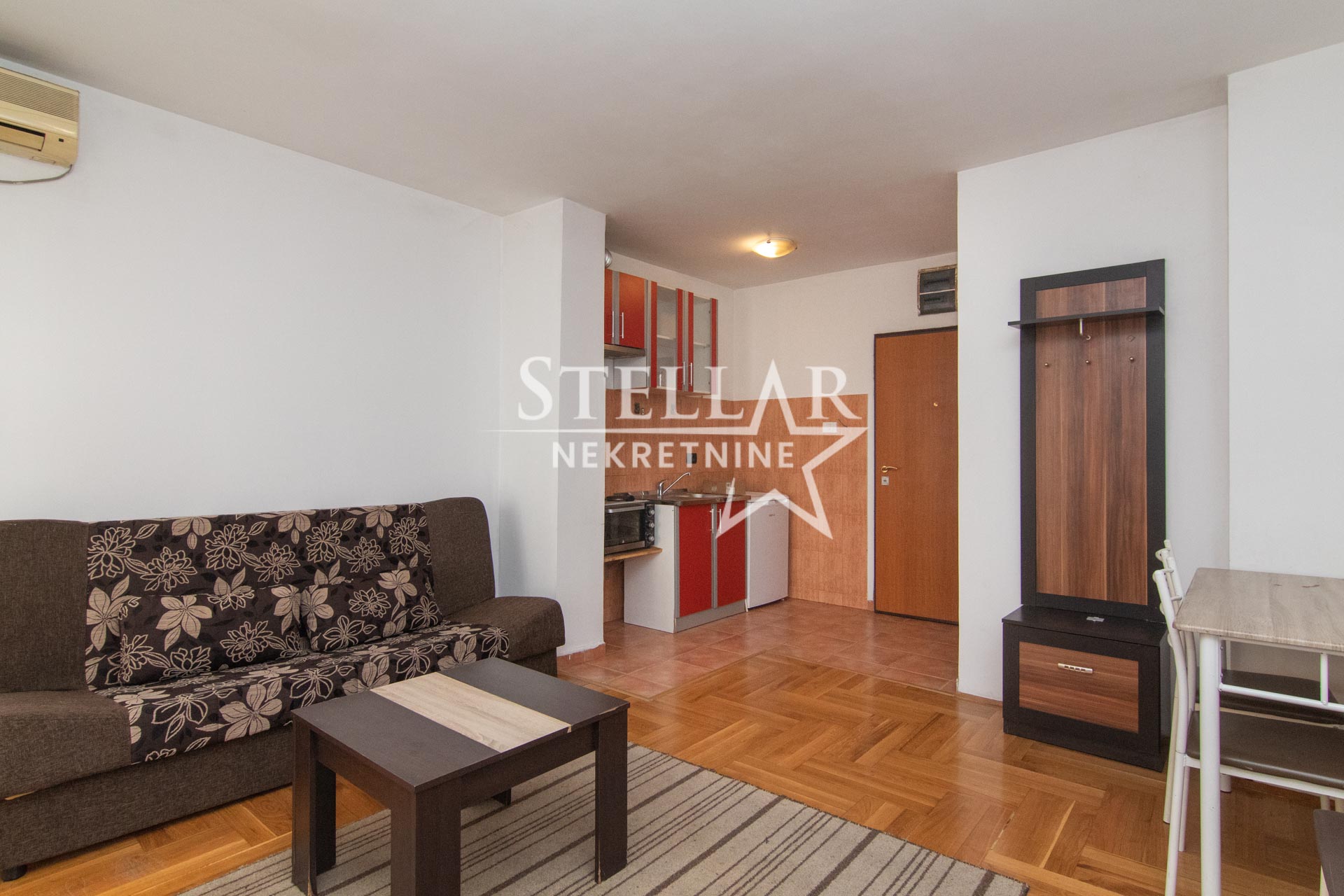 A nicely furnished studio apartment is for rent on the 2nd floor of a residential building without an elevator in the 1. maj neighborhood, a few minutes’ walk from the Big Fashion shopping center. The studio is 27m2 in size, with an east-facing balcony. The apartment has air conditioning, a refrigerator, a two-burner stove and an oven, a washing machine, and a TV.