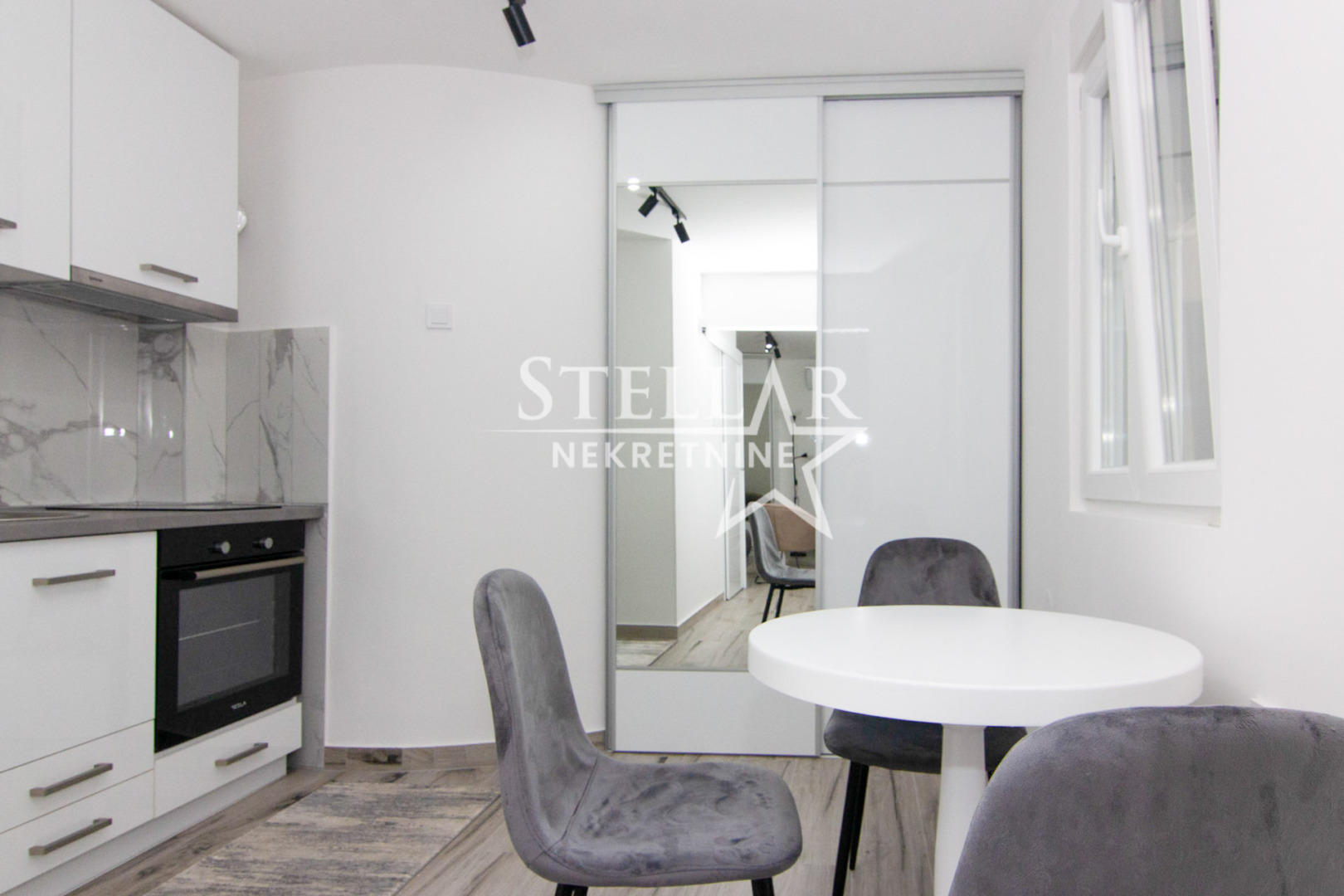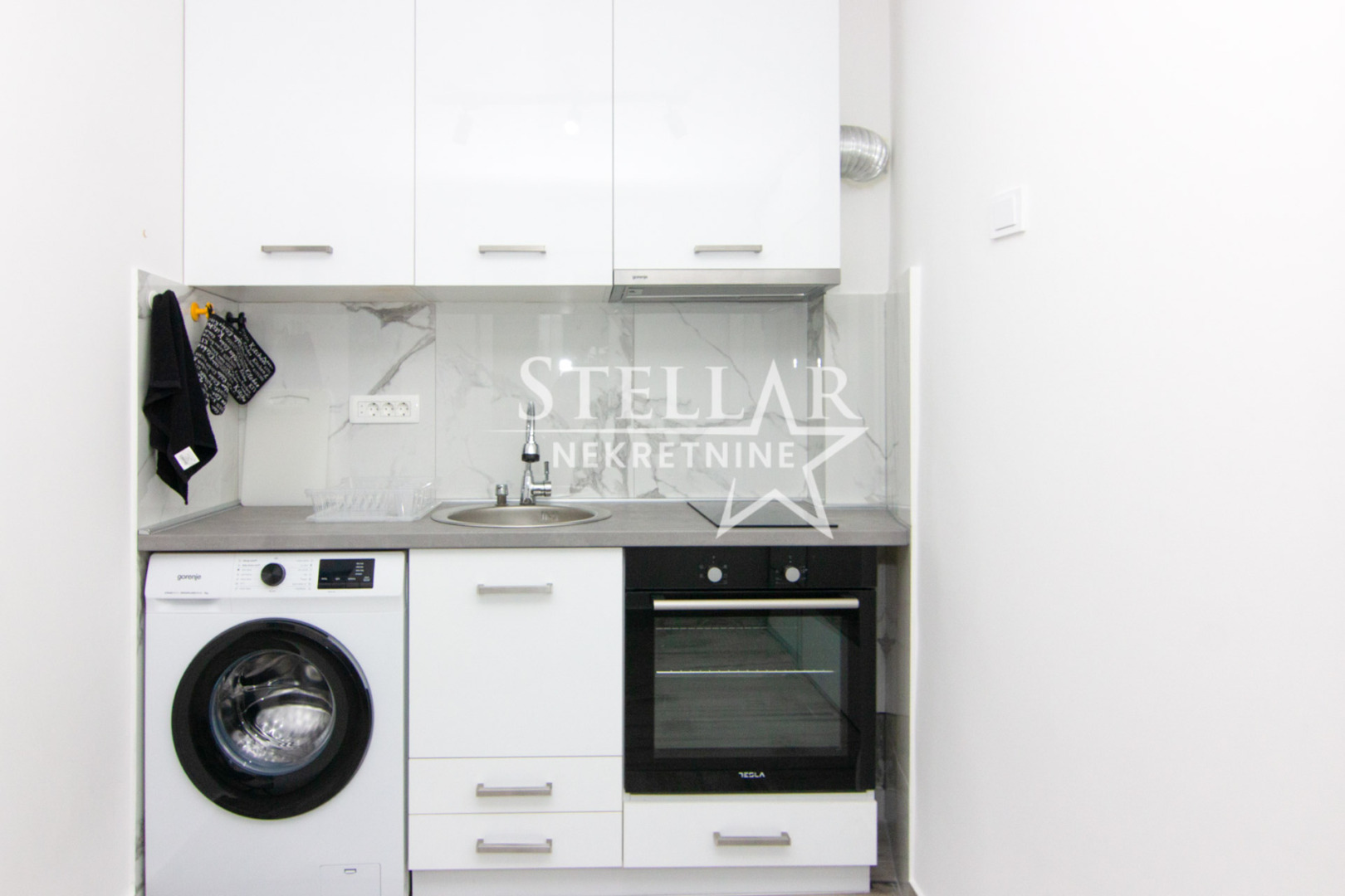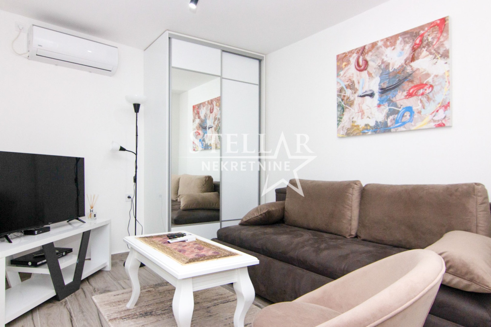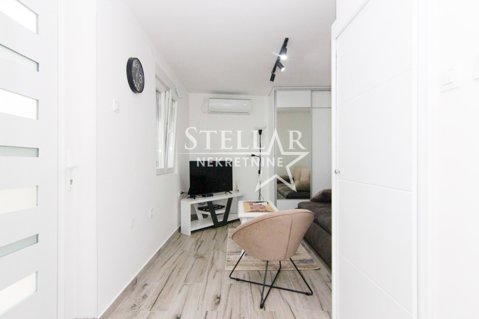 A 30m2 studio apartment is for rent in a house in the Gorica C settlement. The studio is located on the ground floor. It is fully furnished with new furniture, cutlery and towels. The apartment is east-facing. It has air conditioning, and other appliances include a washing machine and a refrigerator.
