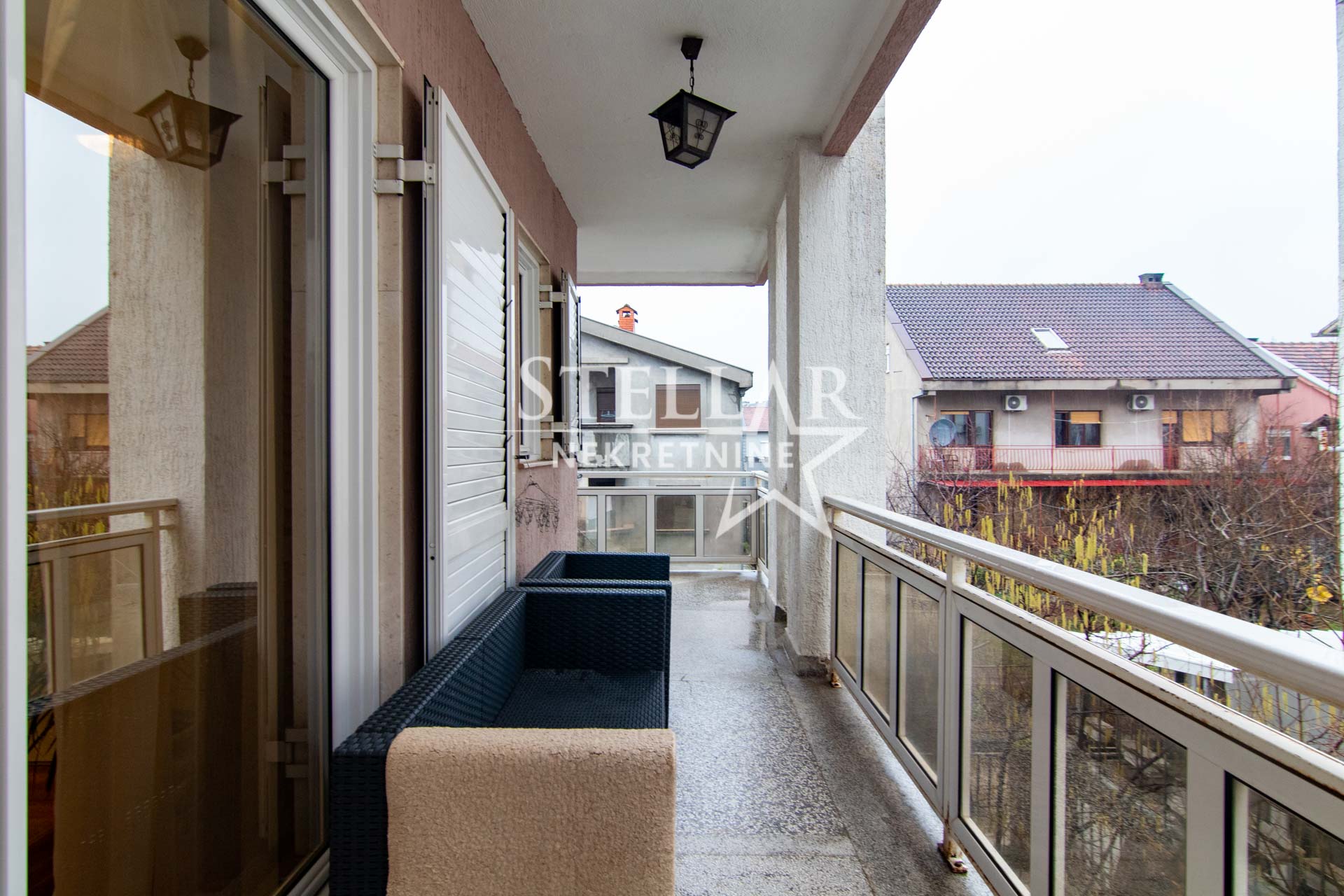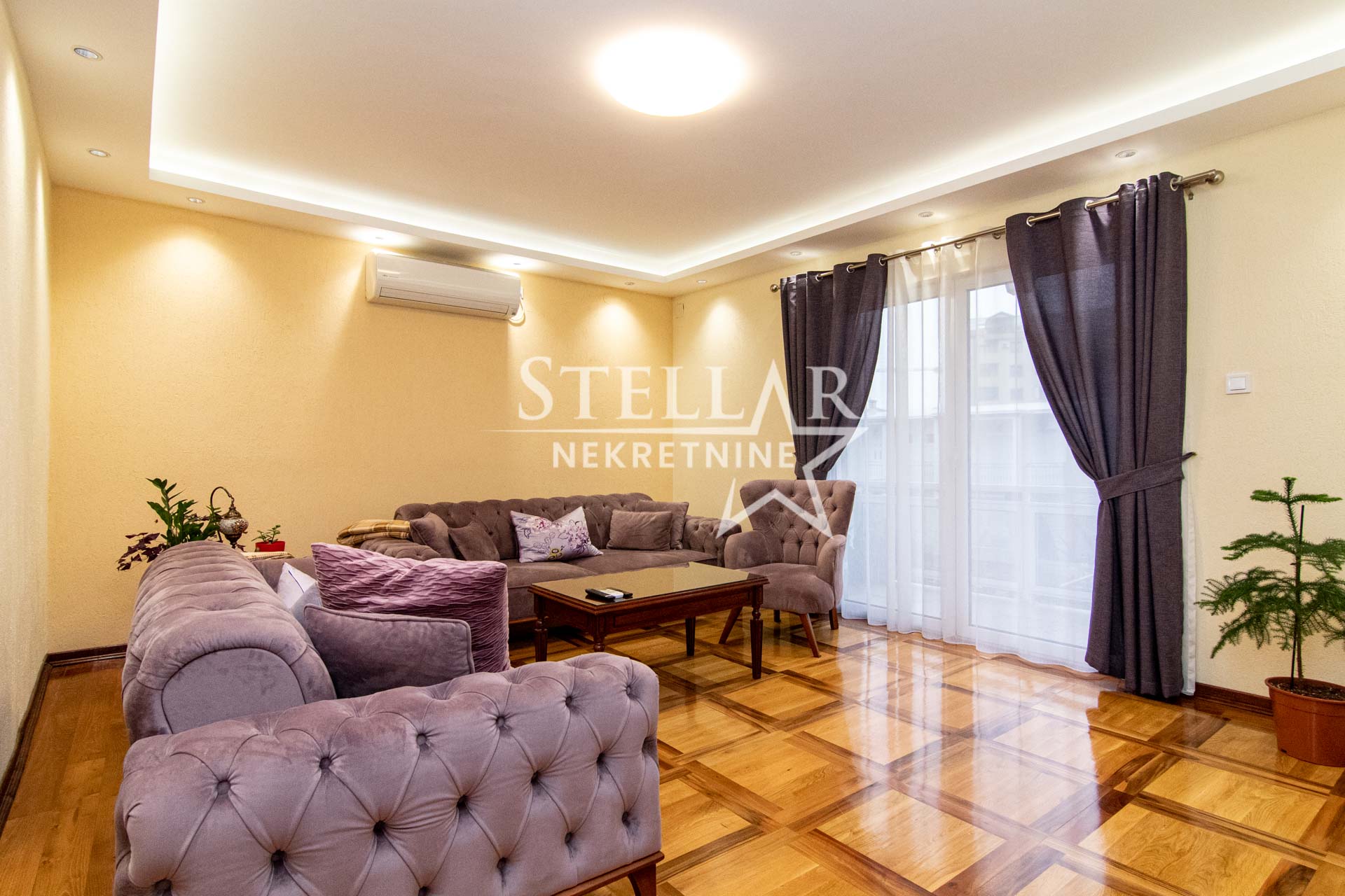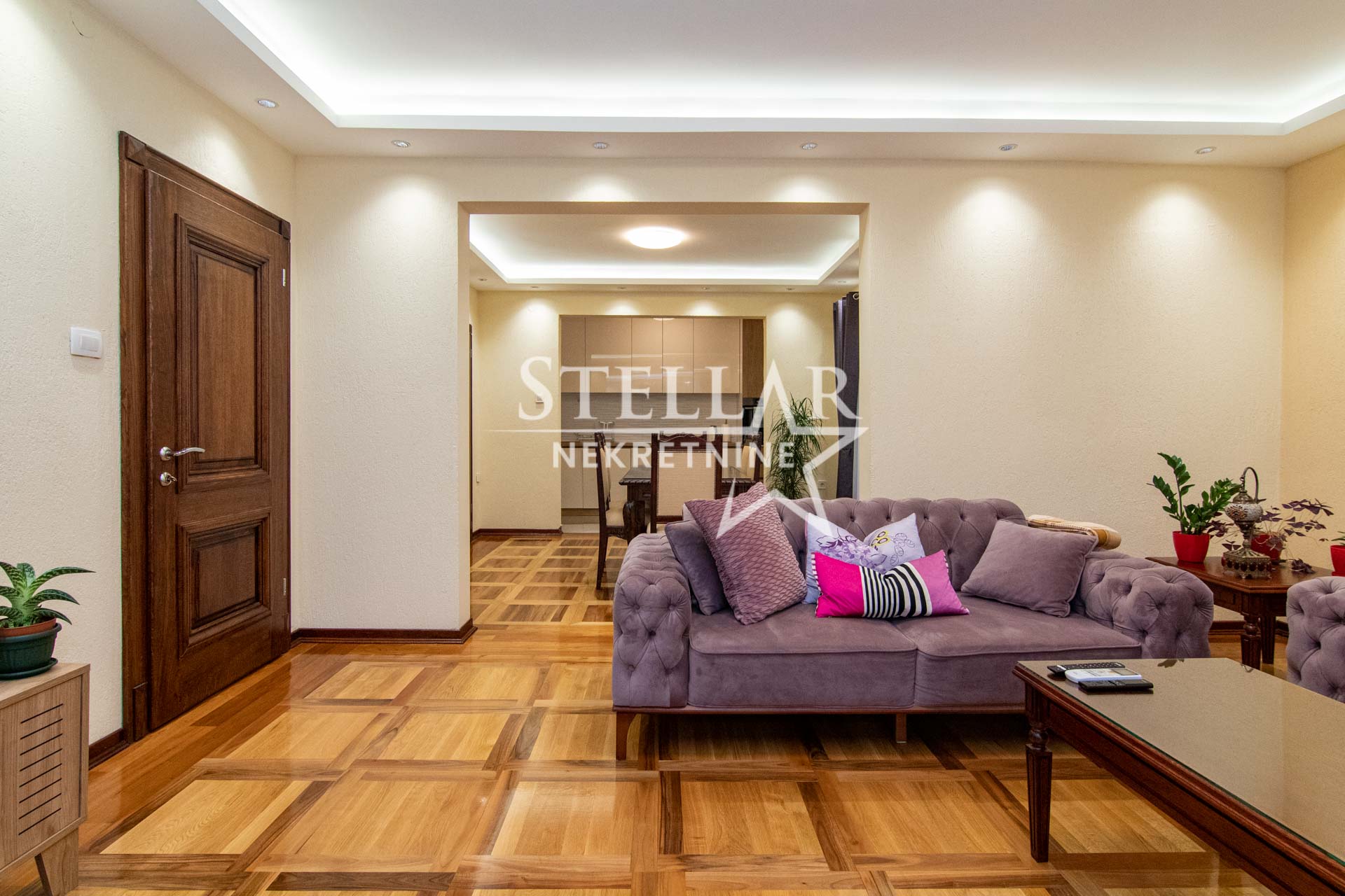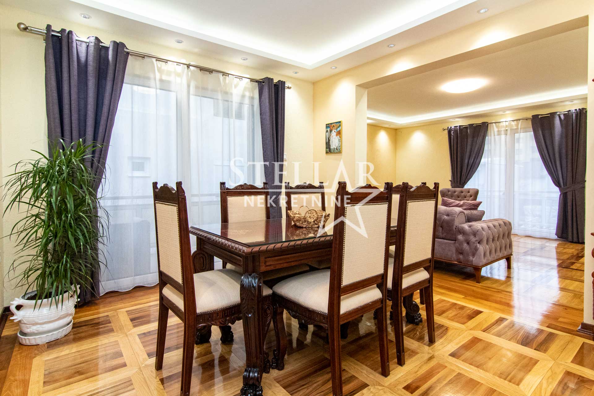 Luxuriously furnished three-bedroom apartment for sale on the 1st floor of a small residential building (3 floors in total). The apartment has an area of 128m2, including covered balconies on all 4 sides of the apartment. The balconies are accessed from: hallway, living room, dining room, larger bedroom. Each room has daylight.