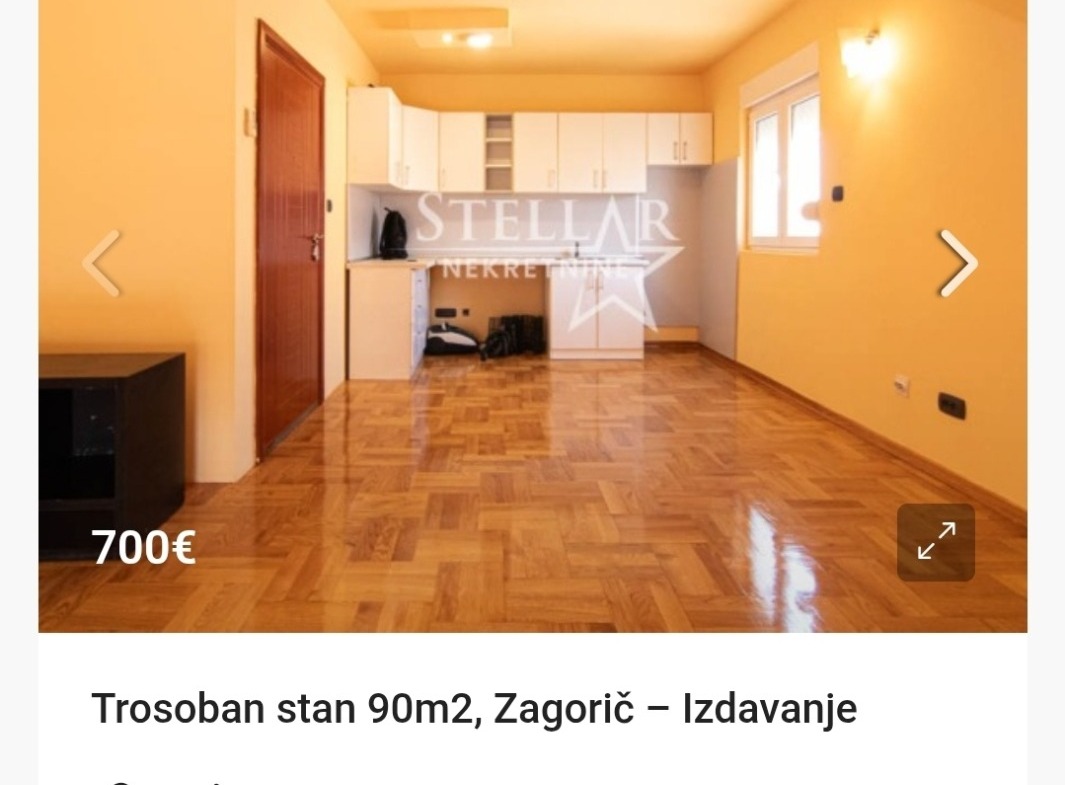 A three-bedroom apartment is for rent in Zagorič. The apartment is unfurnished and is being rented as such. It is located on two levels, namely on the second and third floors. The second floor has a living room, and the bedrooms are above.