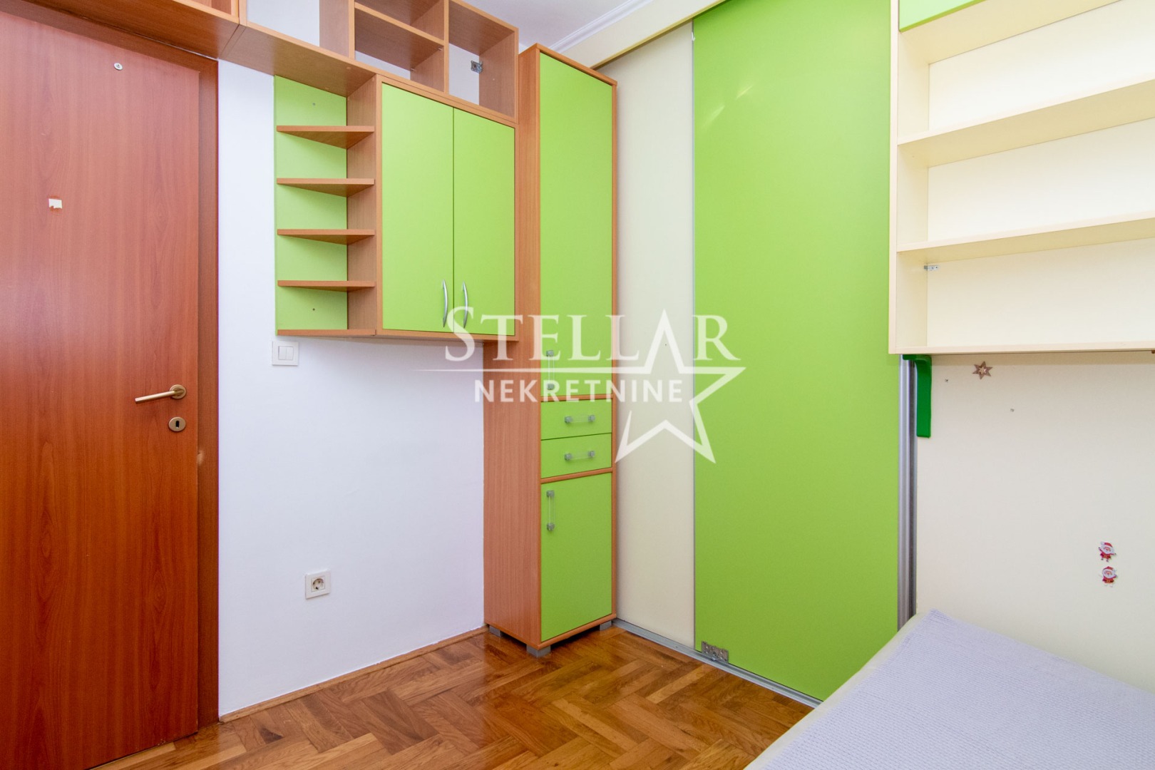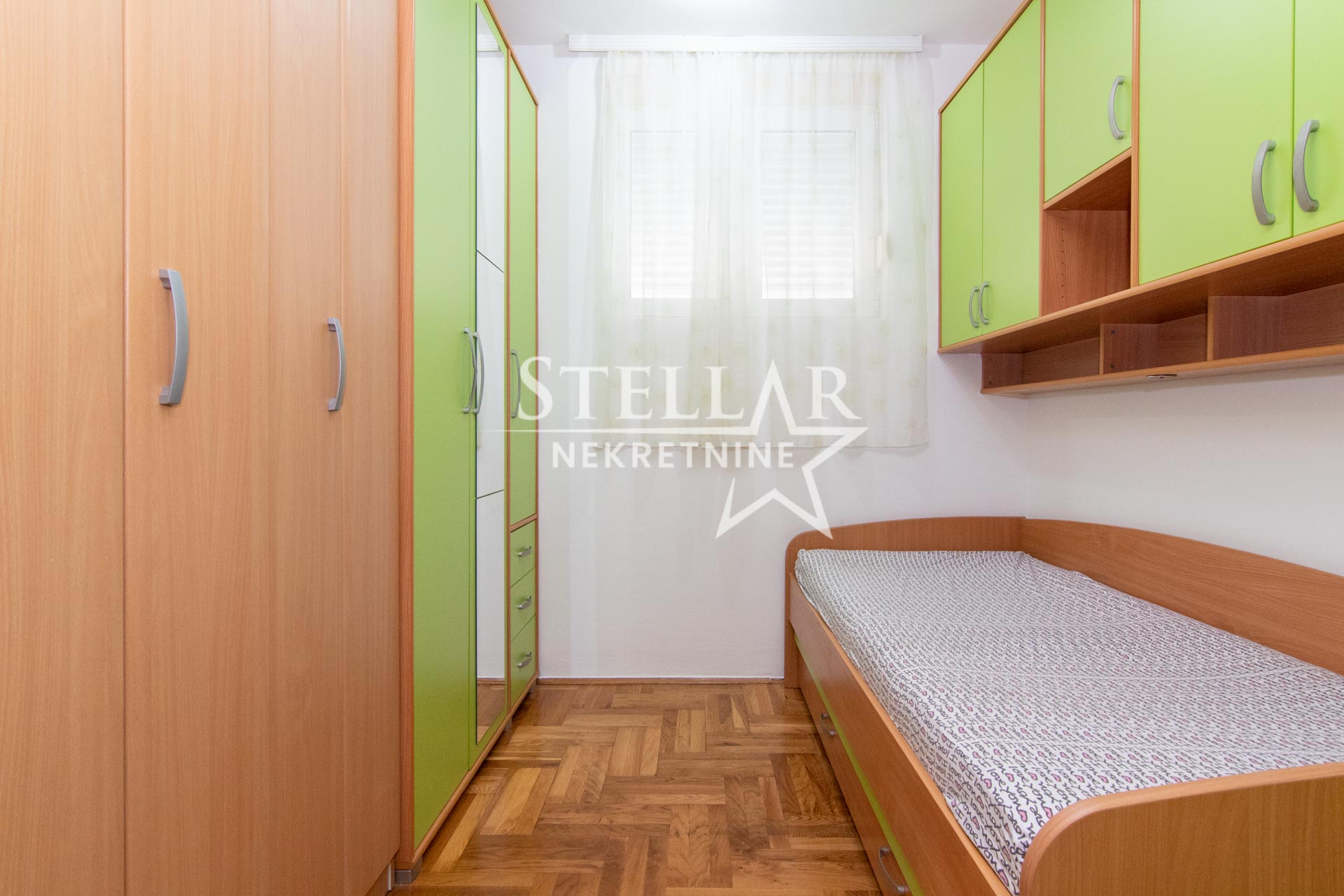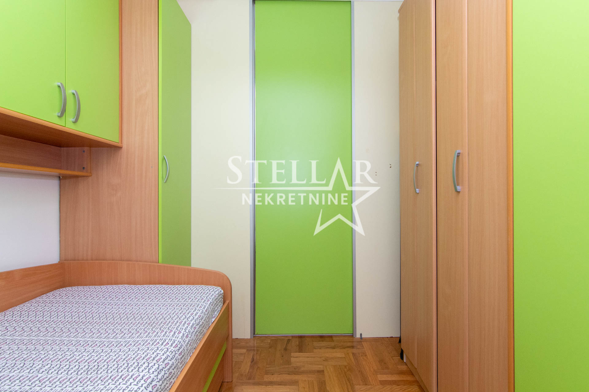 The apartment is 45m2, has a spacious living room with dining room, kitchen, hallway, bathroom and two bedrooms. The two rooms are connected by sliding doors, and the children’s room is entered through the master bedroom, which has a pull-out couch. The rooms have large wardrobes.