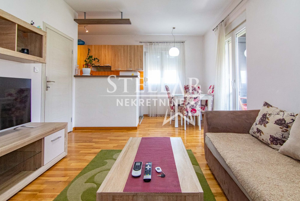 A two-room apartment for rent in a newer building behind the Danica clinic, the building has no elevator, the apartment is on the second floor, facing north. The apartment has 56m2, a large terrace and a parking space. Pets may be possible. The bathroom has a washing machine, the apartment has one air conditioner in the living room, but it is enough to heat/cool the apartment in 15 minutes. It has a dishwasher. In one room there is a double bed, in the other a pull-out sofa.
