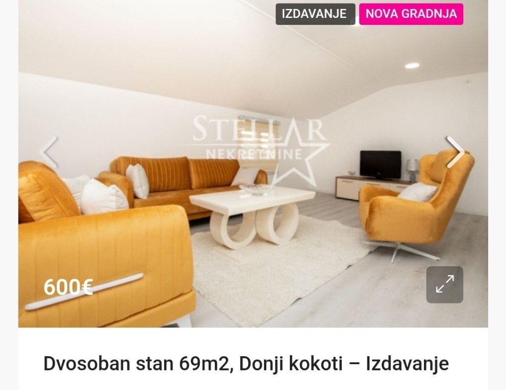 The first floor of a house in Donji Kokoti is for rent. The apartment has 69m2. The apartment has two furnished bedrooms, a living room, a kitchen and a bathroom. Everything is brand new and unused before. In front of the entrance is a small terrace with garden furniture, ideal for a morning coffee or as a place to relax and socialize.