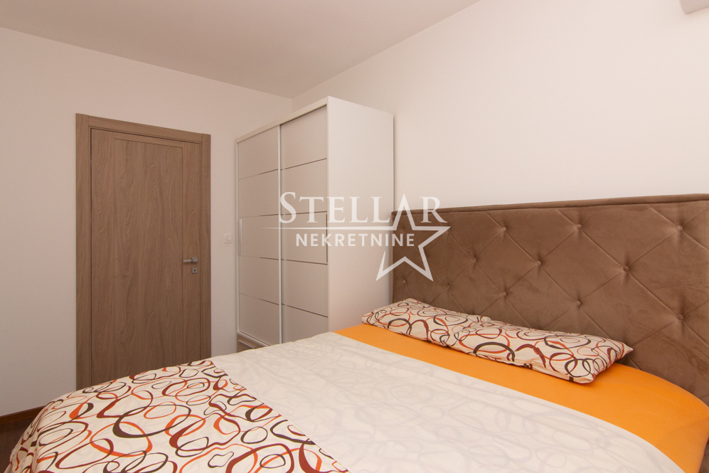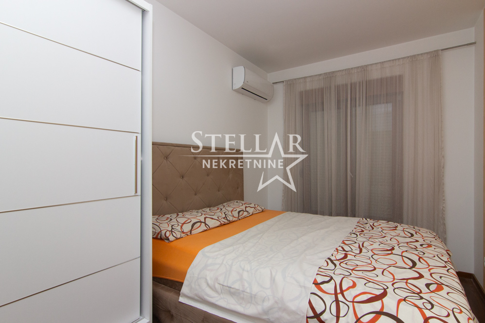 A two-bedroom apartment is for rent in the Master Kvart neighborhood. The apartment is located on the second floor in a building with two elevators. It is fully furnished, has cutlery and bedding. It is southeast oriented, so it is very sunny. There is air conditioning in every room, and among other appliances it has a dishwasher.