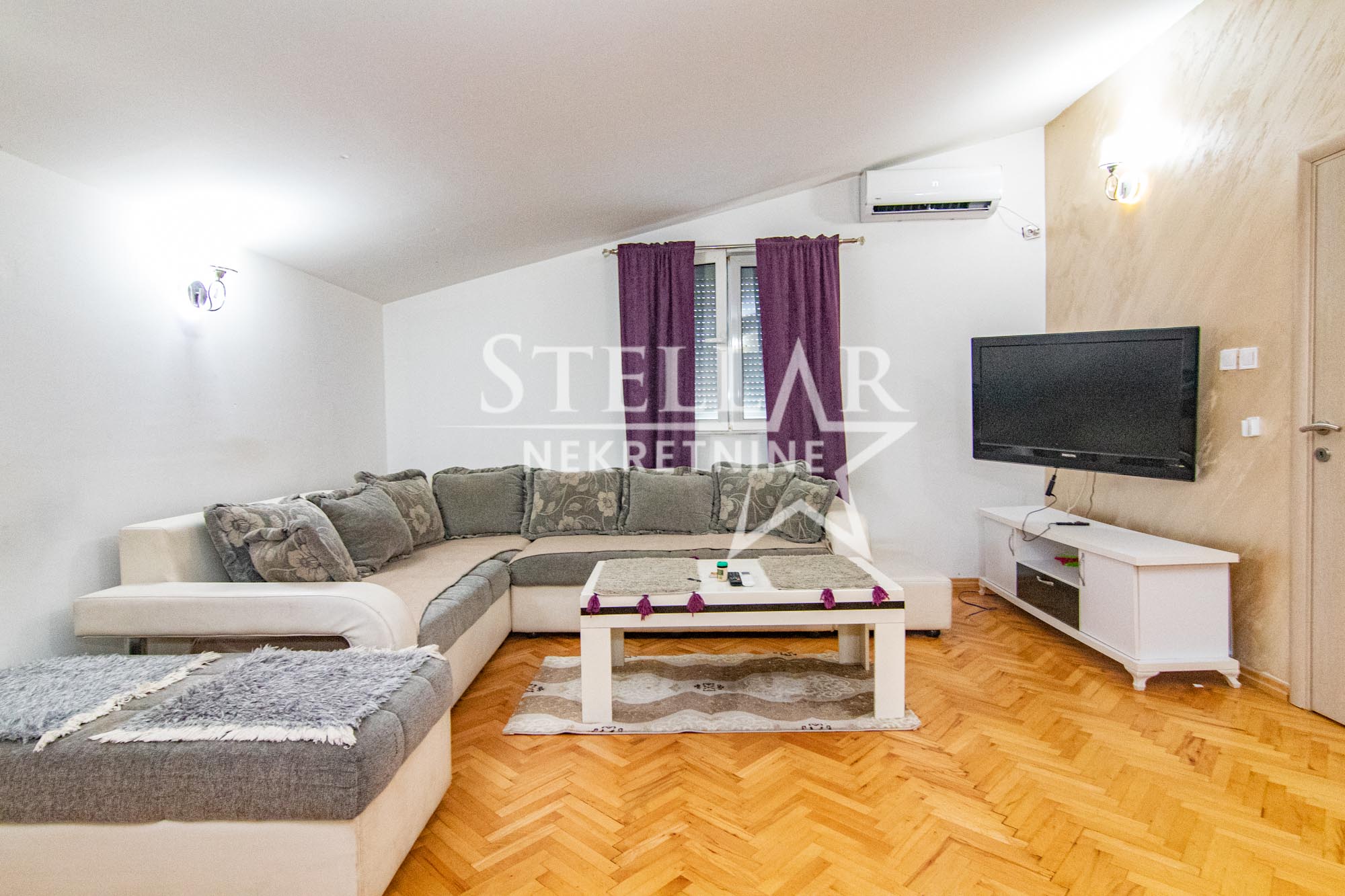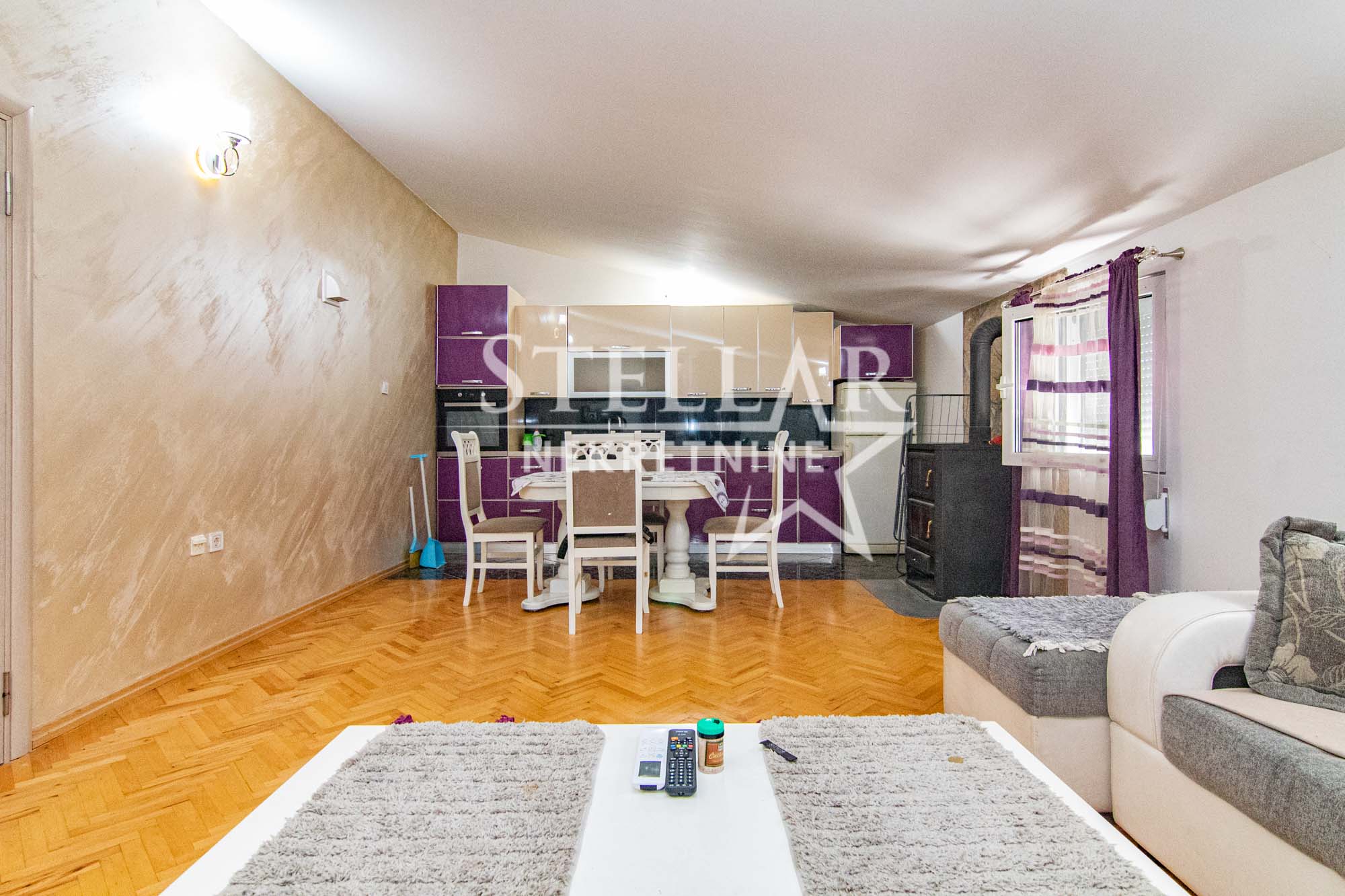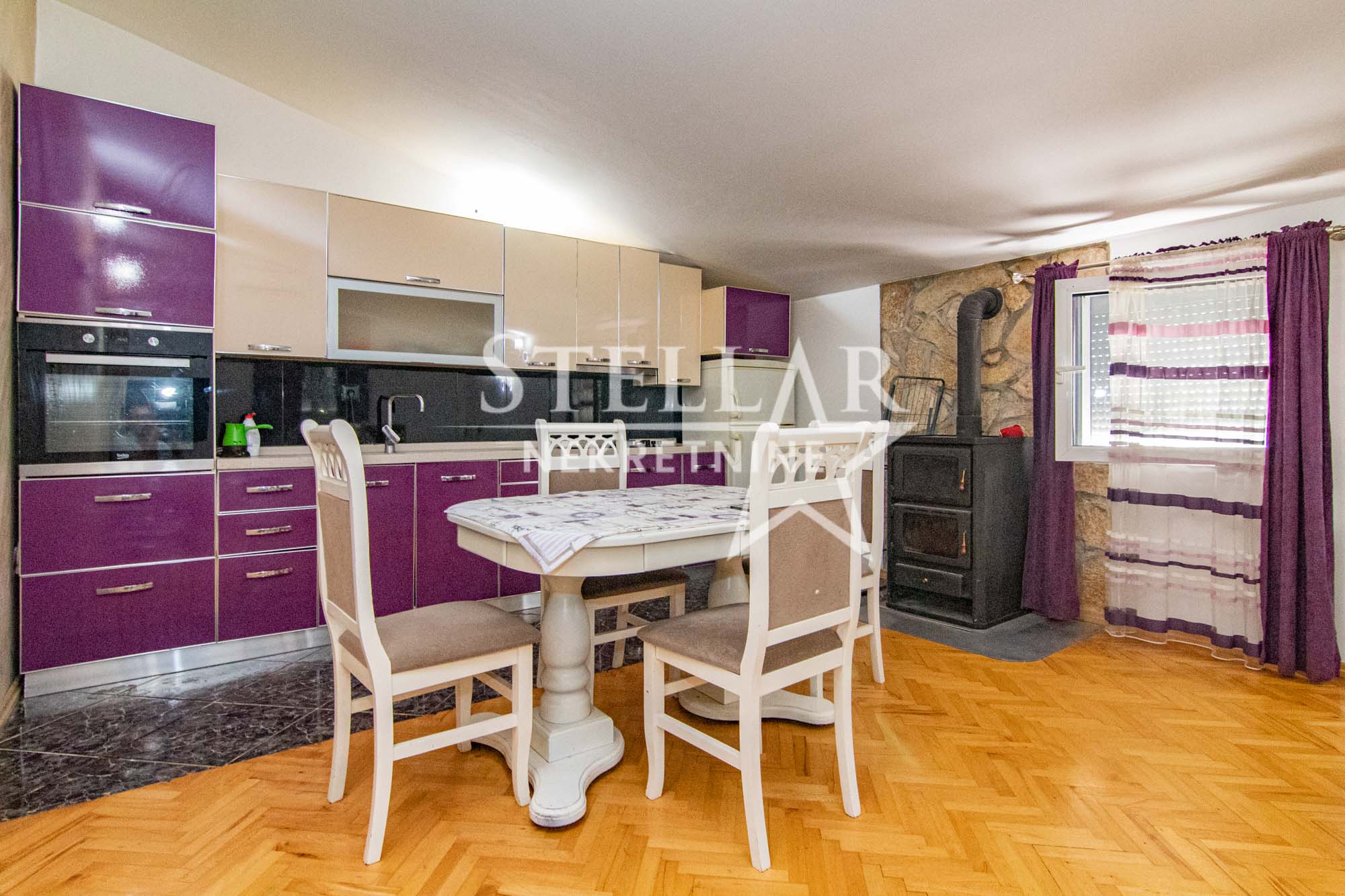 Furnished two-bedroom apartment for rent on the first floor of a house in Tološi. The area is 75m2 plus a terrace. It has air conditioning for cooling and heating, and there is also a wood stove. The bedrooms have double beds and both rooms have windows and closets. There is a washing machine in the bathroom and a dishwasher in the kitchen.