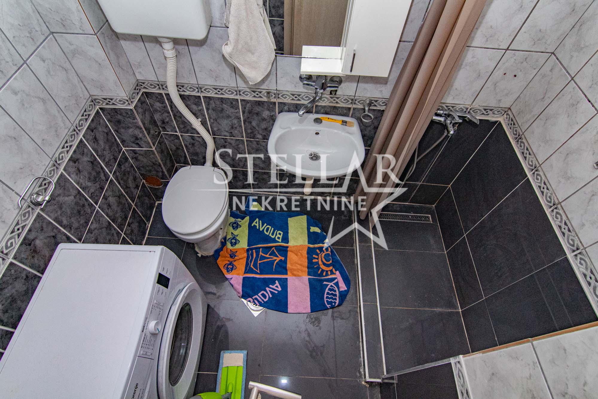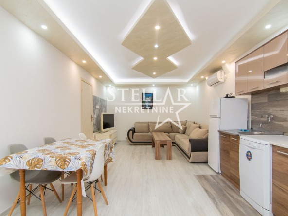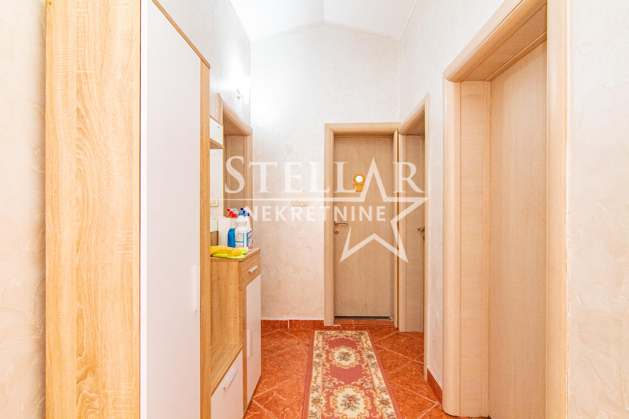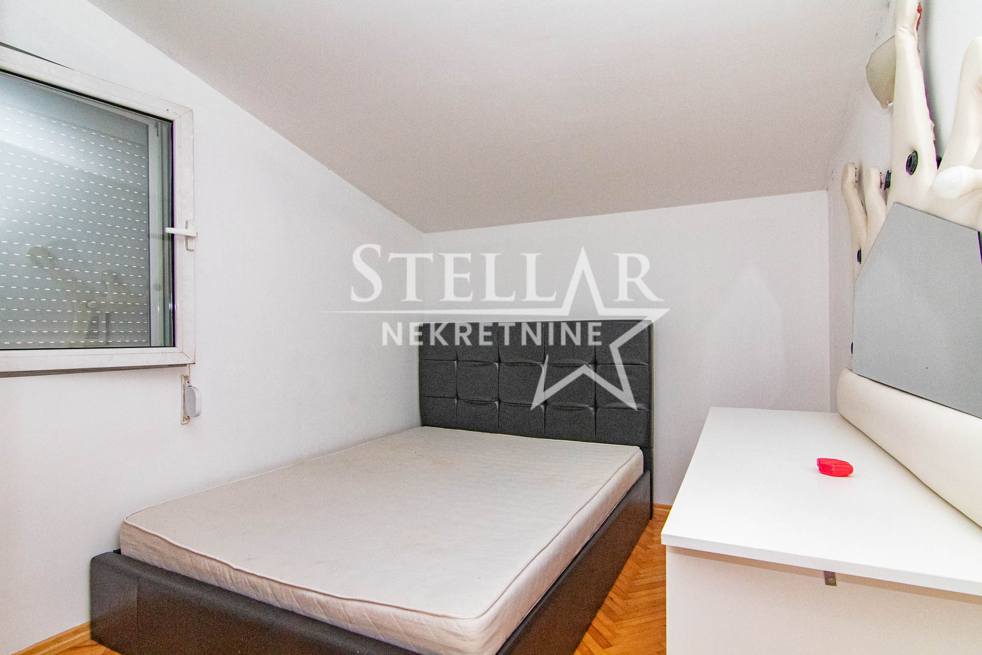 Furnished two-bedroom apartment for rent on the first floor of a house in Tološi. The area is 75m2 plus a terrace. It has air conditioning for cooling and heating, and there is also a wood stove. The bedrooms have double beds and both rooms have windows and closets. There is a washing machine in the bathroom and a dishwasher in the kitchen.