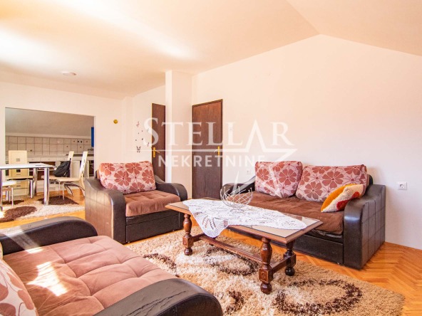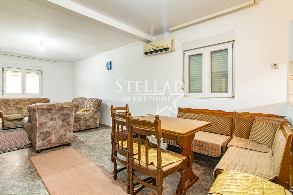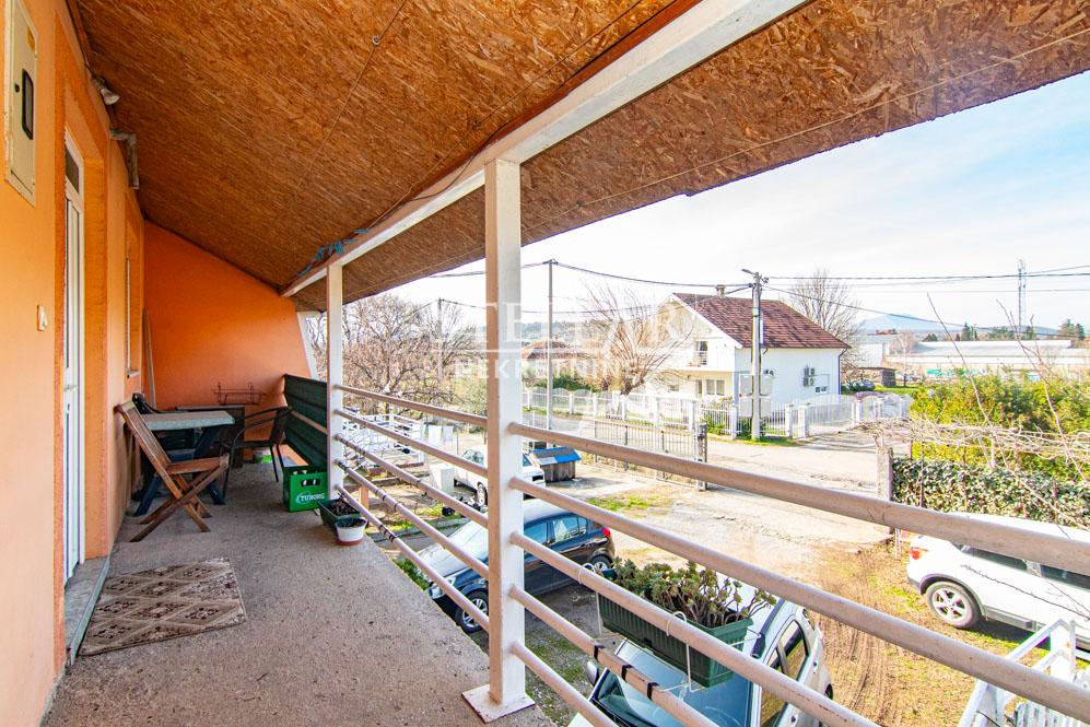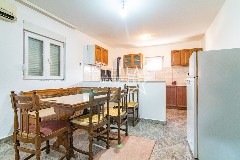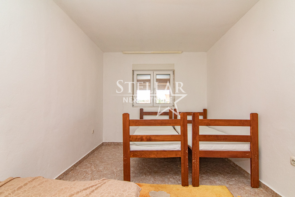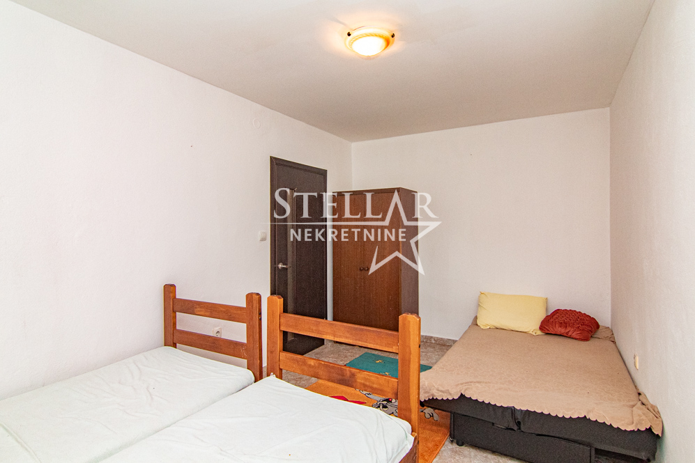 A furnished two-bedroom apartment is for rent on the first floor of a house in Masline. The apartment has a surface area of 90m2. The entrance to the apartment’s hallway is from the covered balcony. The living room, dining room and kitchen form one large room. There are 2 single beds in each bedroom. The kitchen has an electric stove and a wood stove. The living room has air conditioning. There is parking for one car in front of the house.
