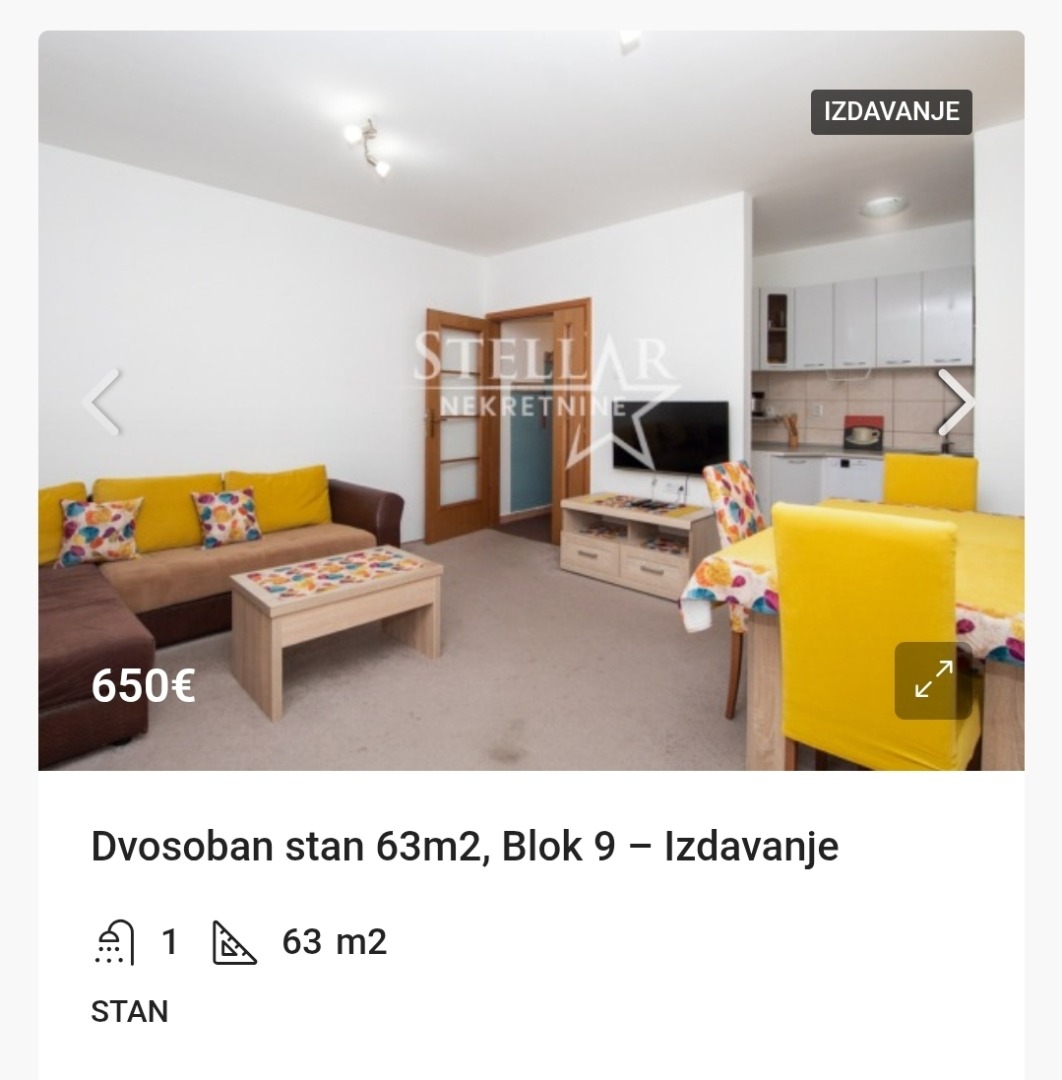Izdaje se dvosoban stan u naselju Blok 9. Stan se nalazi na prizemlju, a balkoni gledajuna dvorišnu stranu zgrade.