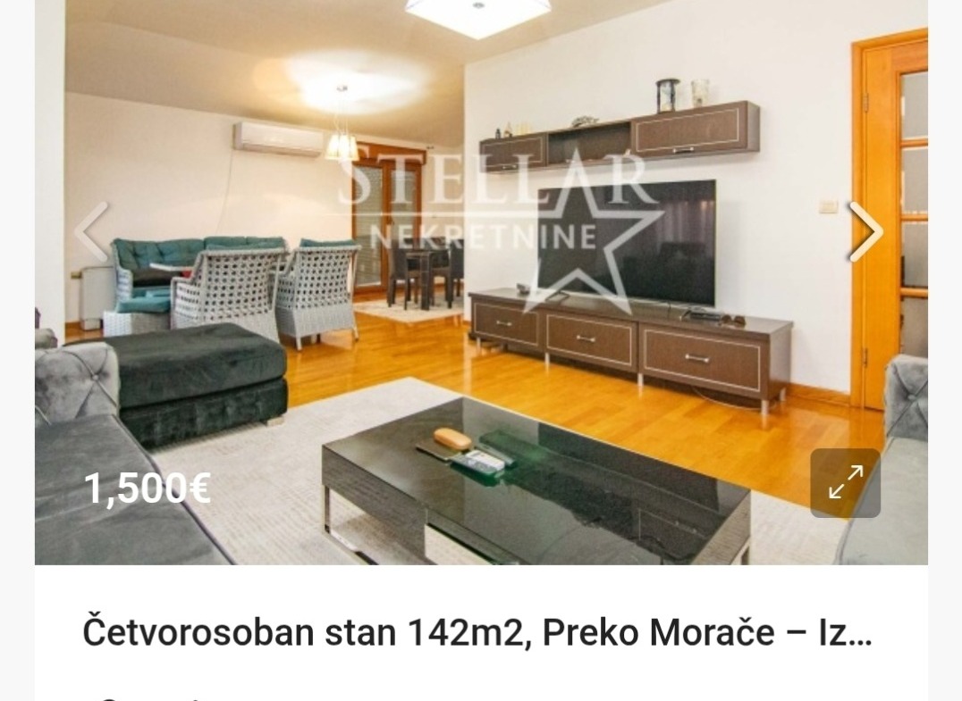 Izdaje se lijepo namješten četvorosoban stan na 6. spratu Maksim zgrade Preko Morače. Stan se nalazi na ćošku zgrade, sa pogledom na jug i zapad grada. Balkoni se protežu po čitavoj južnoj strani i dijelu zapadne strane. Svaka prostorija u stanu ima izlaz na balkone.