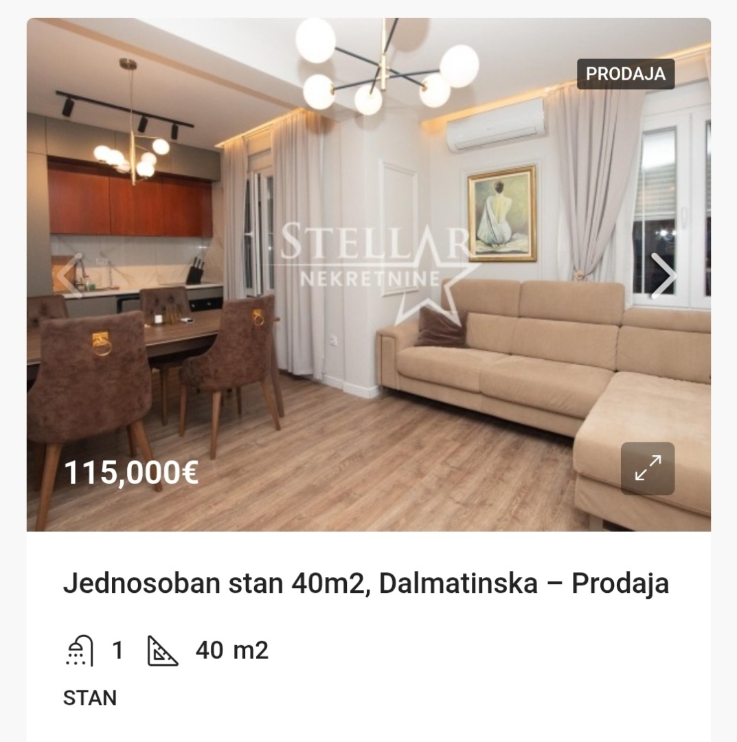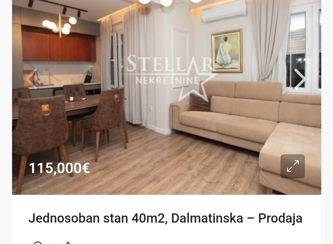 Prodaje se potpuno opremljen jednosoban stan. Stan je površine 40m2, nalazi se u Dalmatinskoj ulici, na prizemlju manje zgrade. Opremljen je tako da u malom prostoru ima dovoljno prostora za sve. Stan je zapadno orijentisan pa je veoma osunčan u posle podnevnim časovima. Postoji mogućnost dogradnje balkona ili privatnih stepenica i ulaza.
