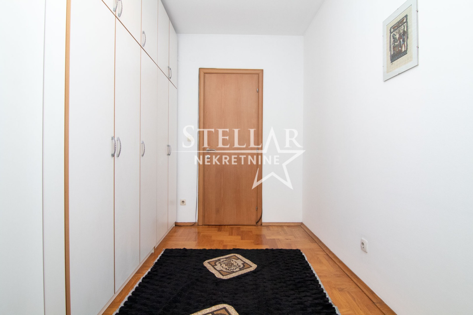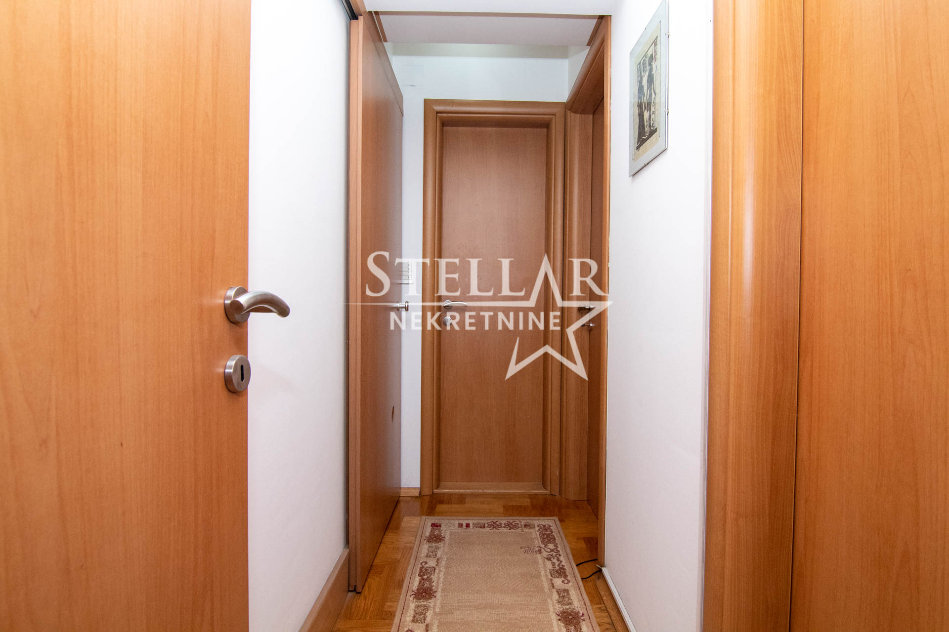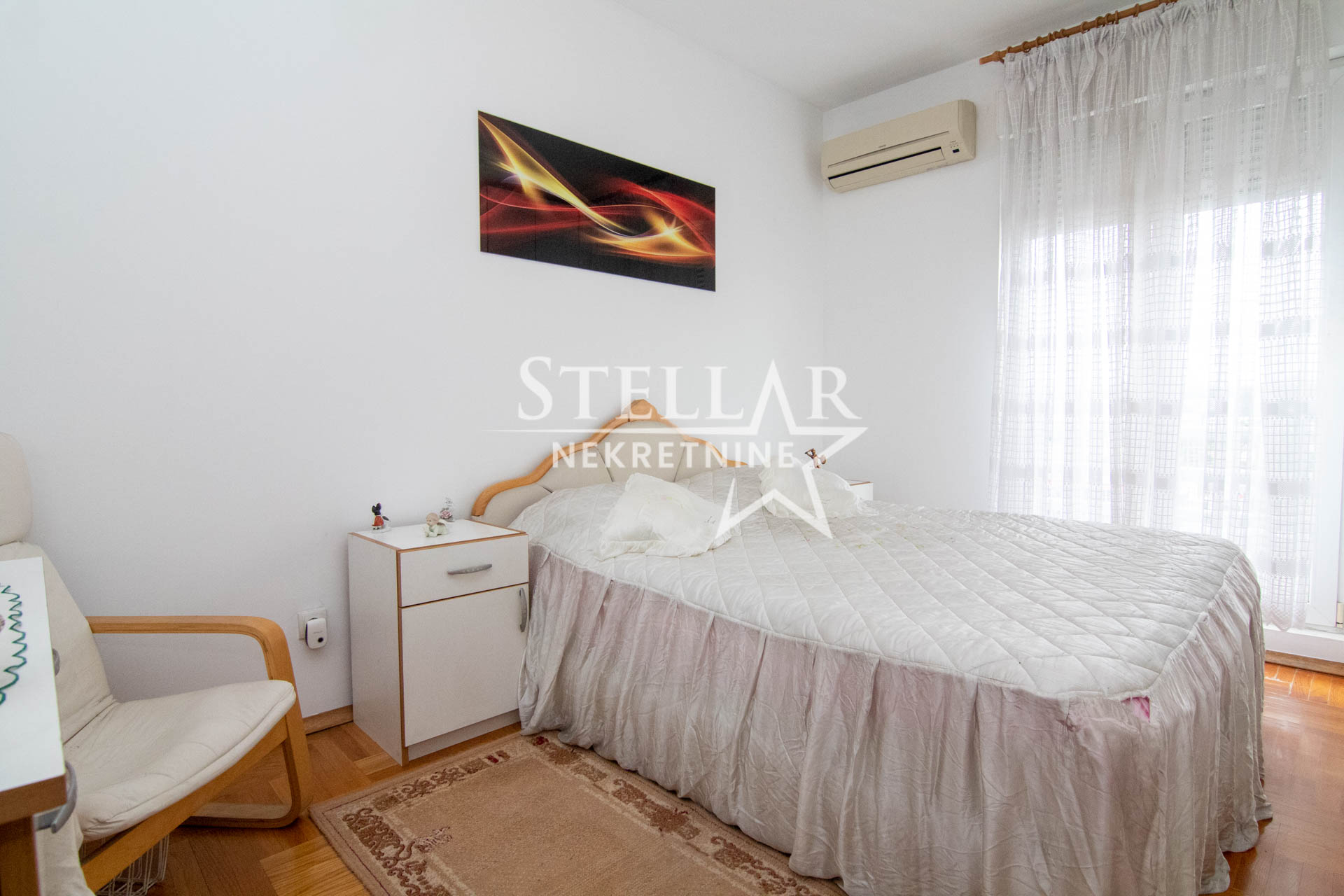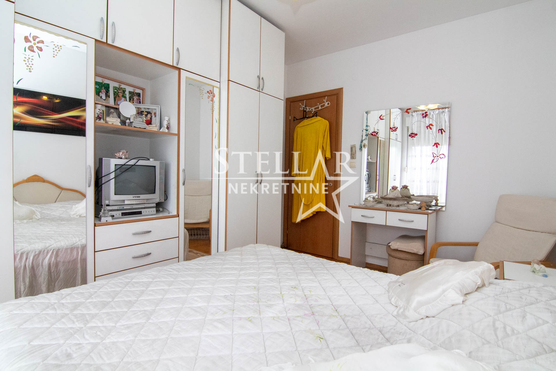 U jednoj spavaćoj sobi je francuski krevet a u drugoj bi se ubacio krevet po potrebi stanara. Stan je zapadne orijentacije, odnosno balkoni i prozori su okrenuti ka centru grada. Klimatizovan je sa po jednom klimom u dnevnoj i većoj spavaćoj sobi. Ima i toalet i kupatilo, kao i ostavu gdje je mašina za veš.