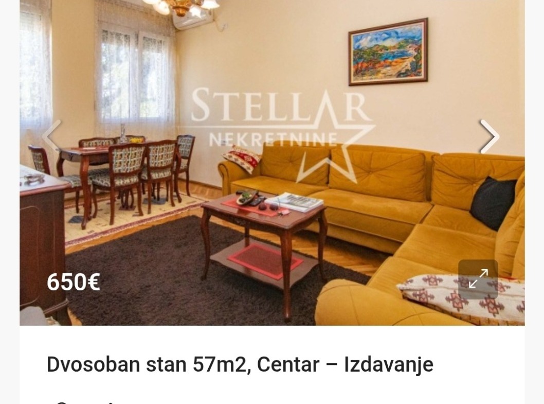 Izdaje se dvosoban stan u centru grada. Stan je poptuno opremljen. Ima dug hodnik i dvije prostrane spavaće sobe. Pravi predstavnik stanova u starogradnji. Pošto je modifikovan, ovaj stan nema balkon ili terasu, međutim spavaća soba i dnevna soba imaju po dva prozora, a kuhinja takođe ima svoje prozore, pa je stan u svako doba dana veoma dobro osvijetljen.