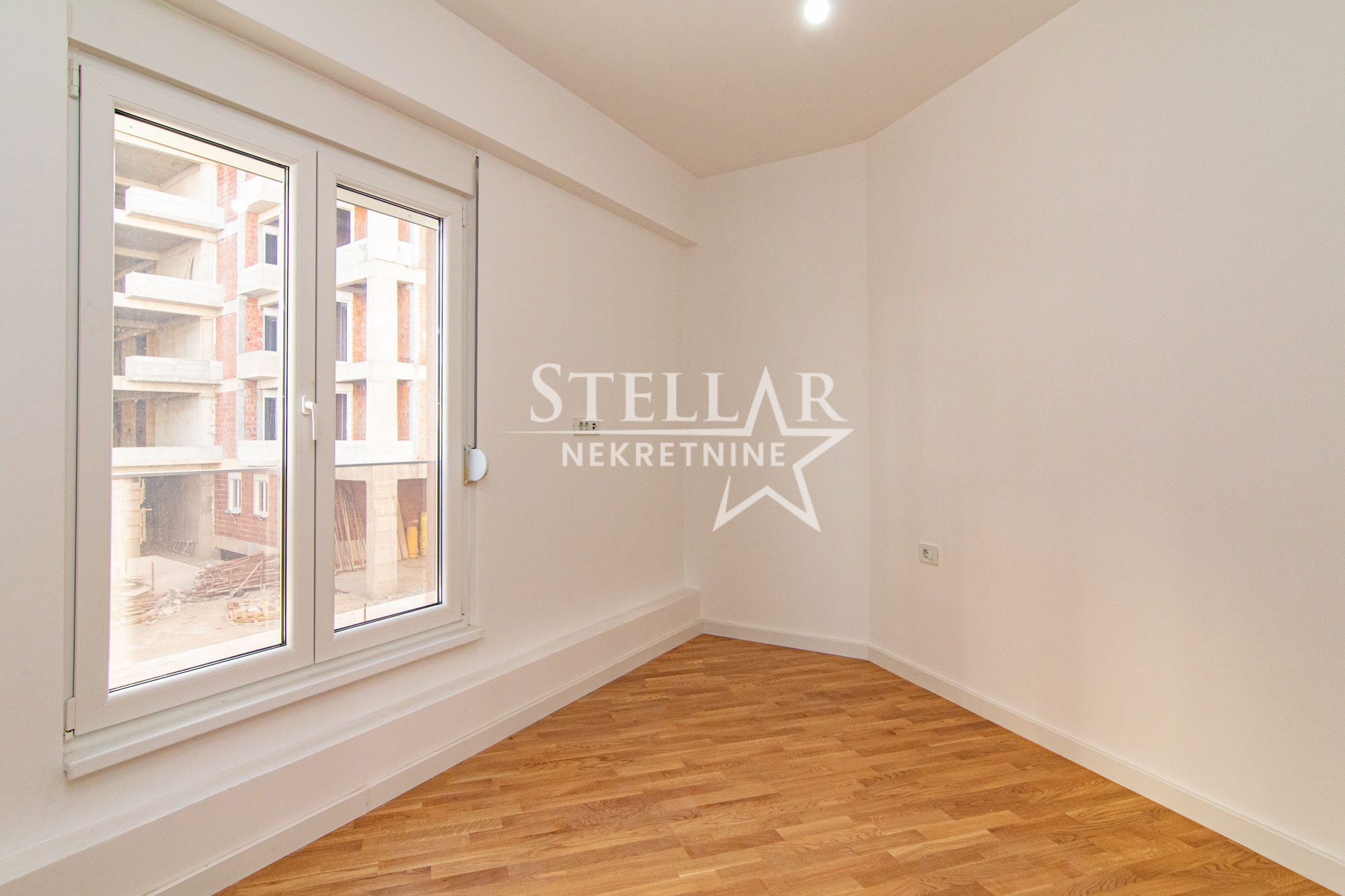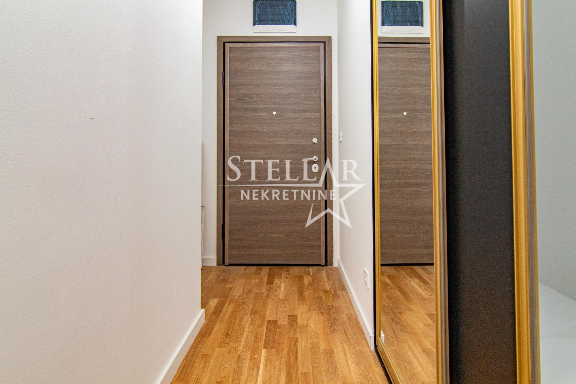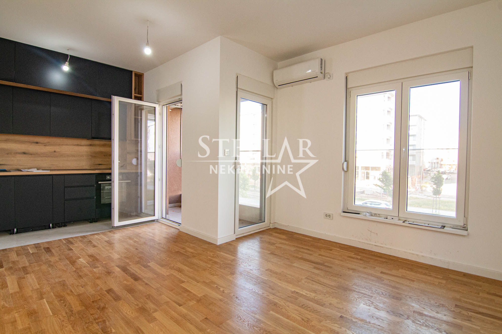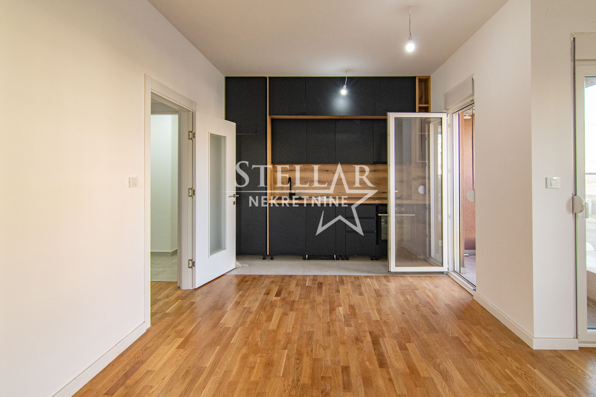 Stan je površine 67m2, orijentacija istok-zapad, sa balkonom koji komunicira sa kuhinjom i trpezarijom. Kuhinja je odvojena od trpezarije, a ova je odvojena od dnevnog boravka. Stan ima jednu klimu u dnevnoj sobi. Stan ima plakare i ormare u svim prostoroijama, kao i cipelar u hodniku.