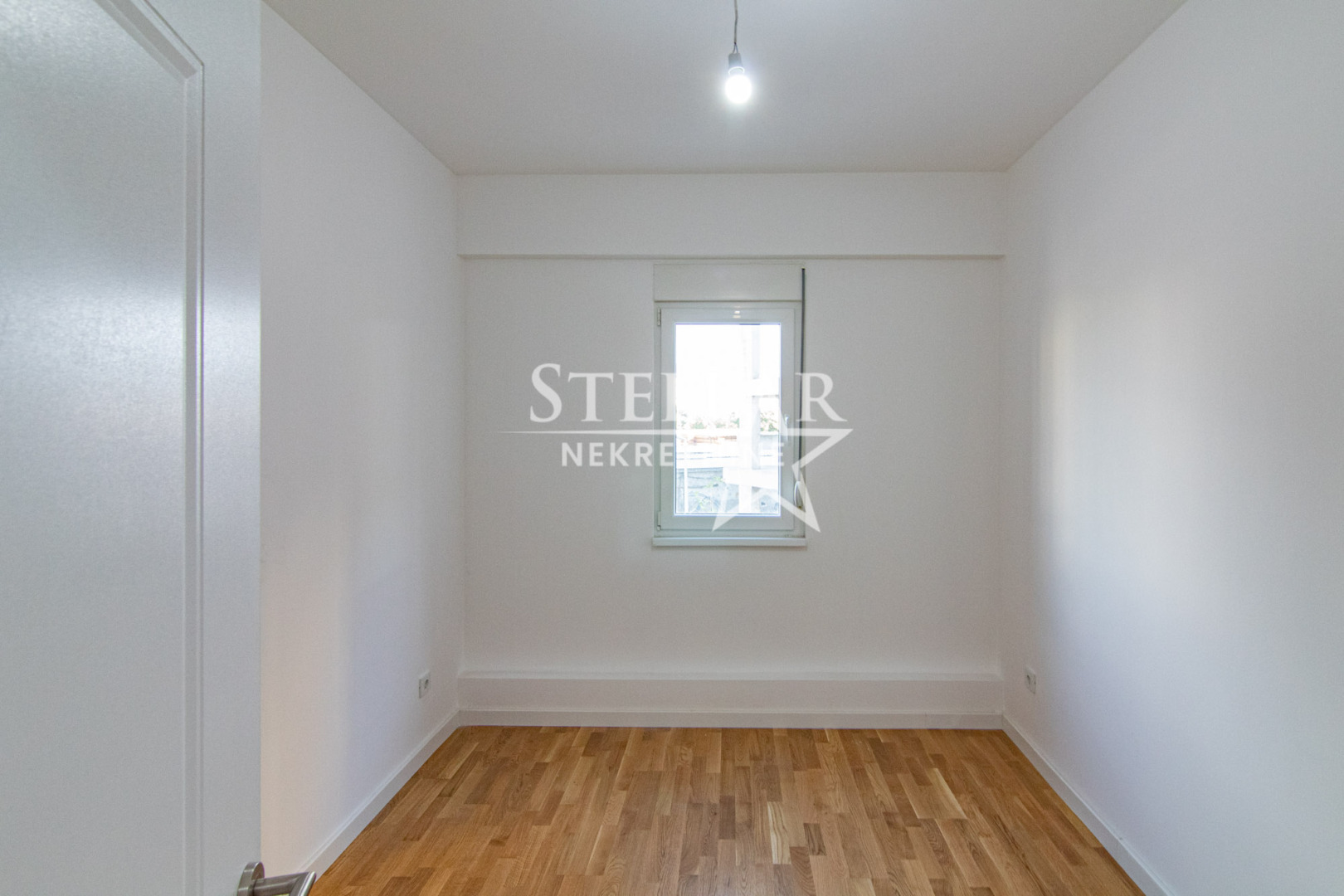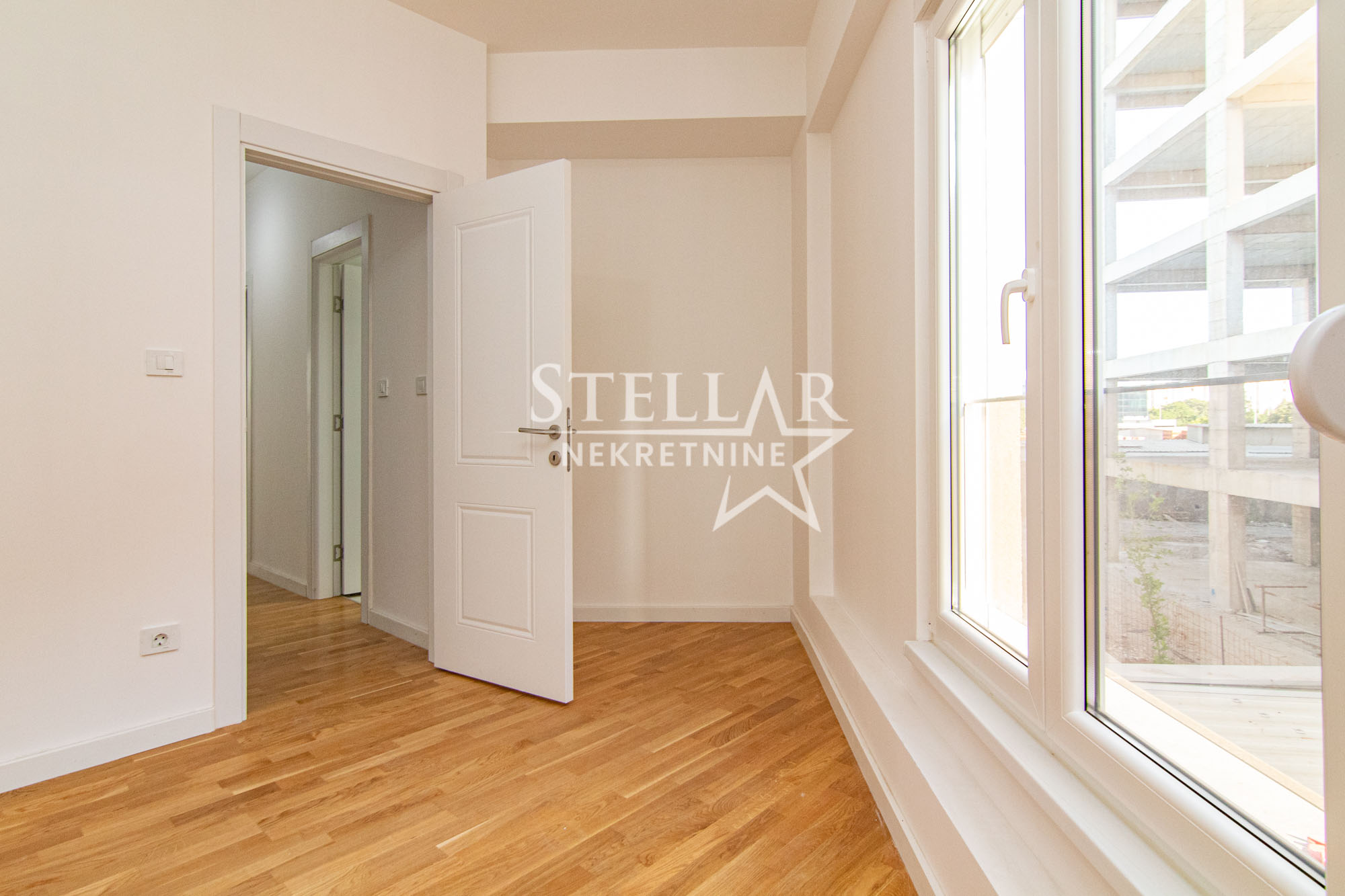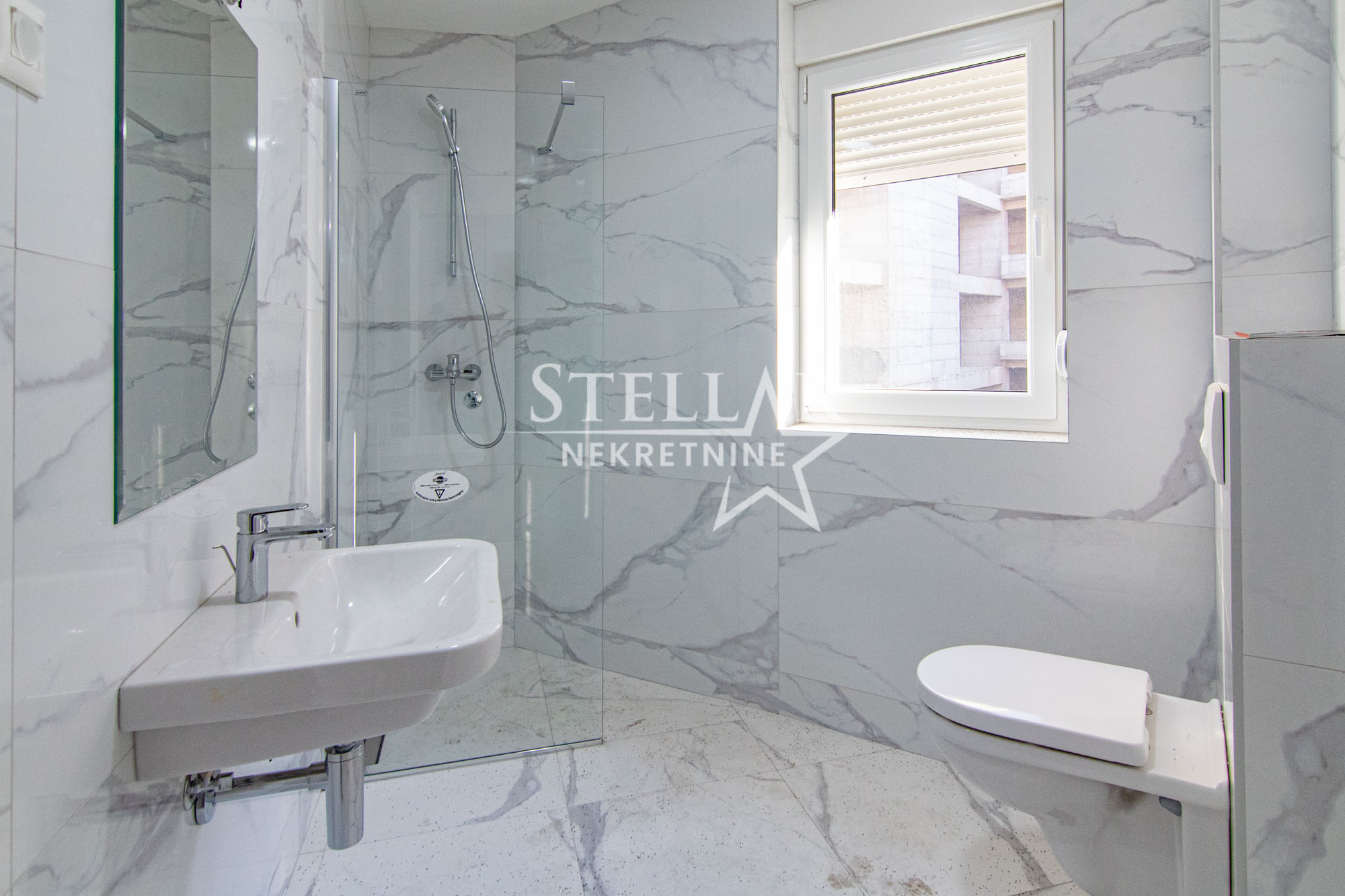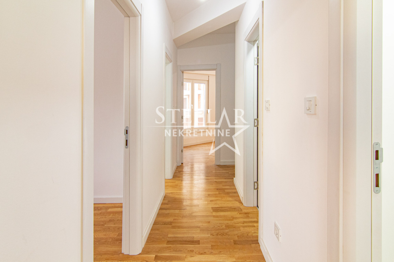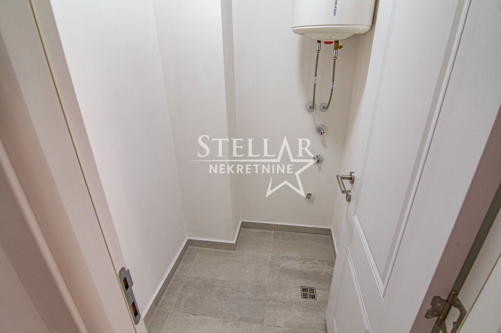 Stan je površine 67m2, orijentacija istok-zapad, sa balkonom koji komunicira sa kuhinjom i trpezarijom. Kuhinja je odvojena od trpezarije, a ova je odvojena od dnevnog boravka. Stan ima jednu klimu u dnevnoj sobi. Stan ima plakare i ormare u svim prostoroijama, kao i cipelar u hodniku.