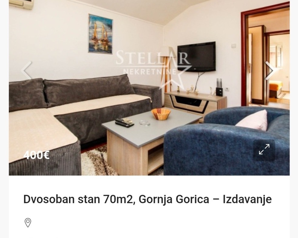 Izdaje se dvosoban stan u kući u naselju Gornja Gorica. Stan je na spratu, veoma prostran, ukupne površine 70m2. Struktura stana je široki hodnik, koji vodi do svih prostorija, dnevna soba, sa kuhinjom i trpezarijom i izlazom na terasu, zatim dvije spavaće sobe i kupatilo. Stan je u veoma dobrom stanju.