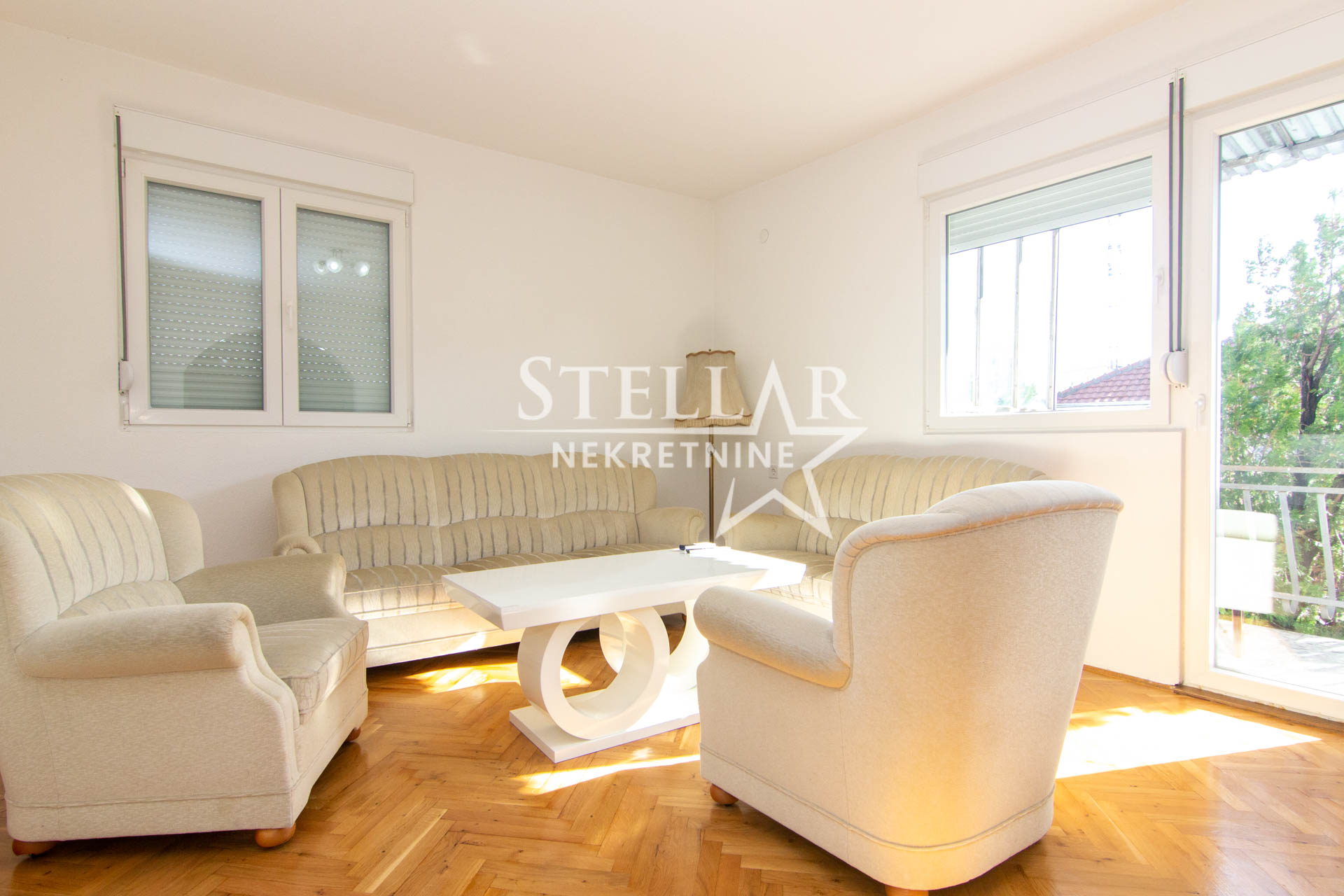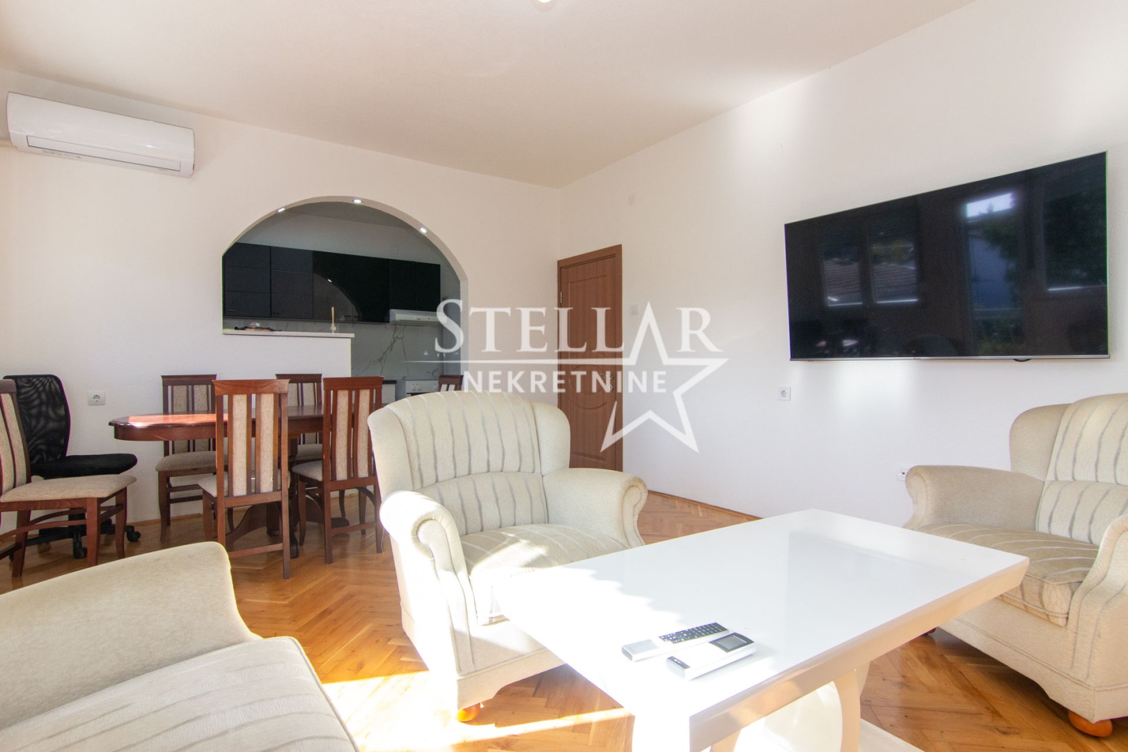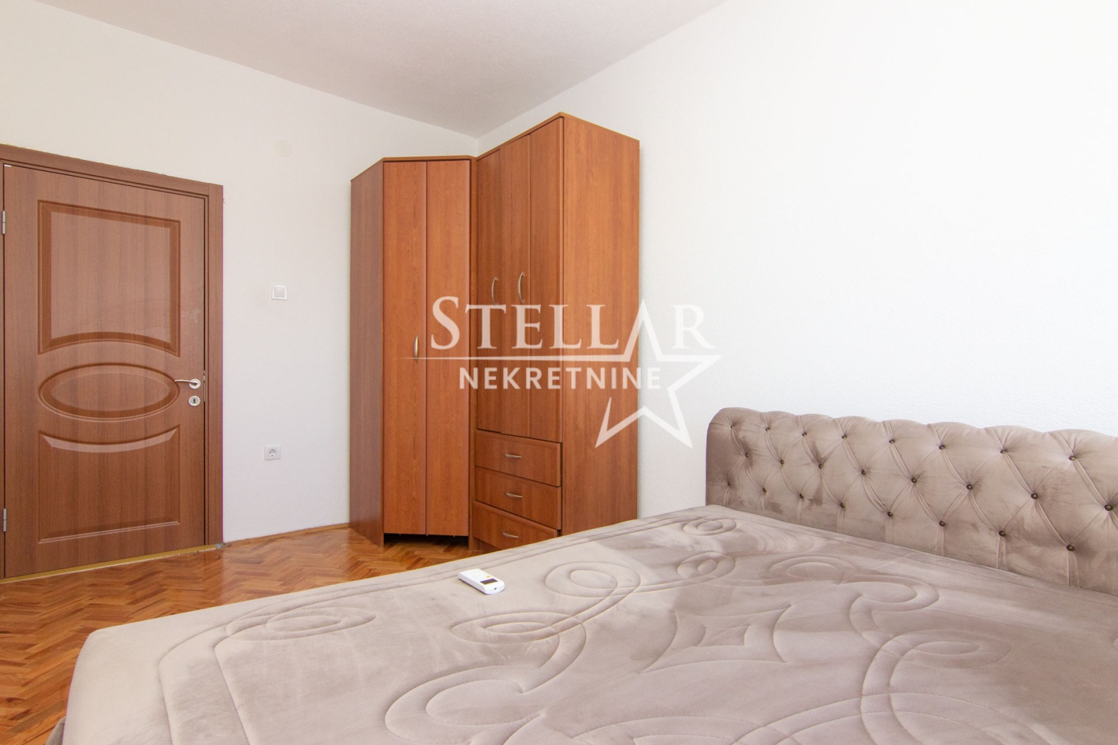 Izdaje se u potpunosti namješten dvosoban stan u kući 91m2. Stan se nalazi n aprvom spratu kuće. Stan ima 3 klima uredjaj u dnevnoj sobi i u dvije spavaće sobe. Od ostale tehnike posjeduje mašinu za veš. U stanu nijesu dozvoljeni kućni ljubimci.