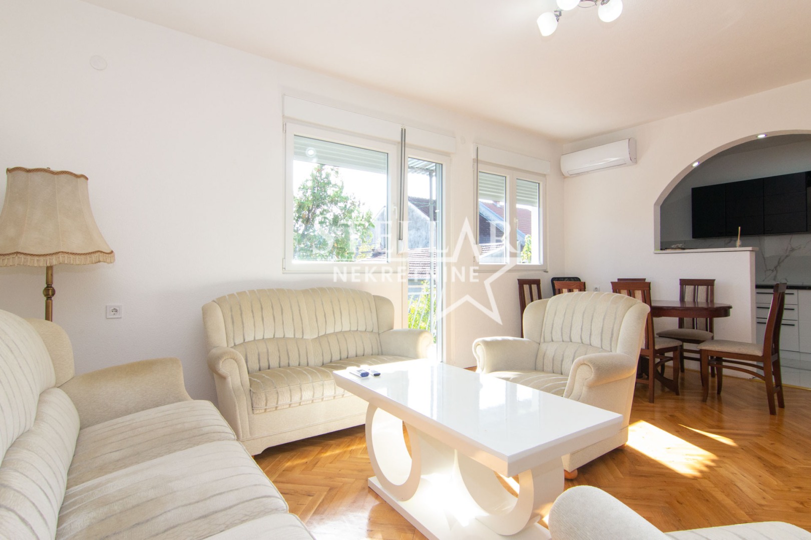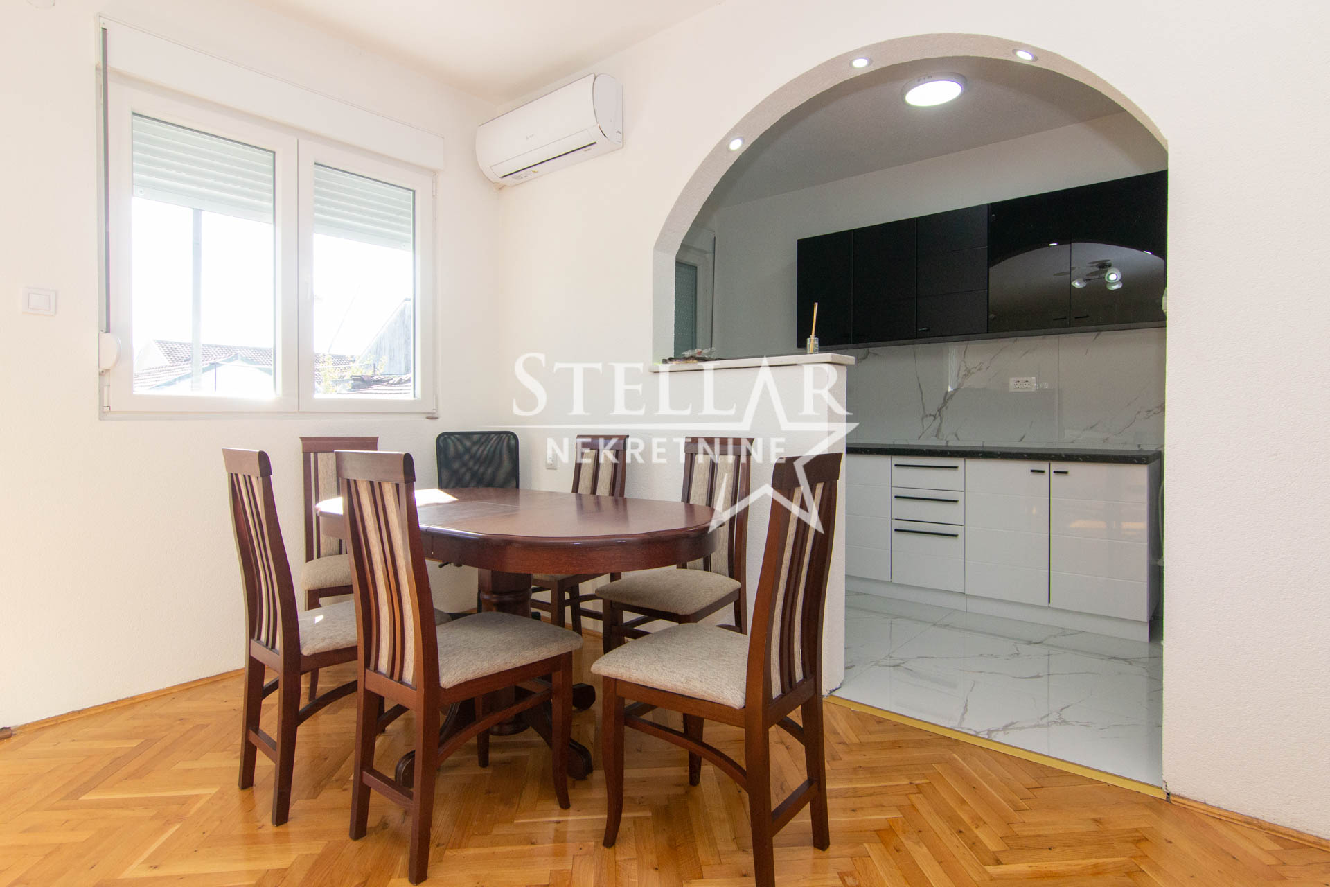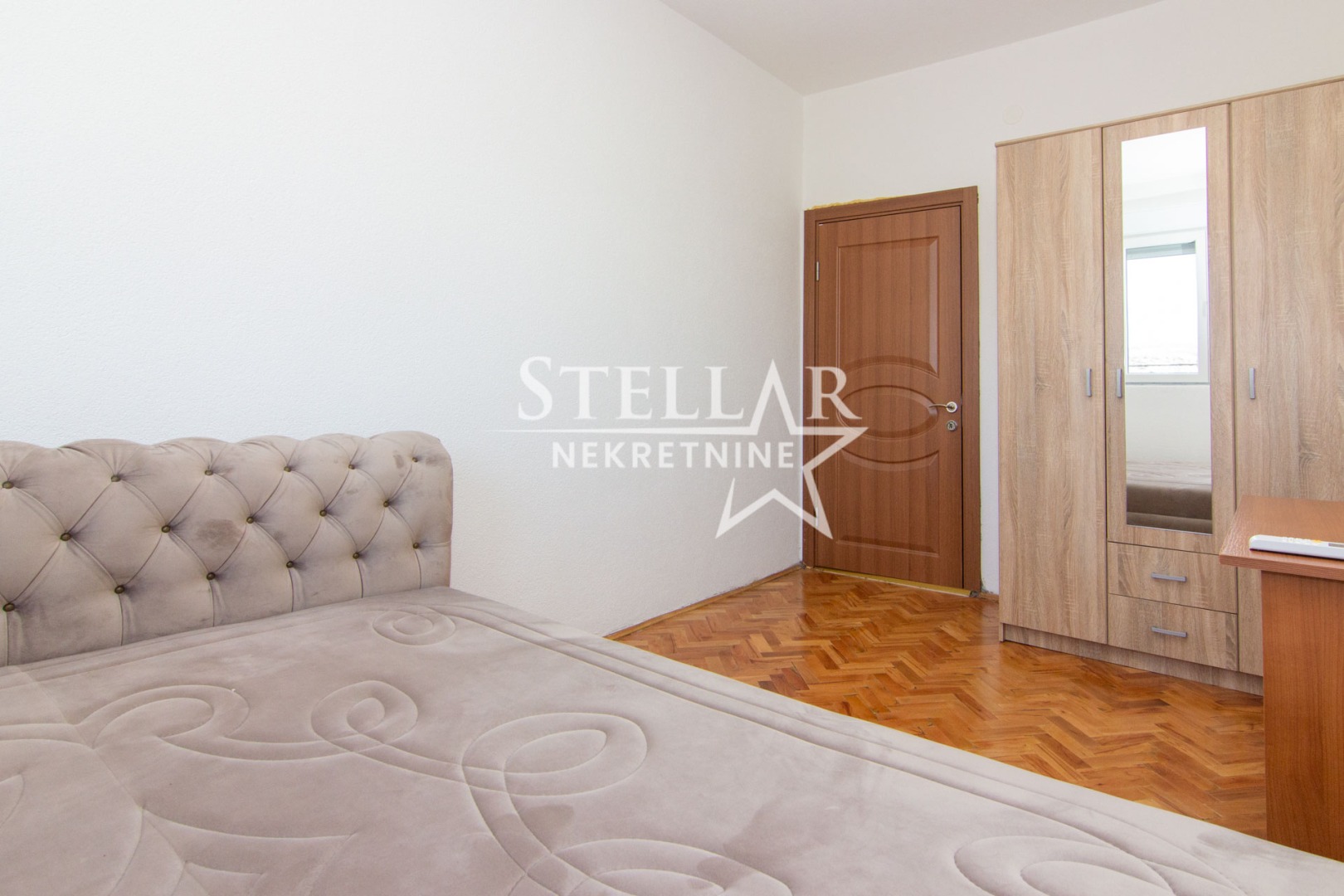 Izdaje se u potpunosti namješten dvosoban stan u kući 91m2. Stan se nalazi n aprvom spratu kuće. Stan ima 3 klima uredjaj u dnevnoj sobi i u dvije spavaće sobe. Od ostale tehnike posjeduje mašinu za veš. U stanu nijesu dozvoljeni kućni ljubimci.