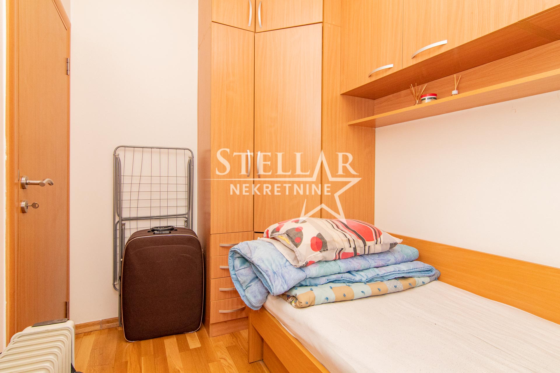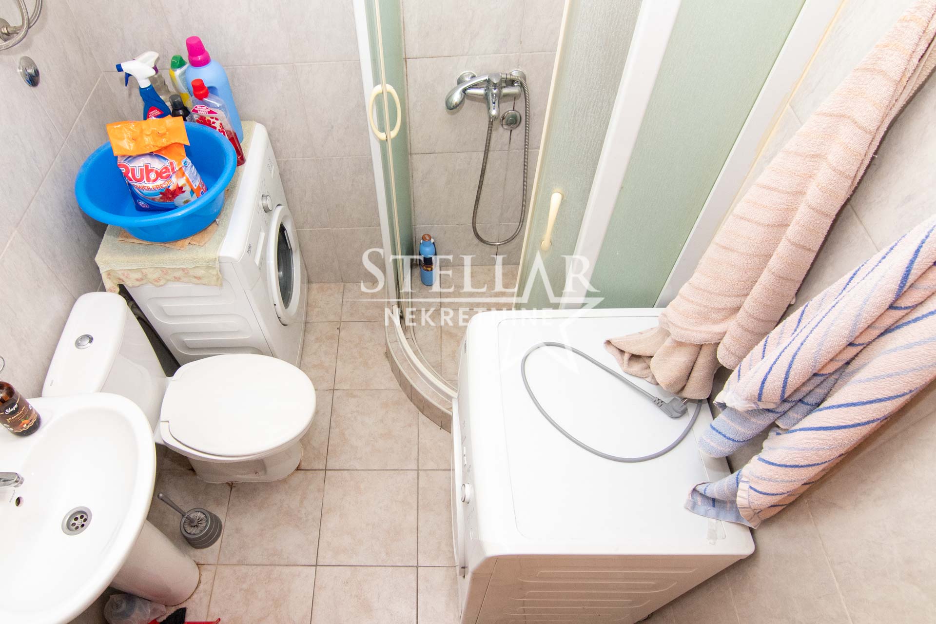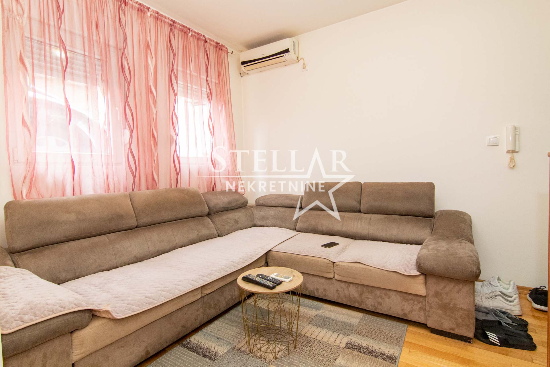 Izdaje se namješten jednosoban stan u niskom prizemlju stambene zgrade na Zabjelu, blizu Multicoma. Stan je veoma dobro osvijetljen, u svakoj prostoriji ima prirodne dnevne svjetlosti. Stan se grije i hladi pomoću klima uredjaja, a u kupatilu su dvije mašine – za pranje i sušenje veša.