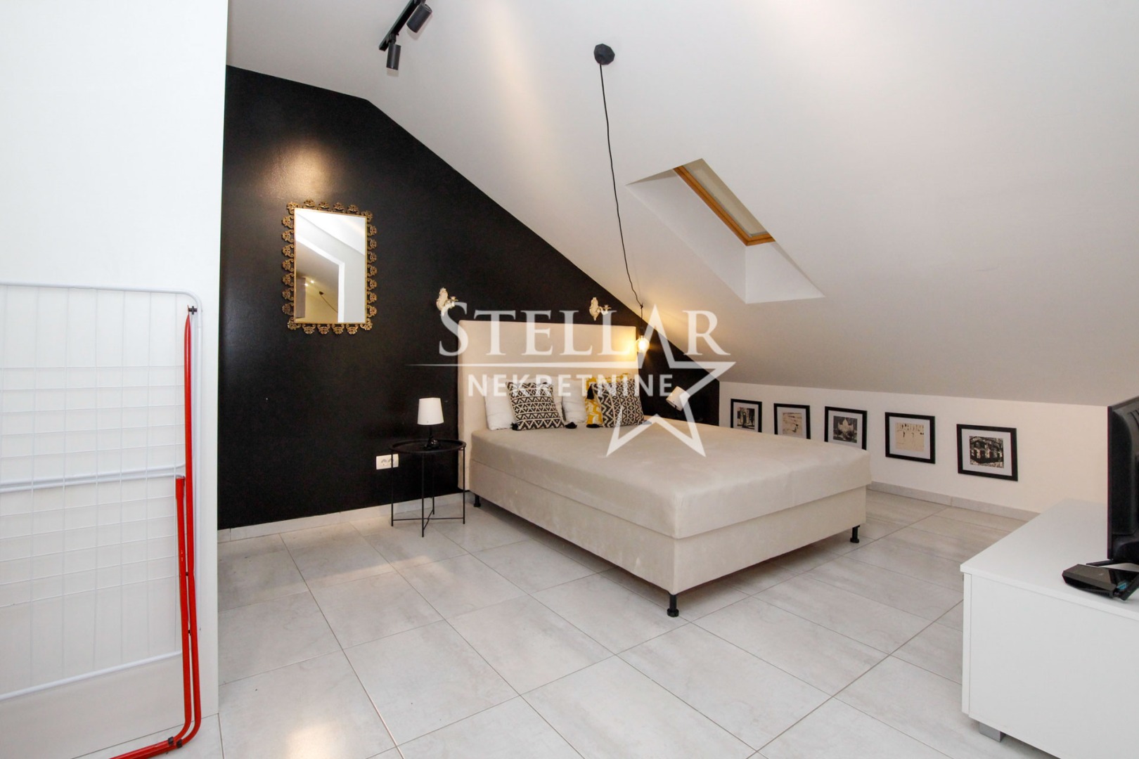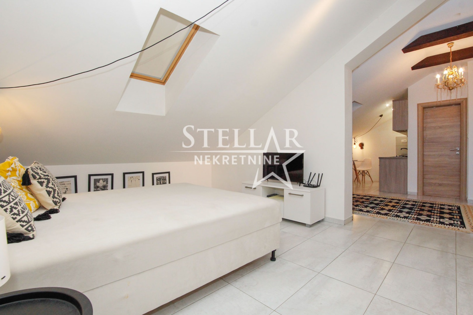 Površina stana je zbog kosog krova svedena an 35m2, a suštinski stan je veće površine. Spavaća soba nije jasno separisana od ostatka stana, već je sve povezano kao cjelina, pa se time dobija osjećaj izuzetne prostranosti u stanu.