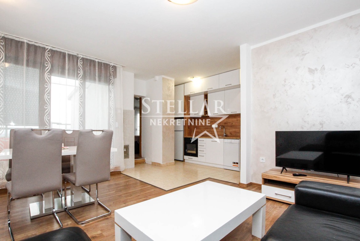 Stan se nalazi na 12. spratu stambene zgrade i izdaje se potpuno namješten. U spavaćoj sobi se nalazi francuski ležaj, dok je kuhinja opremljena svim potrebnim uređajima, uključujući i mašinu za sudove.