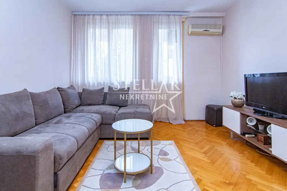 Izdaje se lijepo opremljen jednosoban stan na 3. spratu stambene zgrade na odličnoj lokaciji u Moskovskoj ulici preko puta Maksim zgrade. Stan je istočno orijentisan sa balkonom koji komunicira sa kuhinjom i dnevnom sobom. Stan je renoviran prije par godina i u njemu su noviji namještaj i uređaji. Ima mašinu za veš, mašinu za suđe, tv, jednu klimu, veliki frižider sa zamrzivačem.