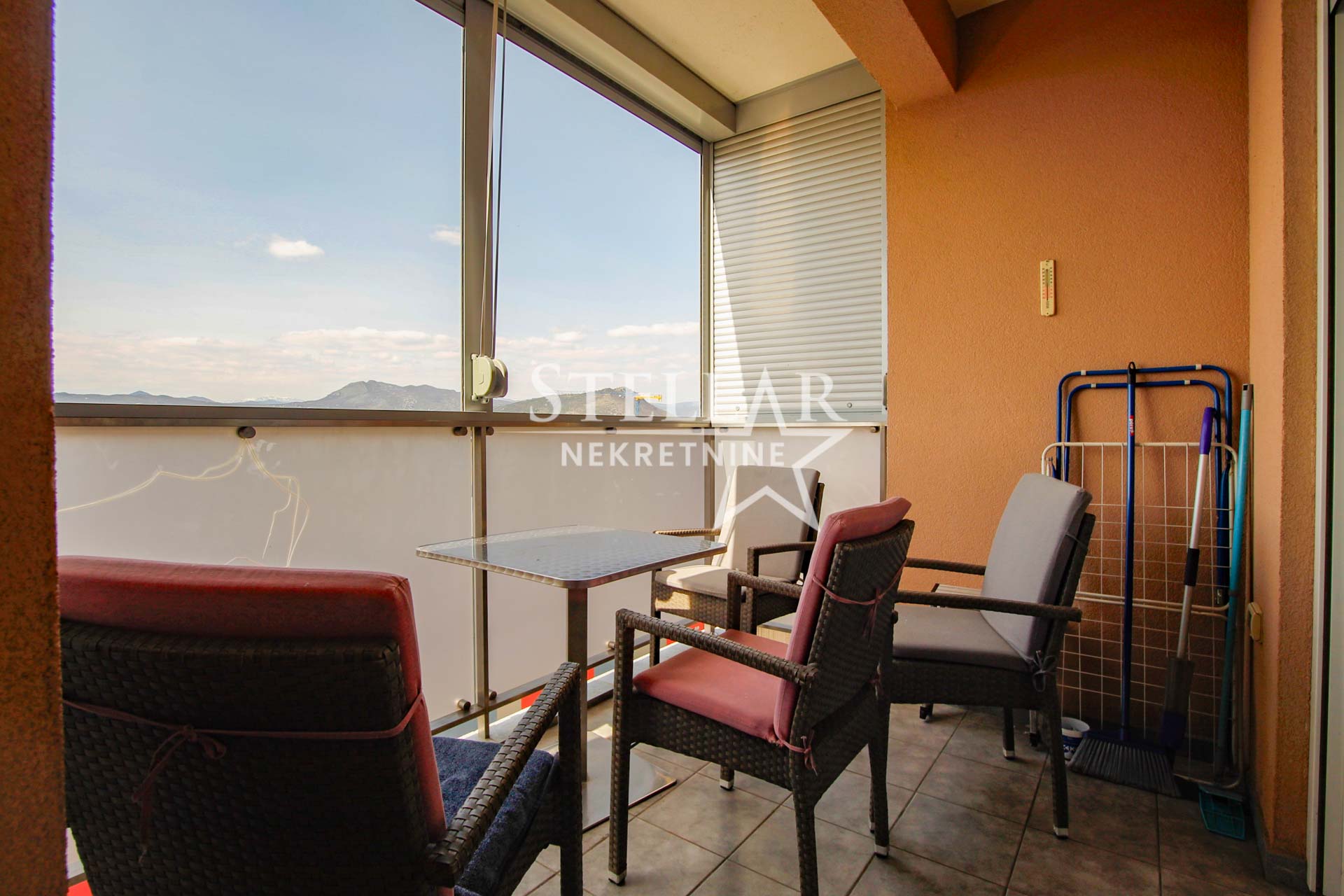 Stan se nalazi na sedmom, ujedno i poslednjem spratu stambene zgrade i ima visoke plafone, što prostoru daje dodatni osjećaj prostranosti. U potpunosti je opremljen i spreman za useljenje.