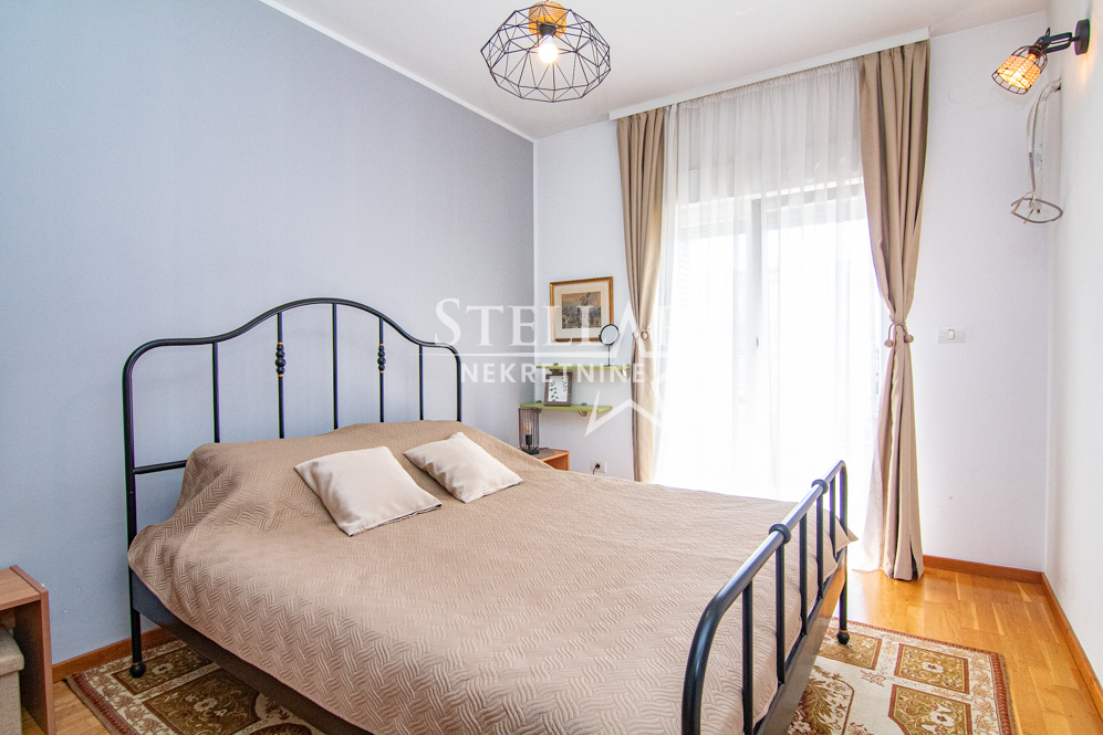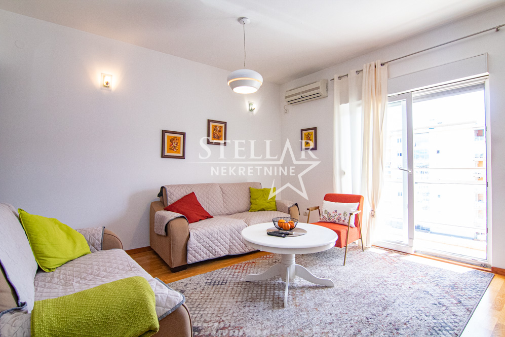 Izdaje se lijepo opremljen jednosoban stan na 5. spratu stambene zgrade u Siti kvartu. Stan je prostran i udoban, površine 53m2 sa balkonom jugoistočne orijentacije koji gleda na Big Fashion i koji komunicira sa spavaćom i sa dnevnom sobom. Stan je klimatizovan, a zgrada ima lift. Uz stan dođe i kartica za parking.