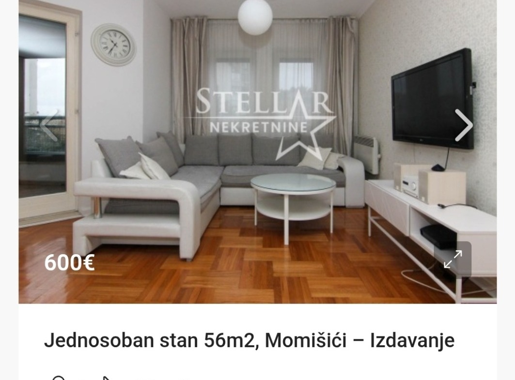 Izdaje se u potpunosti namješten jednosoban stan 56m2 u Momišićima. Nalazi se na trećem spratu u zgradi sa liftom. Orijentacija stana je zapadna. U dnevnom boravku se nalazi klima uredjaj, a od ostale tehnike ima veš mašinu i mašinu za sudje. Stan nije pet-friendly.