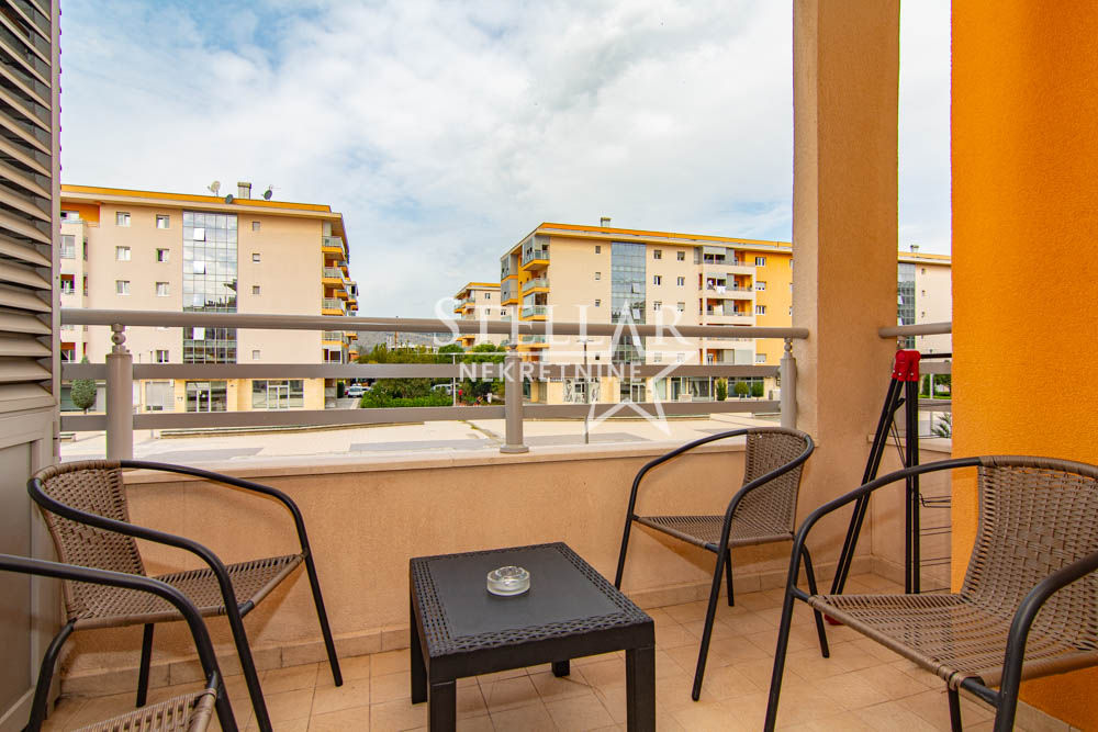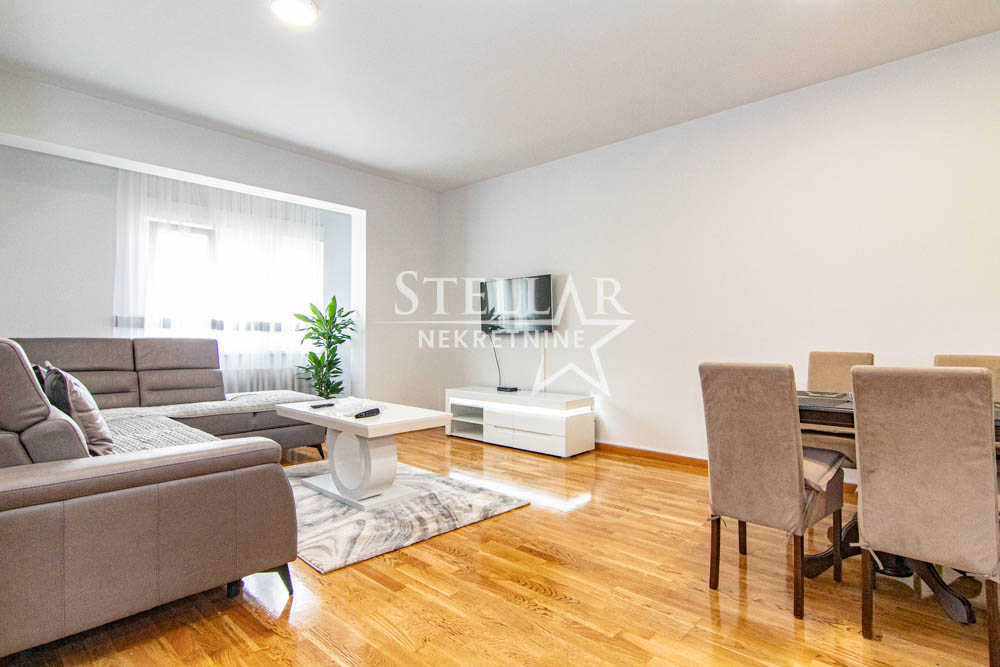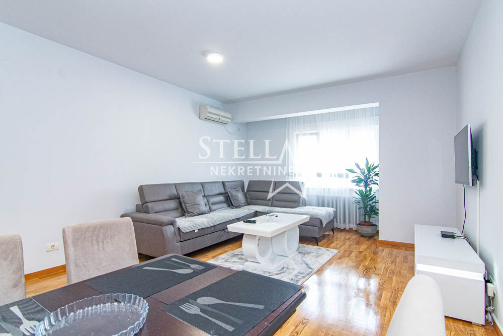 Izdaje se prelijepo namješten jednosoban stan na prvom spratu novije zgrade u Siti kvartu. Stan ima 56m2, u stanu je sve novo osim kuhinje koja je stara nekih 10ak godina. Spavaća soba ima francuski krevet, ormar, i ima izlaz na balkon. Orijentacija stana je sjevero-zapadna, a balkon gleda na dvorišnu stranu zgrade. U dnevnoj sobi je klima uređaj.