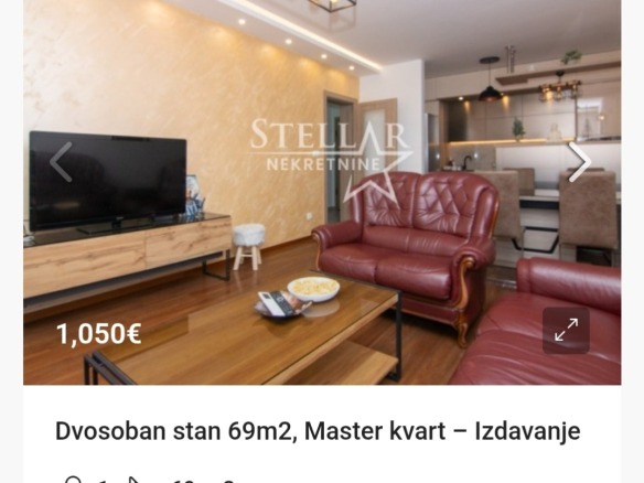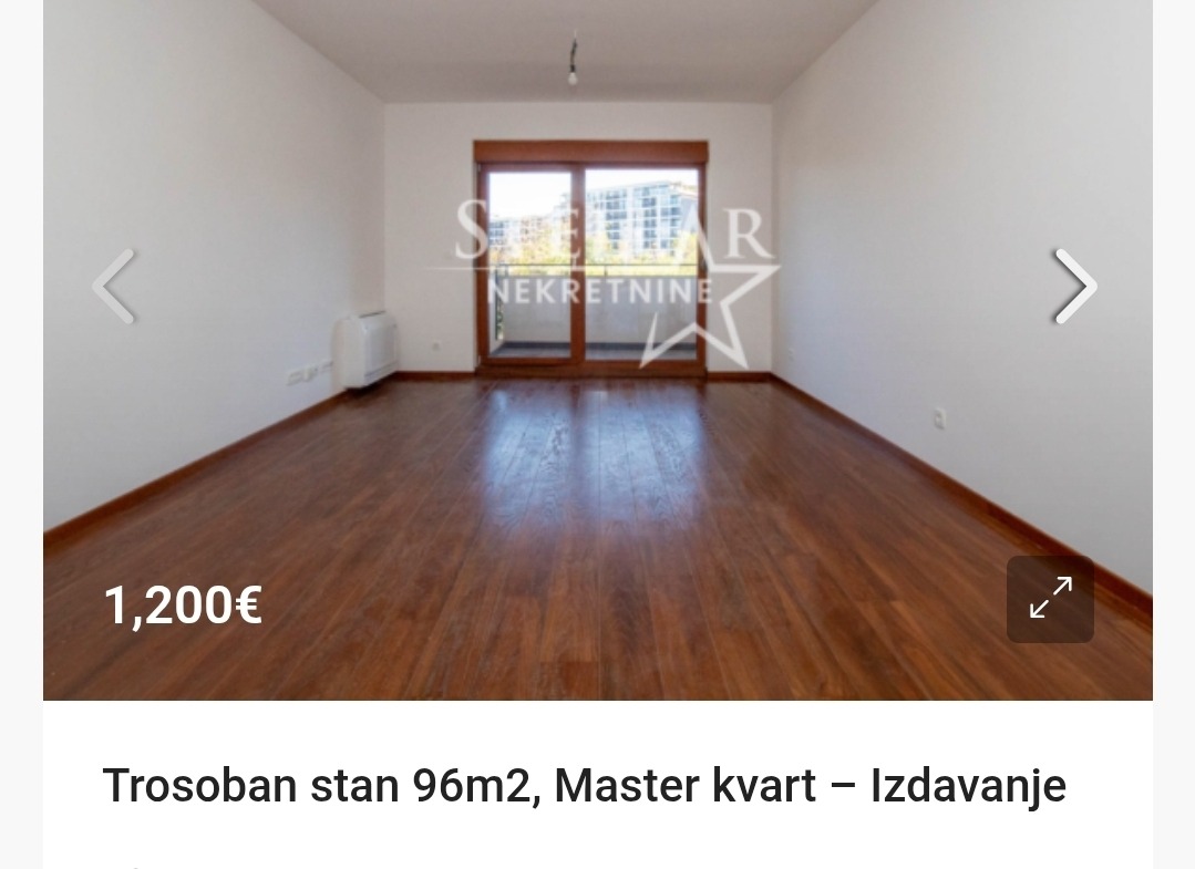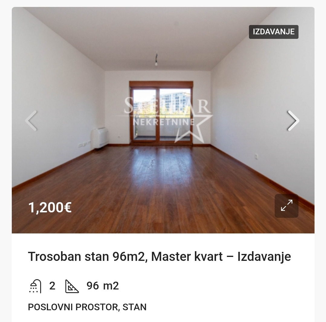 - Izdaje se trosoban nenamješten stan u Master kvartu. Stan je površine 96m2, a nalazi se na prvom spratu u veoma lijepom ulazu, što može biti važno nekom ko bi stan koristio u poslovne svrhe. Stan se idaje sa kuhinjom i klimatizacijom.